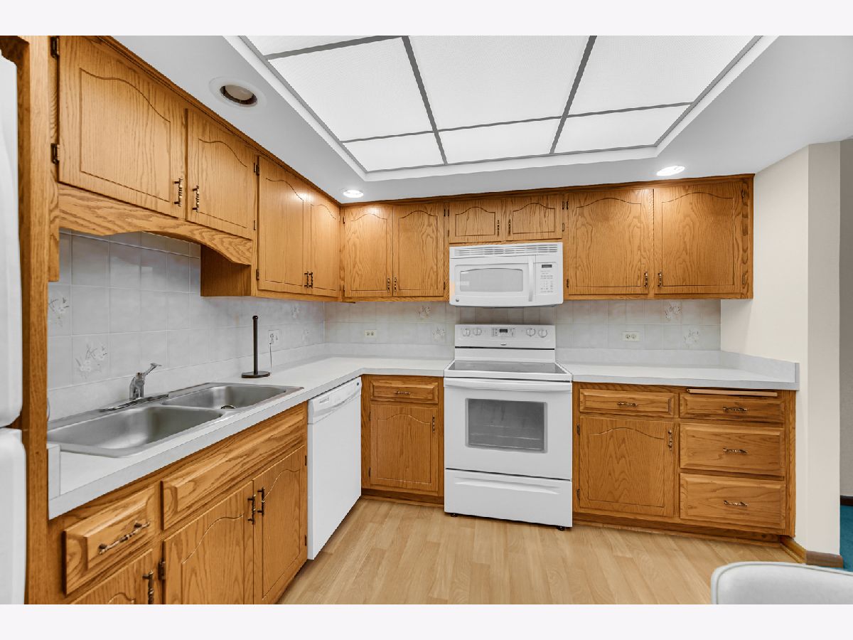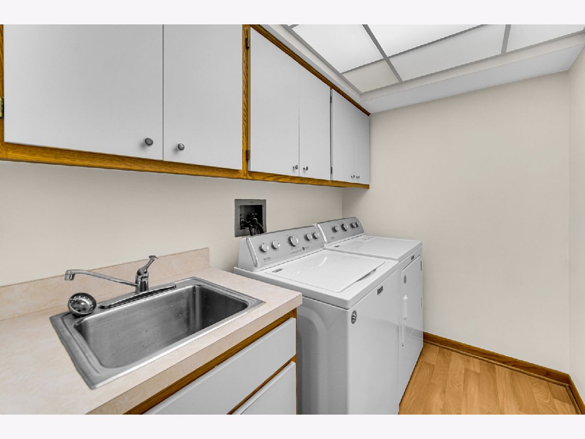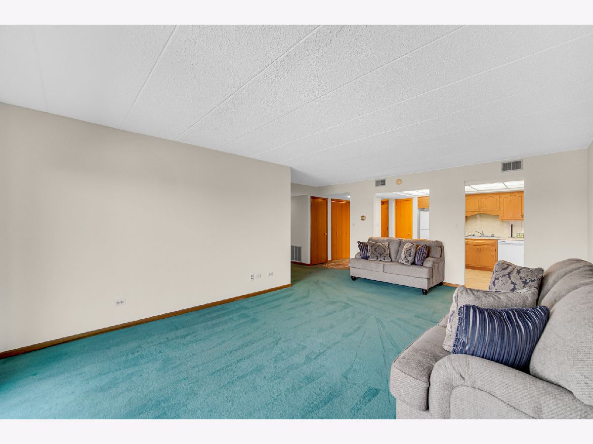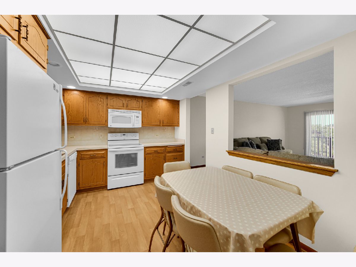 Lovely one bedroom 5th floor condo with eastern exposure with long balcony off of both living room and bedroom. Conveniently positioned across from elevator. Large Bedroom has two closets, one walk in. Nearly 900 square feet of living space. In unit full size washer and dryer in spacious laundry room which includes sink. TWO parking spaces, one in the garage (#3) and another in designated outside parking spot (#1). Large secured storage unit (#2) on 2nd floor. Unit is excellently maintained. Quick close possible. All owner occupied. Professionally managed. Close to library, METRA/PACE station, bakery theatre, grocery store. Easily accessible to 294/90.