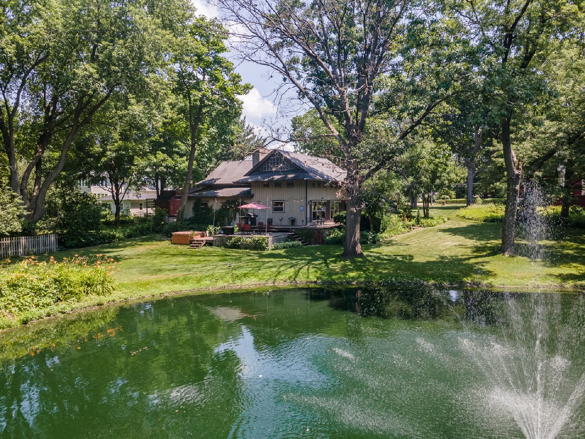 Beautifully rebuilt historic carriage house with a Modern Mid Century flair nestled on approximately 1 acre with a breathtaking pond setting! Don't miss this wonderful opportunity to own this stunning home located on prestigious Somonauk Street in the heart of Sycamore. The main level showcases an open concept kitchen, living room & dining room. Perfect floor plan for entertaining family & friends when hosting holiday dinners & special occasions. The kitchen is equipped with an island that includes space for counter seating & pendant lighting, recessed lighting, all stainless steel appliances, solid 4" countertops and Italian ceramic tile flooring. The living room boasts a grand wood burning masonry fireplace with a separate bricked area for stacking logs, wood beamed ceiling & plenty of windows that let in the natural light & offer outstanding views. The spacious dining room showcases original solid wood sliding barn door, Tiffany chandelier & floor to ceiling windows. The master suite with full bath is located down a quiet hallway. Beautiful views of the courtyard can be enjoyed from the master bedroom. You will be pleasantly delighted when you take the stairs up to the 2nd level & discover what the expansive multi purpose area has to offer. Plenty of space for a game room or home theatre, studio or home office & family room with 2nd masonry fireplace. Featuring solid wood walls, tongue & grove ceilings, abundance of windows which include original wood barn doors that open & storage bench cubbies that add extra seating. The possibilities are endless! 2 additional bedrooms & a full bath complete the main home. Above the attached 3 car garage is an apartment suite with 2 bedrooms and a full bath. Step outside through the sliding door to the balcony overlooking the pond & yard. Ideal living quarters for an in-law or family member. You will surely enjoy relaxing in the courtyard or out back on the 2 tier deck as these serene spots could become a favorite destination of your day. This extra special home is located on the annual Sycamore Pumpkin Festival Parade route. Downtown Sycamore is just a few short blocks away. Estimated total lot size is 1 acre combining house parcel & 2 pond parcels. Call today for your private showing!