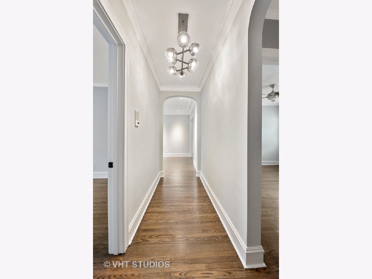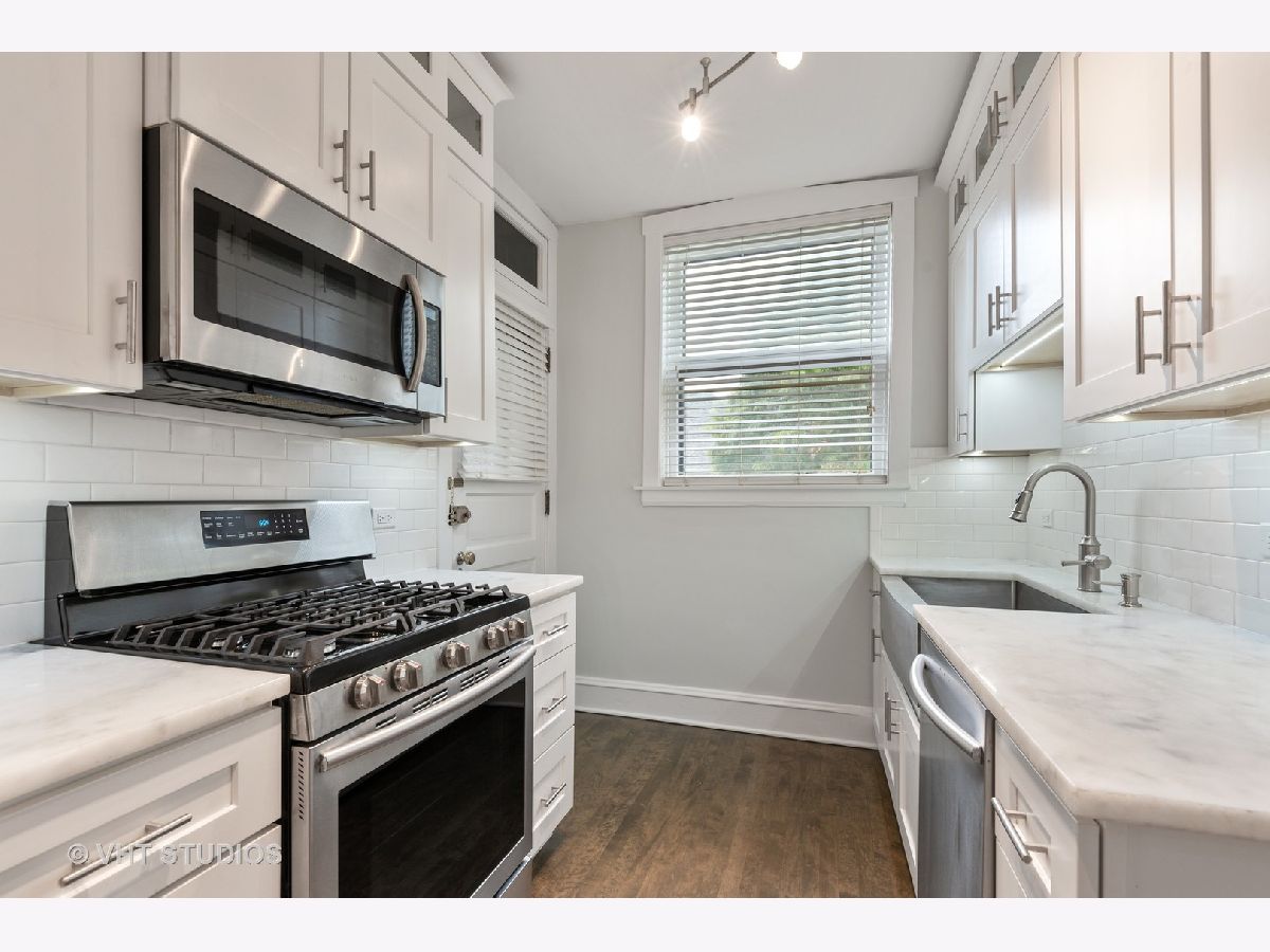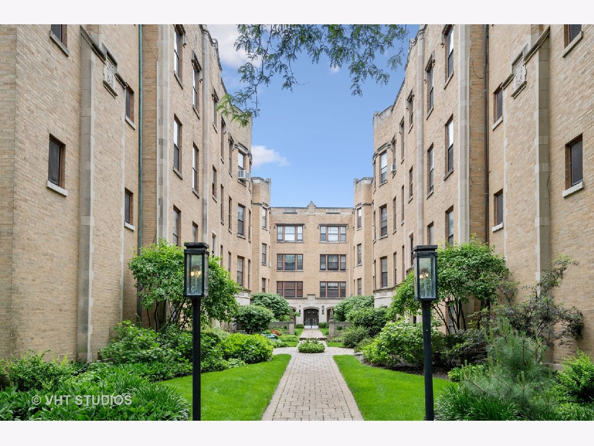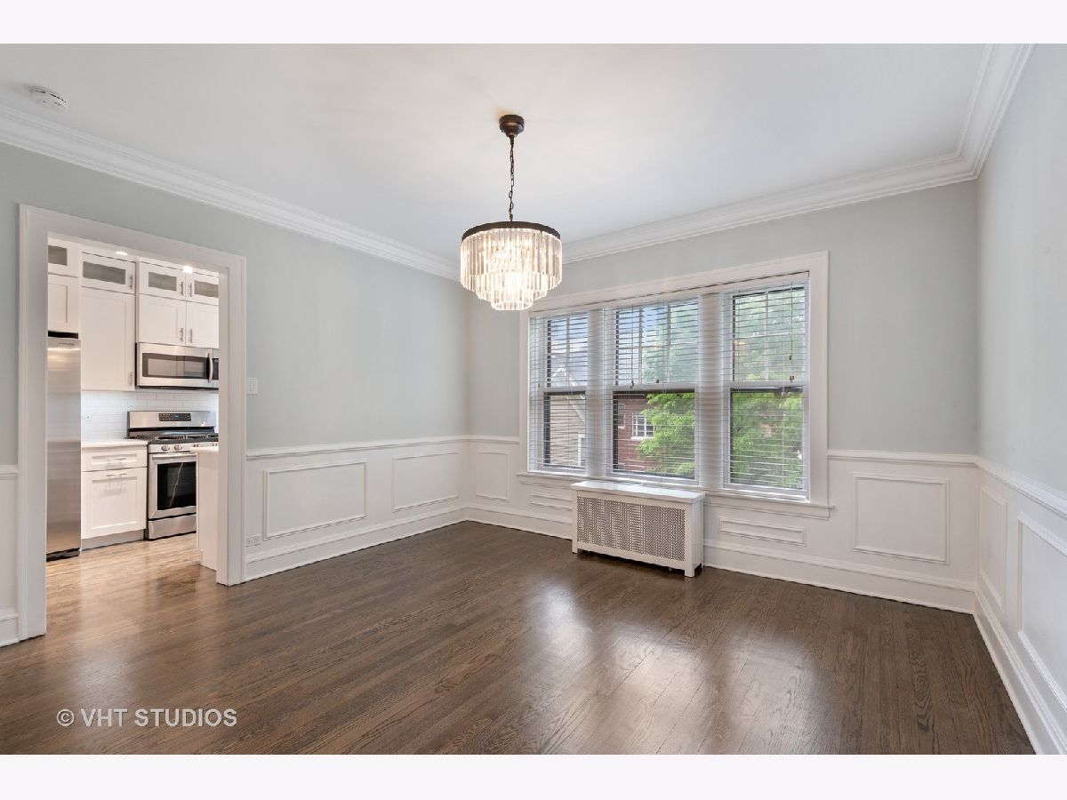 This beautifully updated vintage condo is nestled in an ideal SE Evanston location. Amazing space and layout, this light-filled unit features gorgeous renovations throughout while maintaining its classic integrity. Enter into a striking foyer with dramatic gallery and arched details. The sizeable living room overlooks a lovely, professionally landscaped courtyard. Attractive crown and picture moldings are highlighted in the large, separate dining room. The completely remodeled kitchen was spared no expense with soft-close white shaker cabinets, quartz counters, farmhouse sink and stainless steel appliances. The primary bedroom leads into a stunning rehabbed bath with marble floors, porcelain tiles, striking new vanity and walk-in shower. The secondary bath was also remodeled and features the same superior finishes. Restored hardwood floors and freshly painted throughout. All new lighting on dimmers to select for that perfect mood. In-unit front loader washer and dryer and heated, garage parking round out this impeccable space. Walking distance to the lake, Main Street shops, cafes and public transportation. A true A+ and move-in ready!