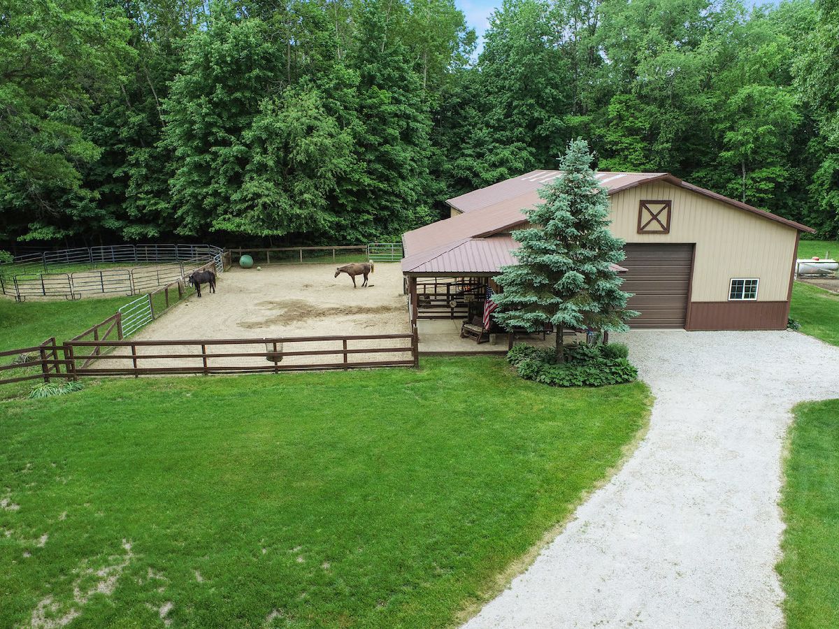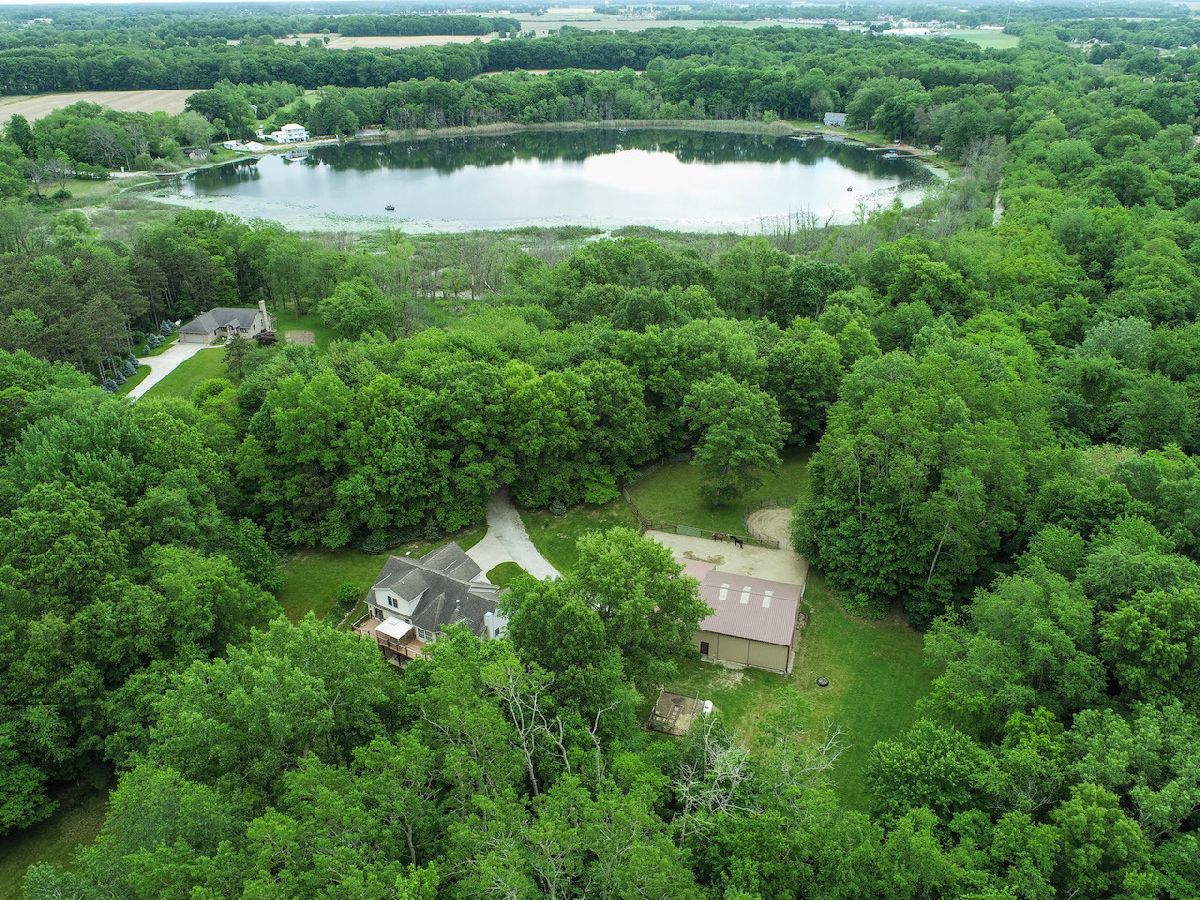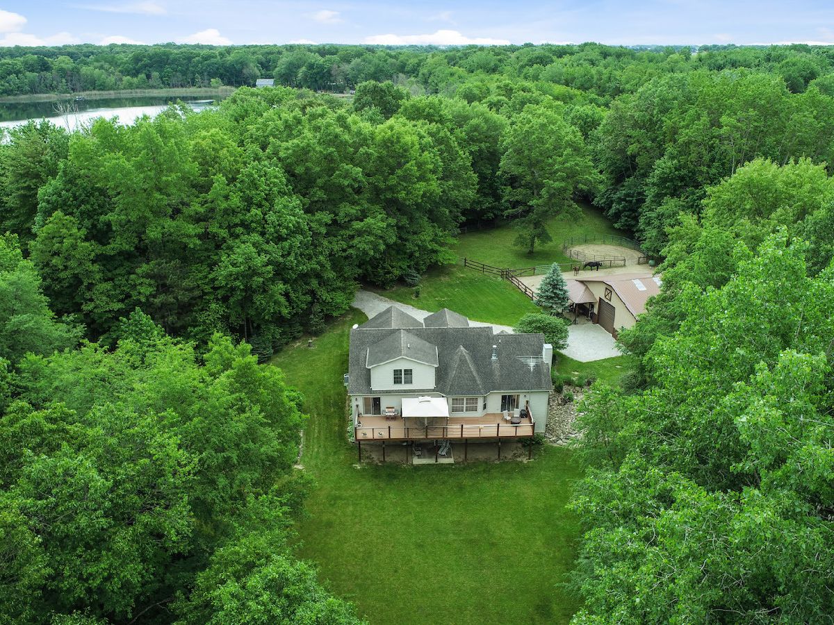 Easily the best of ALL worlds: a great home AND great horse property; nestled in a secluded setting YET near everything! 2004 custom-build home on 8+acre with open main level living, vaulted ceilings, fireplace, upgraded kitchen (ss apps, granite counters, soft-close hickory cabs, grouted vinyl floors, kitchen nook, pantry), primary bedroom suite with fireplace and sliding door to full rear deck. Main floor also includes dining room (flex room), 1/2 bath, large mudroom off 2+ car garage, and laundry room. 2nd floor boasts 2 add'l bedrooms plus full bath. Full walkout basement with 9.5ft ceilings awaits your vision: rough-in for add'l bathroom, possible fireplace, plenty of space. 70' x 40' 2-stall horse barn with direct access to paddock, round pen, and 12' overhang, double loft, tack room, 2 large overhead doors. Plenty of outdoor space including riding trails. Porter Cty, Duneland schools. Near Michigan City, Valparaiso, Chesterton, and easy access to highways for access to/from Chicago. view drone footage for overview of this must-have property!
