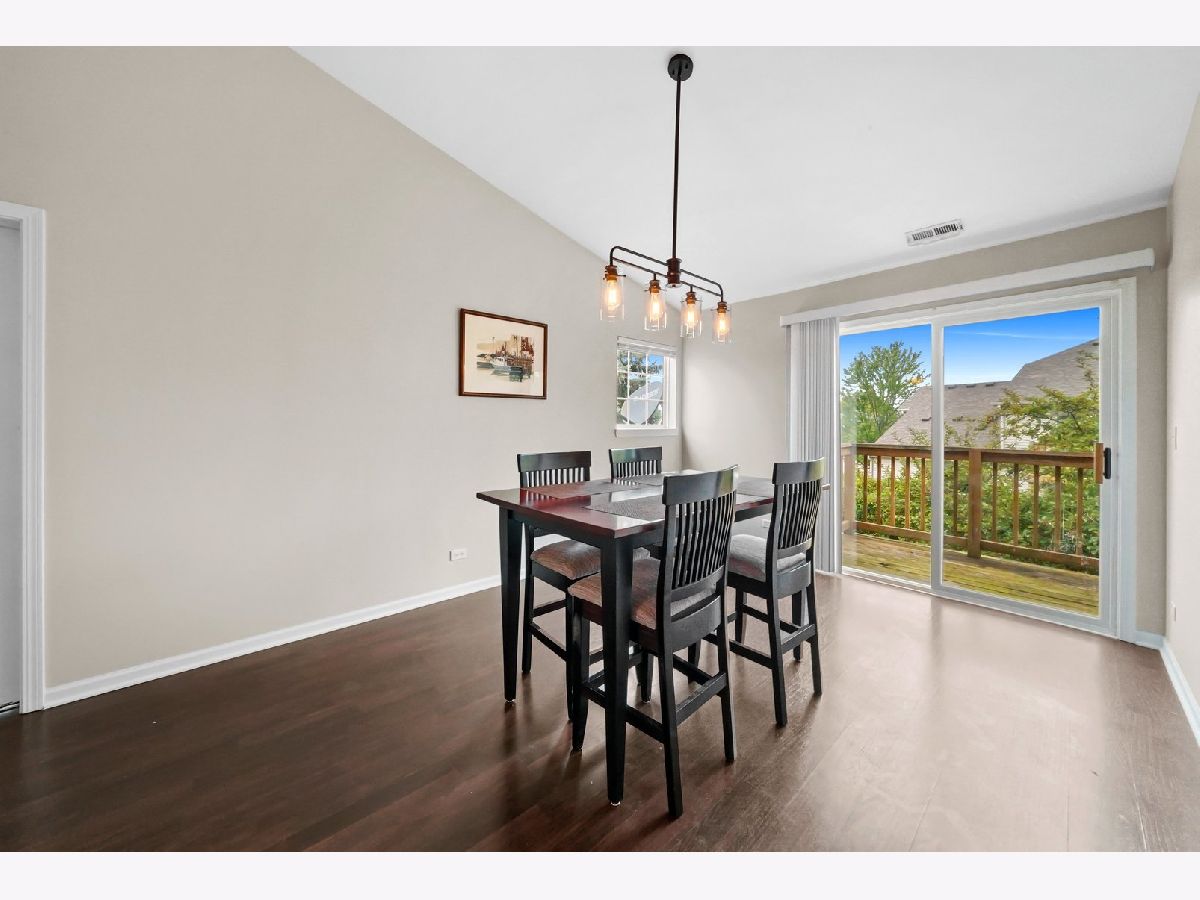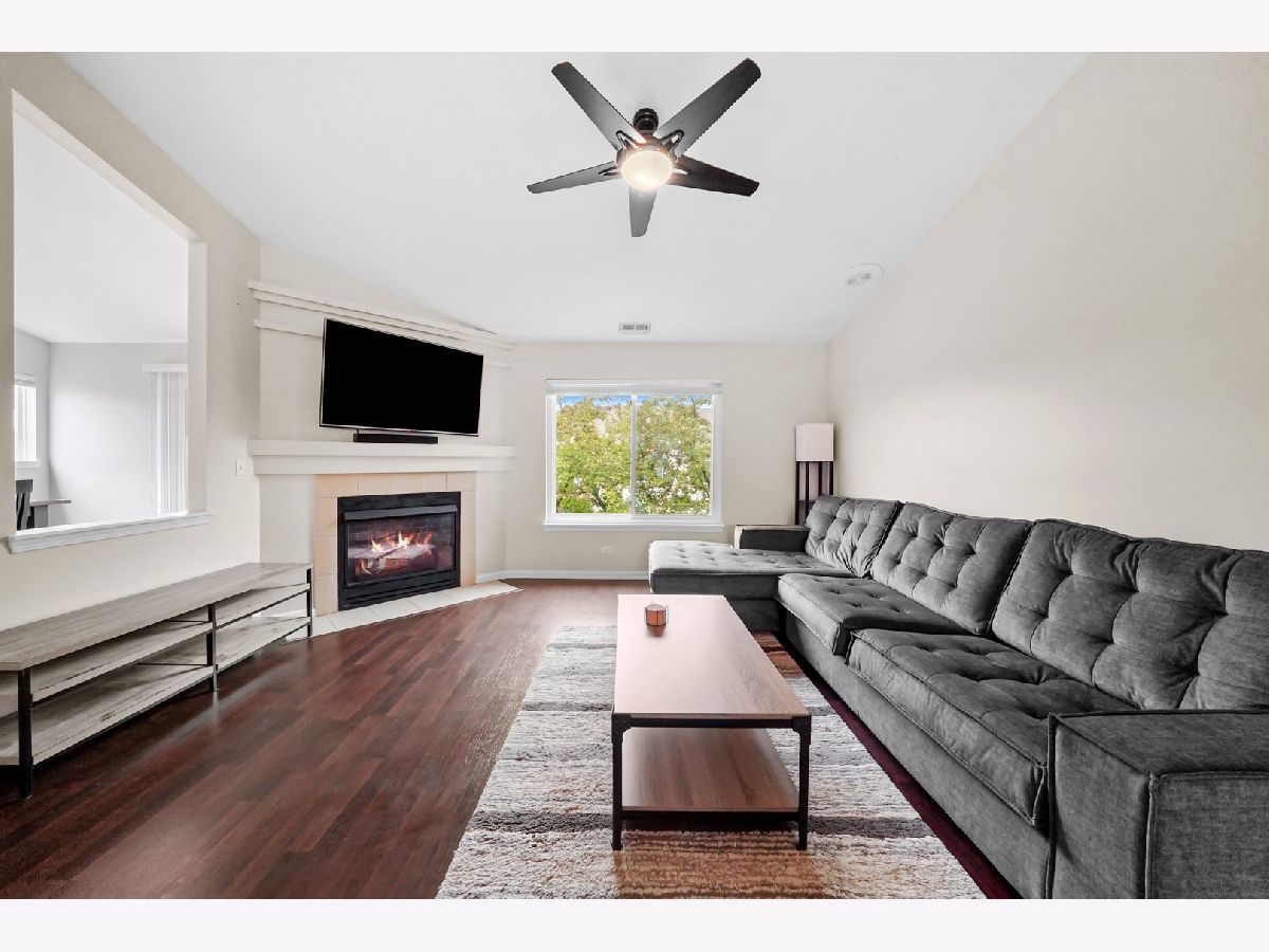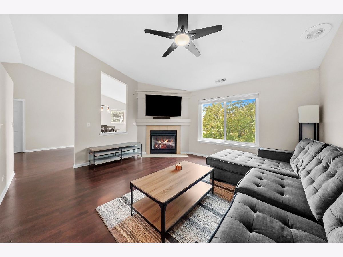 Gorgeous and turn-key townhome in the fantastic Woodlands of Oakhurst Subdivision! This cozy home features 3 bedrooms, 2 bathrooms and an attractive open concept floor plan. Up the stairs, you're greeted by the great room with vaulted ceilings, wood laminate flooring, gas fireplace and an abundance of natural light. The spacious kitchen boasts plenty of cabinet space, closet pantry, stainless steel appliances and opens into the dining room with new modern light fixture and sliding glass doors that lead onto the balcony - perfect for grilling. Primary Bedroom also offers vaulted ceilings as well as walk in closet with organizers and Primary Bath with tub and separate shower. Additional two rooms are perfect for bedrooms or home office. Main floor laundry room. Private entry with access to 2 car garage. Just steps away from pool/clubhouse and minutes from I88, Metra, park, shopping and much more.