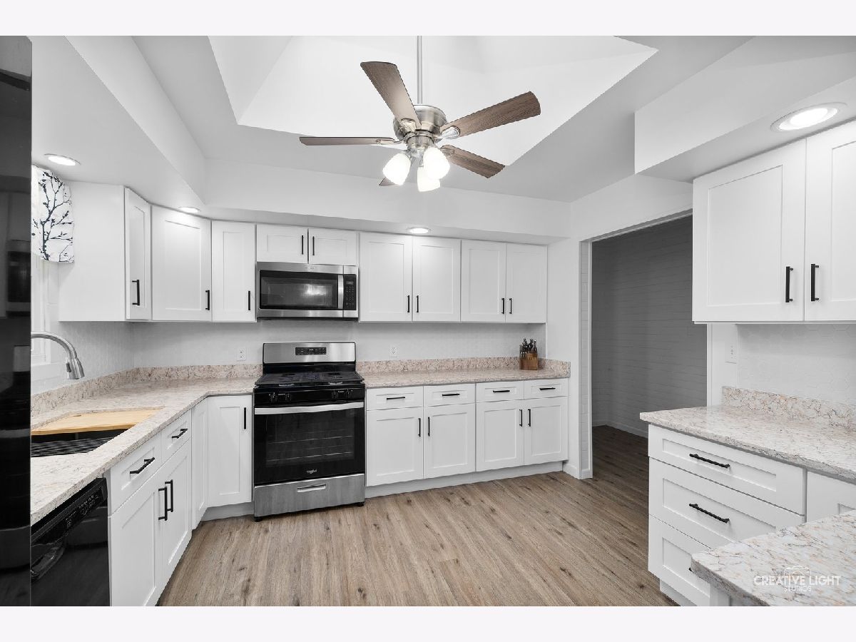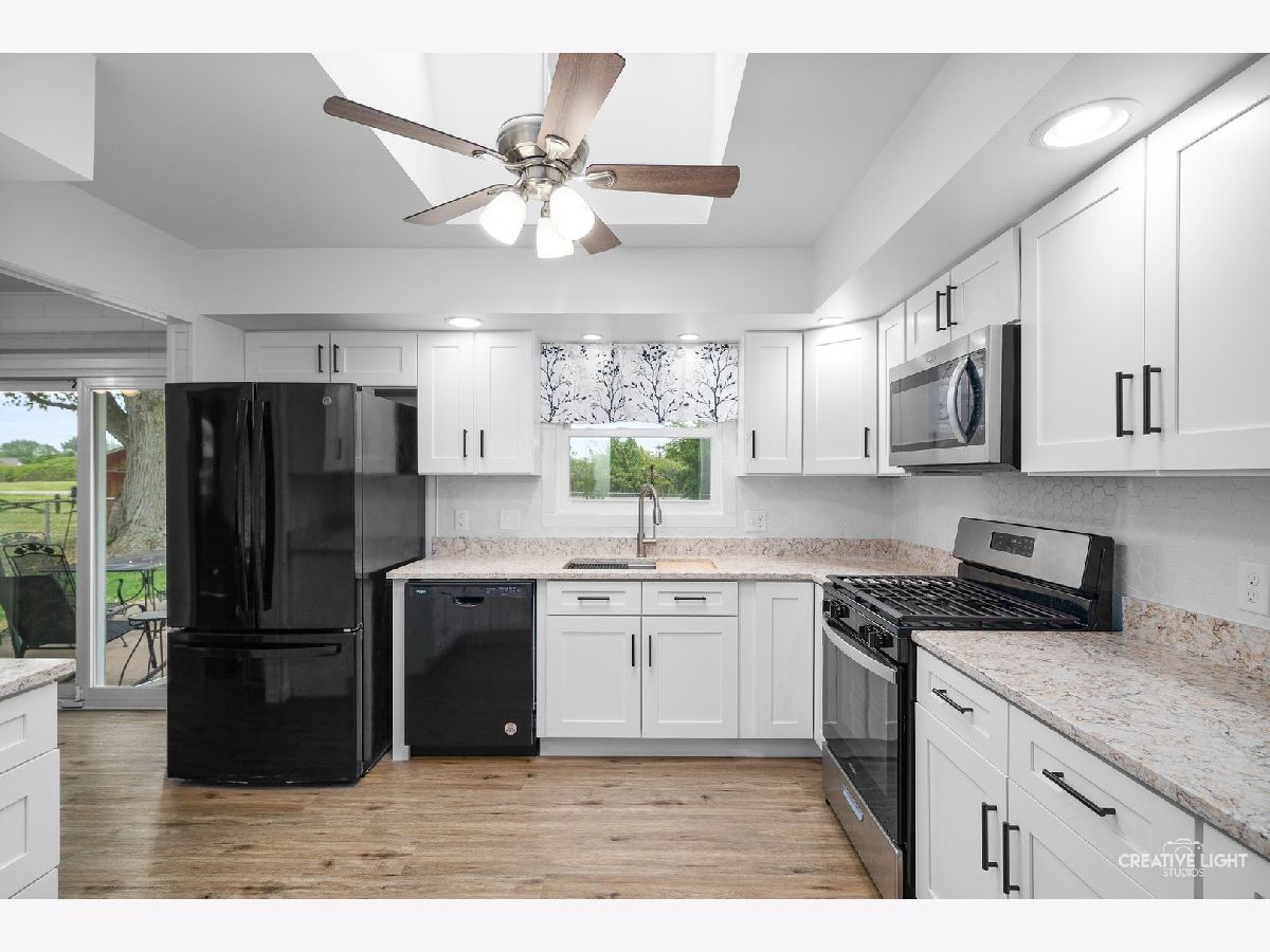 A Rare Find - Fully Updated Home with possible In-Law Suite or use as a wonderful space in lower level. You'll be amazed by all the updates in this beautifully renovated home! Step through the brand-new front door into a stunning entryway featuring white wood tile walls and a wide staircase leading to the main level. The home boasts new wood laminate flooring throughout and a bright, modern kitchen complete with white soft-close cabinets, granite countertops, and all-new stainless steel appliances. Skylights flood the space with natural light, creating an open and airy feel. Down the spacious hallways, you'll find four generously sized bedrooms and a fully updated bathroom with a new tub and modern fixtures. Step through the new sliding glass doors to a lovely patio and a freshly fenced backyard-perfect for relaxing or entertaining. Two large sheds provide ample storage space. The fully finished lower level is a versatile space, currently set up as an in-law arrangement. It features a wet bar, a second full bathroom, a large laundry area, and plenty of room for living or recreation. Major updates include: Roof- 6 years old, Furnace 3 years old, windows 3 years old, water heater 2 years old Front door and slider door 2 years new. Ceiling fans all new and kitchen new!! All the electric has been updated also. Nothing to do but move in. Across the street from a park and backs up to nothing!! Close to shopping and tollways!! Come see today!!