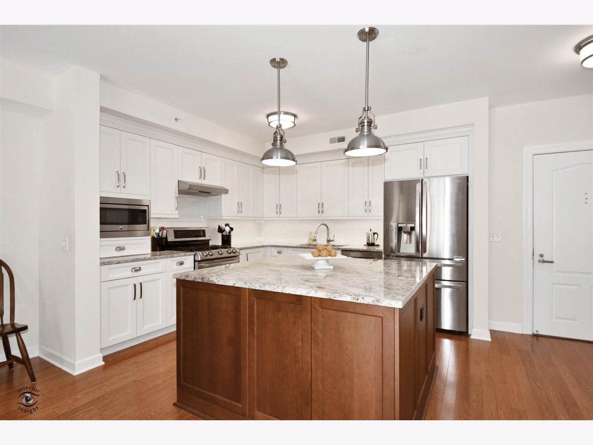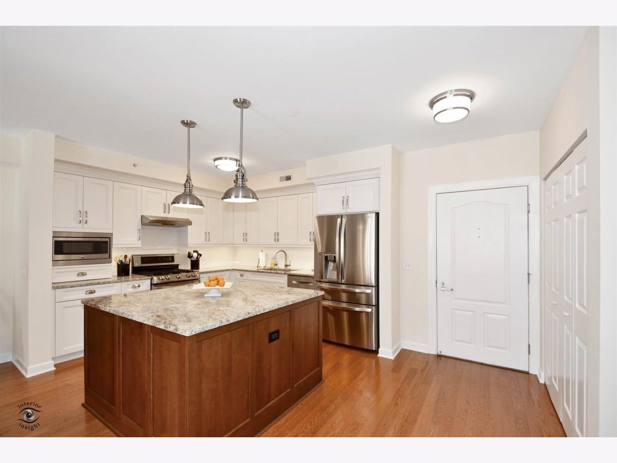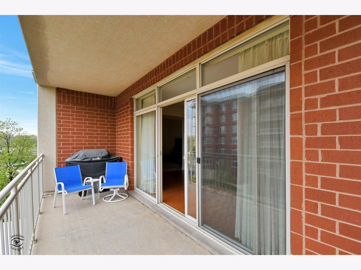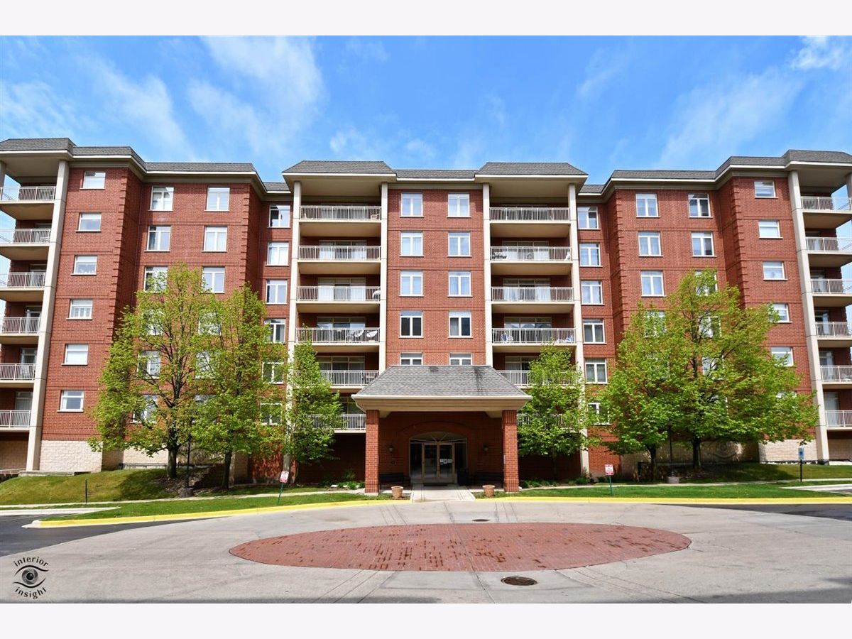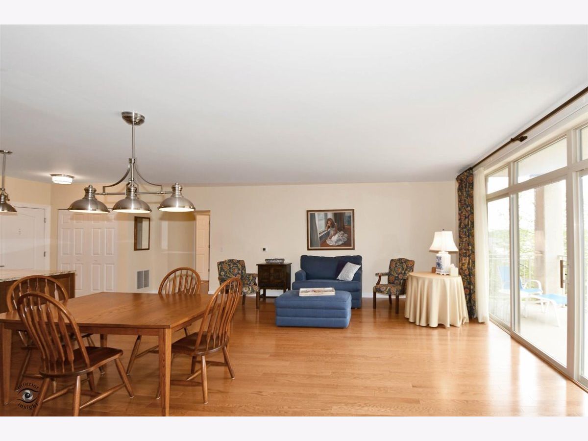 Rarely-available 2 bedroom plus den, 2 bath at The Woodlands of Morton Grove. (Not on train side of the building.) Bonus-private (appx 12 x 6) storage room on same floor. Gorgeous kitchen remodel 2015-16. Beautiful heated hardwood floors (floating) in kitchen, living and dining rooms and hallway. Kitchen boasts rich dark wood granite island with storage, contrasted with white cabinetry, also with granite counters. Extra-large swing out lazy susan for small appliances, pull-out garbage container. All stainless steel appliances: Bosch dishwasher, LG refrigerator, LG 5-burner oven/range, Zephyr exhaust fan & GE microwave. Lovely custom lighting (dining room fixture on dimmer) & subway tile backsplash. Living room with south-facing balcony. Den opens off living room with duet blinds. Front hall closet houses furnace and a/c - 3 years. Bedroom 2 with ceiling fan/light and walk-in closet with wire organizers. Hall bath with pedestal sink, tub/shower. Master suite features walk-in closet, duet blinds, ceiling fan and bath with separate shower and linen closet. Laundry room with 2020 GE washer/dryer, wash sink & cabinets. Garage space on lower level of 2 tier heated garage. Second large storage space adjacent. Garage also has a car wash stall. A truly beautiful condo.