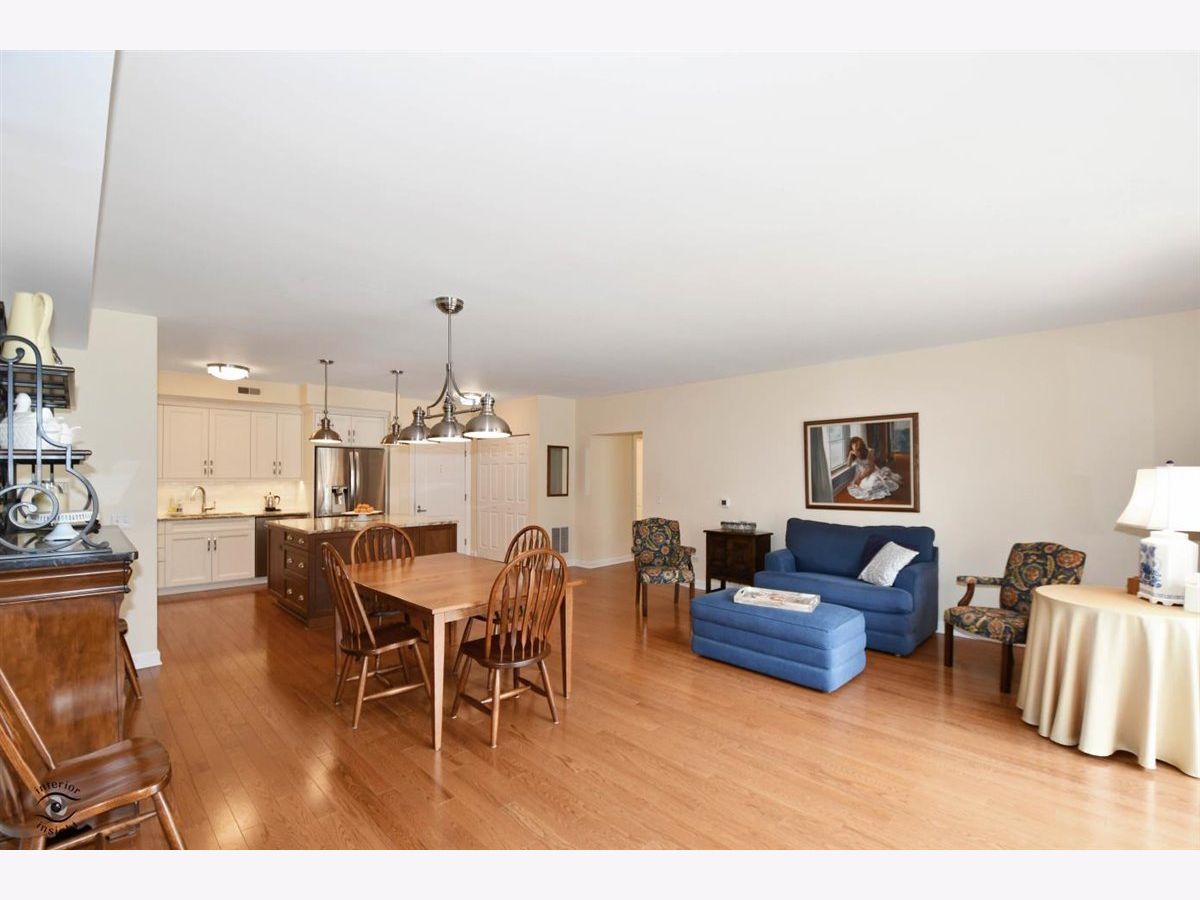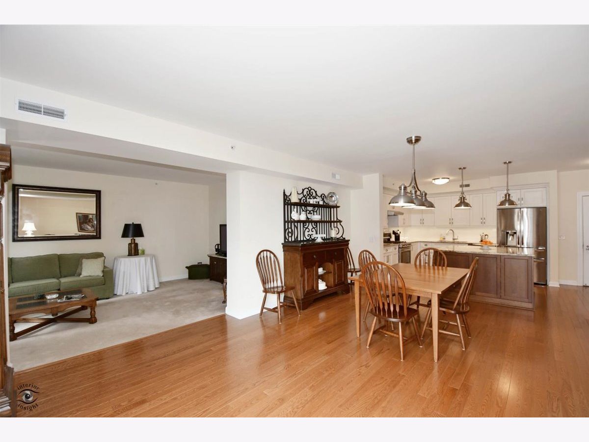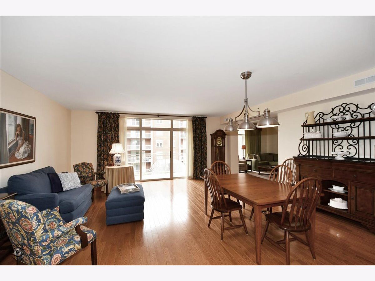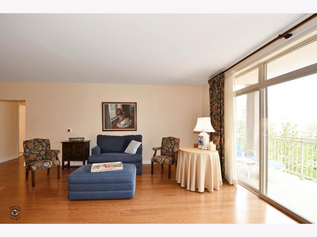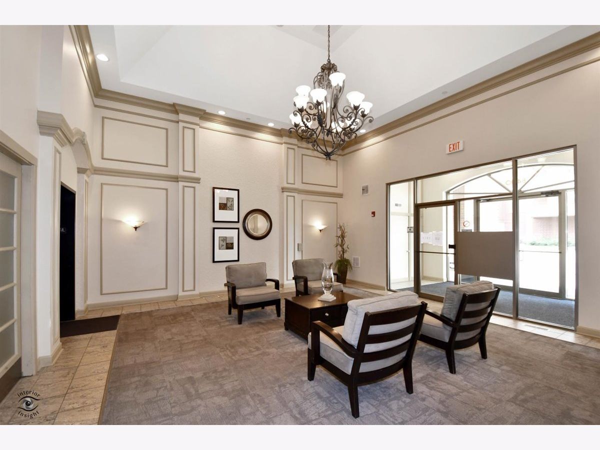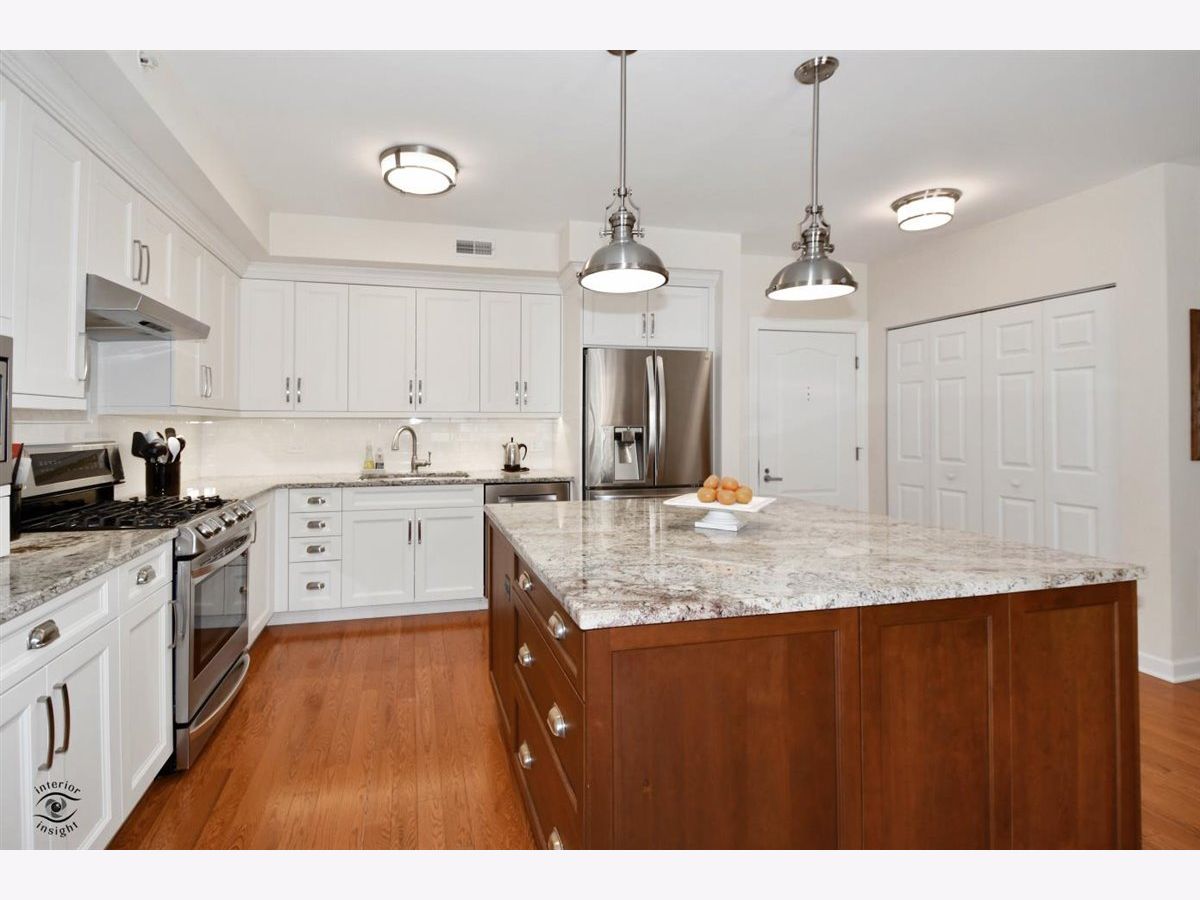 Rarely-available 2 bedroom plus den, 2 bath at The Woodlands of Morton Grove. (Not on train side of the building.) Bonus-private (appx 12 x 6) storage room on same floor. Gorgeous kitchen remodel 2015-16. Beautiful heated hardwood floors (floating) in kitchen, living and dining rooms and hallway. Kitchen boasts rich dark wood granite island with storage, contrasted with white cabinetry, also with granite counters. Extra-large swing out lazy susan for small appliances, pull-out garbage container. All stainless steel appliances: Bosch dishwasher, LG refrigerator, LG 5-burner oven/range, Zephyr exhaust fan & GE microwave. Lovely custom lighting (dining room fixture on dimmer) & subway tile backsplash. Living room with south-facing balcony. Den opens off living room with duet blinds. Front hall closet houses furnace and a/c - 3 years. Bedroom 2 with ceiling fan/light and walk-in closet with wire organizers. Hall bath with pedestal sink, tub/shower. Master suite features walk-in closet, duet blinds, ceiling fan and bath with separate shower and linen closet. Laundry room with 2020 GE washer/dryer, wash sink & cabinets. Garage space on lower level of 2 tier heated garage. Second large storage space adjacent. Garage also has a car wash stall. A truly beautiful condo.