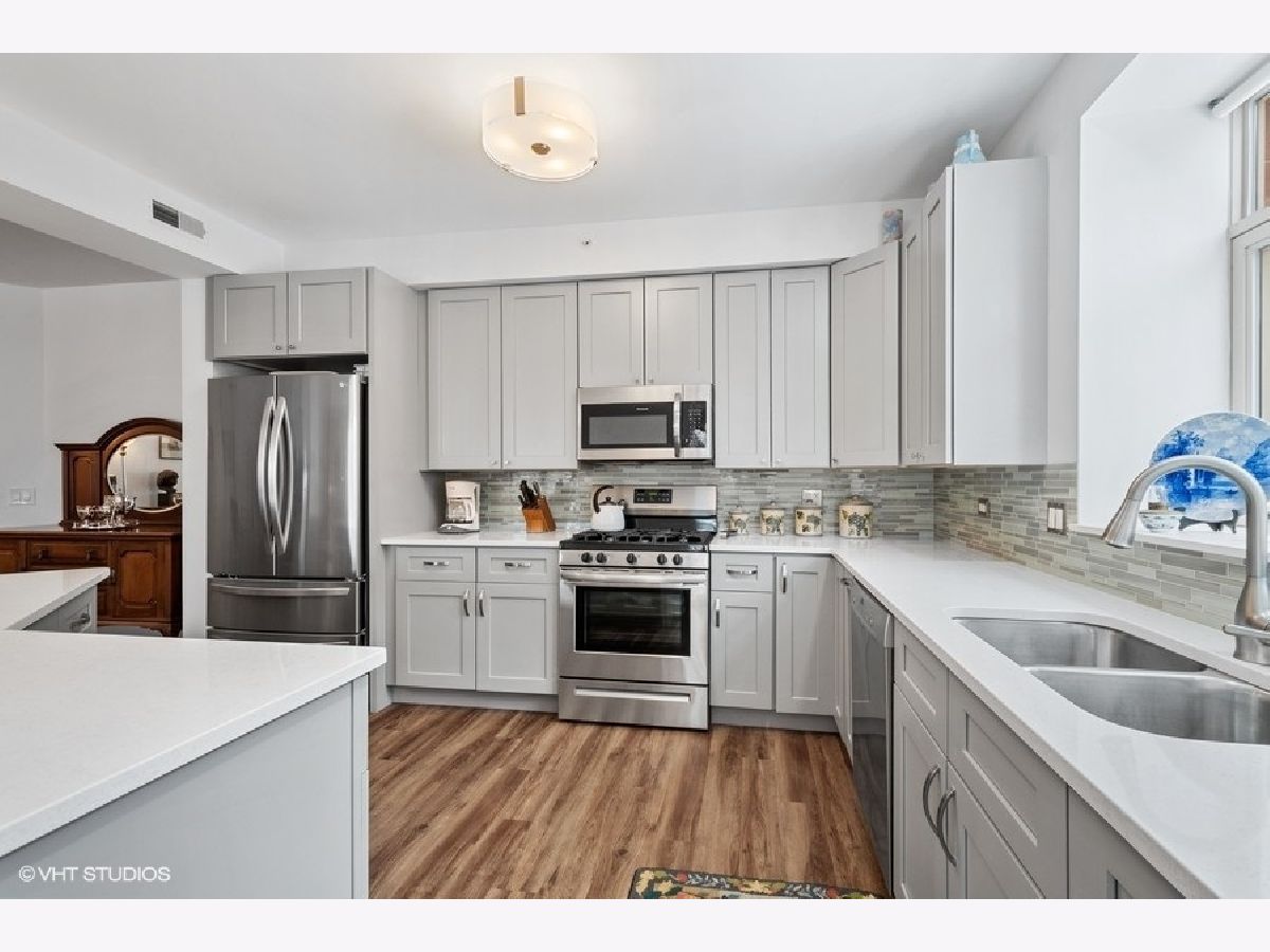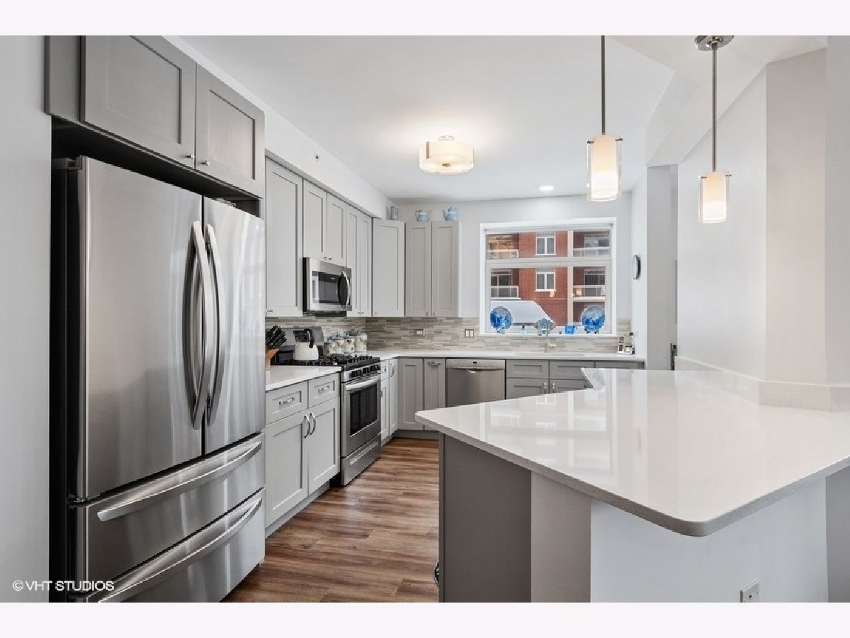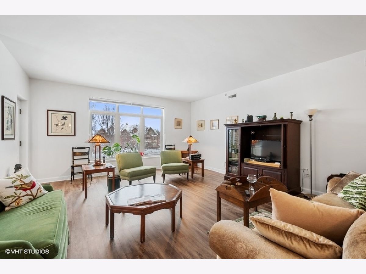 Welcome to the Woodlands of Morton Grove. Original owner unit. In 2021 the unit was rehabbed except the two bathrooms. Kitchen features all SS appliances and quartz countertops. A window over the sink. Open concept kitchen, dining, and living room. The primary bedroom has two walk in closets .There is a balcony is off the living room. The split floor plan offers more privacy for the second bedroom and bathroom. A second balcony is found off the second bedroom. Full laundry room with side by side appliances and a utility sink. The air conditioner was replaced 5 years ago. Garage space is #91 and the storage unit is right in front of the parking space #91 and is huge. 10 x 10 at least plus a high ceiling. A well managed complex. Transportation, restaurants and shopping close by.