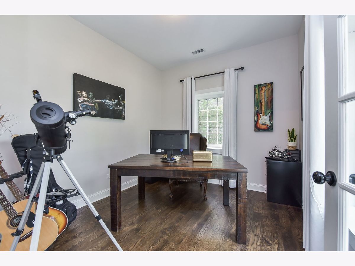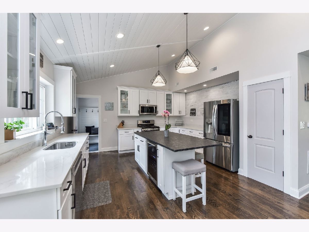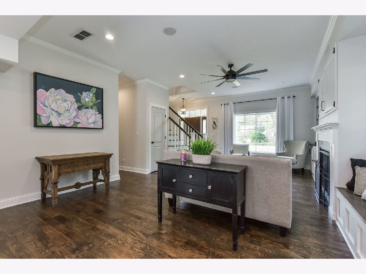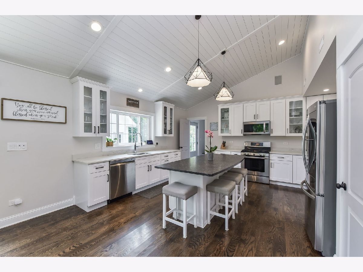 This beautiful two-story home was rebuilt in 2019 and features stunning finishes and craftsmanship throughout. The rich hardwood floors begin in the spacious, welcoming foyer. To your right is a private office with large window, and the family room opens up to the left. Built-in cabinetry and benches flank the gas fireplace, and custom doors above the fireplace close-off the television when not in use. The kitchen and dining rooms span the east side of the home, highlighted by 12 foot vaulted wood ceilings. The kitchen features white cabinets, quartz perimeter counters with honed-granite on the island, stainless steel LG appliances, and pendant and recessed lighting. Opening to the dining and family rooms, this layout is perfect for daily living and entertaining. A large glass door opens to the back patio, as does a door from the mudroom. The first level also features the home's fourth bedroom adjacent to a stunning bath with walk-in shower. The private rooms on the second level are all gracious in size and storage. The primary bedroom includes a luxurious ensuite bathroom and a walk-in closet with window. The two secondary bedrooms share the beautiful hall bath, and the laundry room is also conveniently located on the second level. Outside, the yard is this charming as the home itself, with a variety of perennial plants and mature trees. Relax on the private back patio or on the covered front porch. The two-car garage has a full interior staircase and dormers on the second floor, offering excellent storage or ideal for finishing as a private office, workout room, art studio, playroom... wherever your imagination leads. This lovely North Wheaton location is under 1/2 mile to the College Avenue train Station, Wheaton College and the IL Prairie Path, and just one mile to downtown Wheaton's dining, shopping and French Market. District 200 schools.