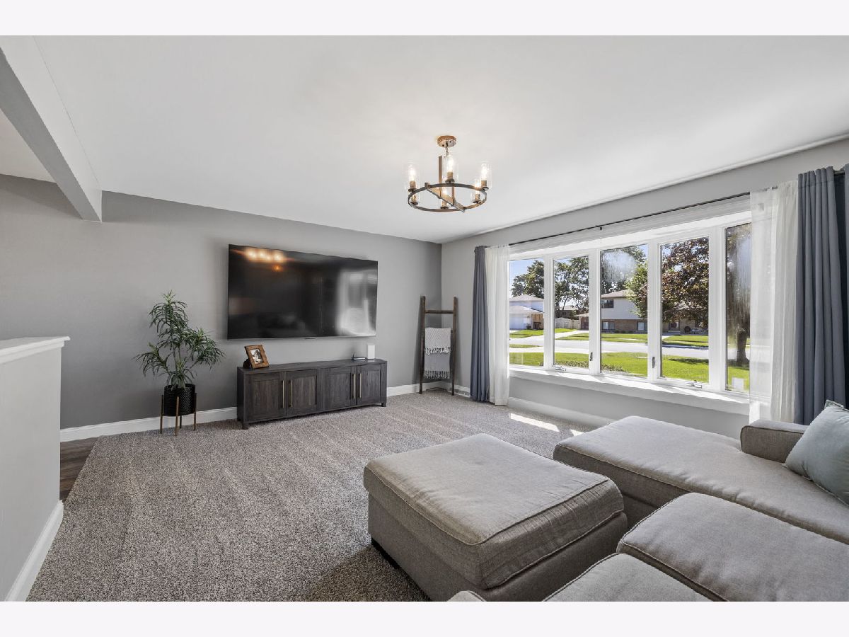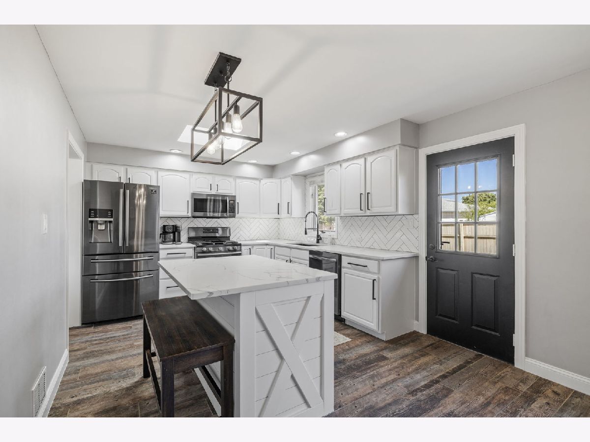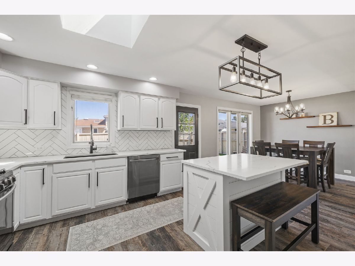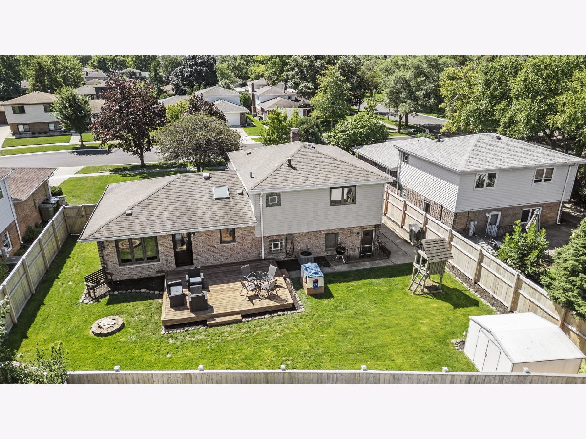 Bright, move-in ready split-level in a prime Tinley Park location with an attached 2-car garage and a fully fenced backyard. Sun-splashed living room with a big picture window opens to an updated eat-in kitchen with skylight, white cabinets, quartz marble-look counters, custom tile backsplash, stainless steel appliances, and island seating. Three comfortable bedrooms up with great closets and a refreshed full bath. The lower level features a spacious family room with an updated stone fireplace and a second full bath, plus a flex room with laundry and exterior access - perfect for a mudroom, home office, or workout space. Outdoor living shines with a brand-new 2025 back deck and the 2024 fence. Major improvements for peace of mind: 2025 new sump pump and new garage opener, 2023 new HVAC system, 2021 kitchen enhancements with quartz counters, updated hardware, wood-look tile, and new carpet throughout. Close to Buedingen Park, schools, shopping, dining, and Metra. Easy living in a central location - just move in and enjoy.