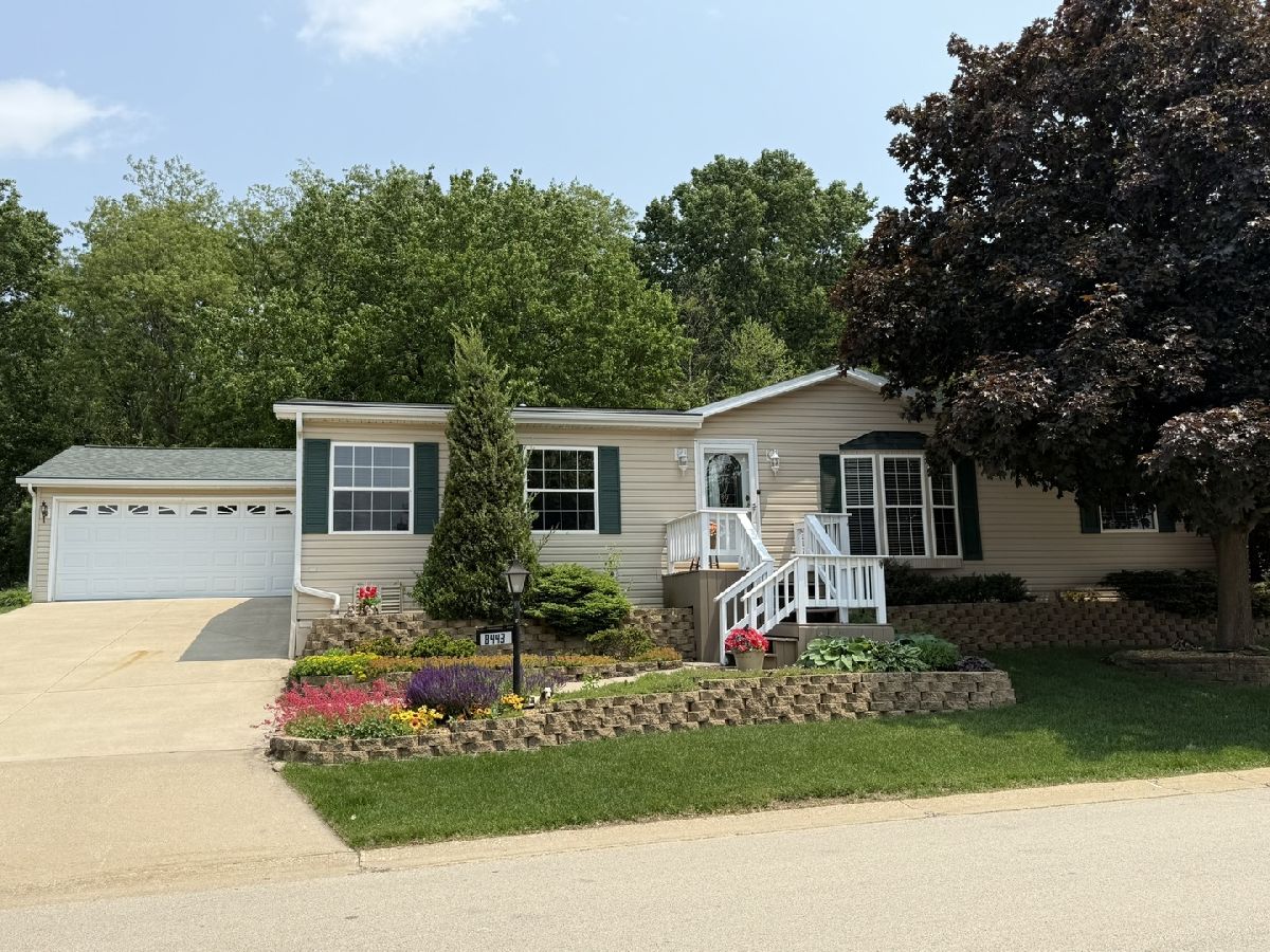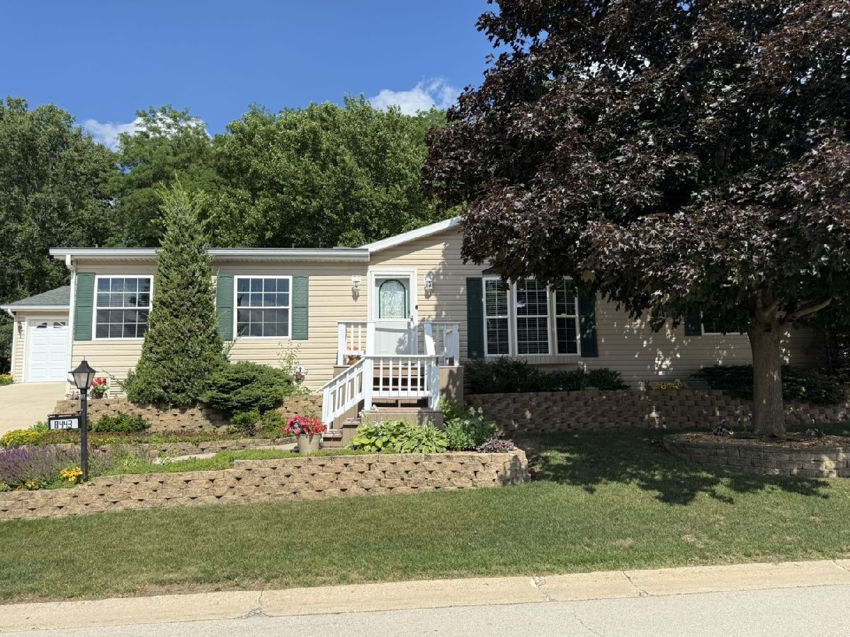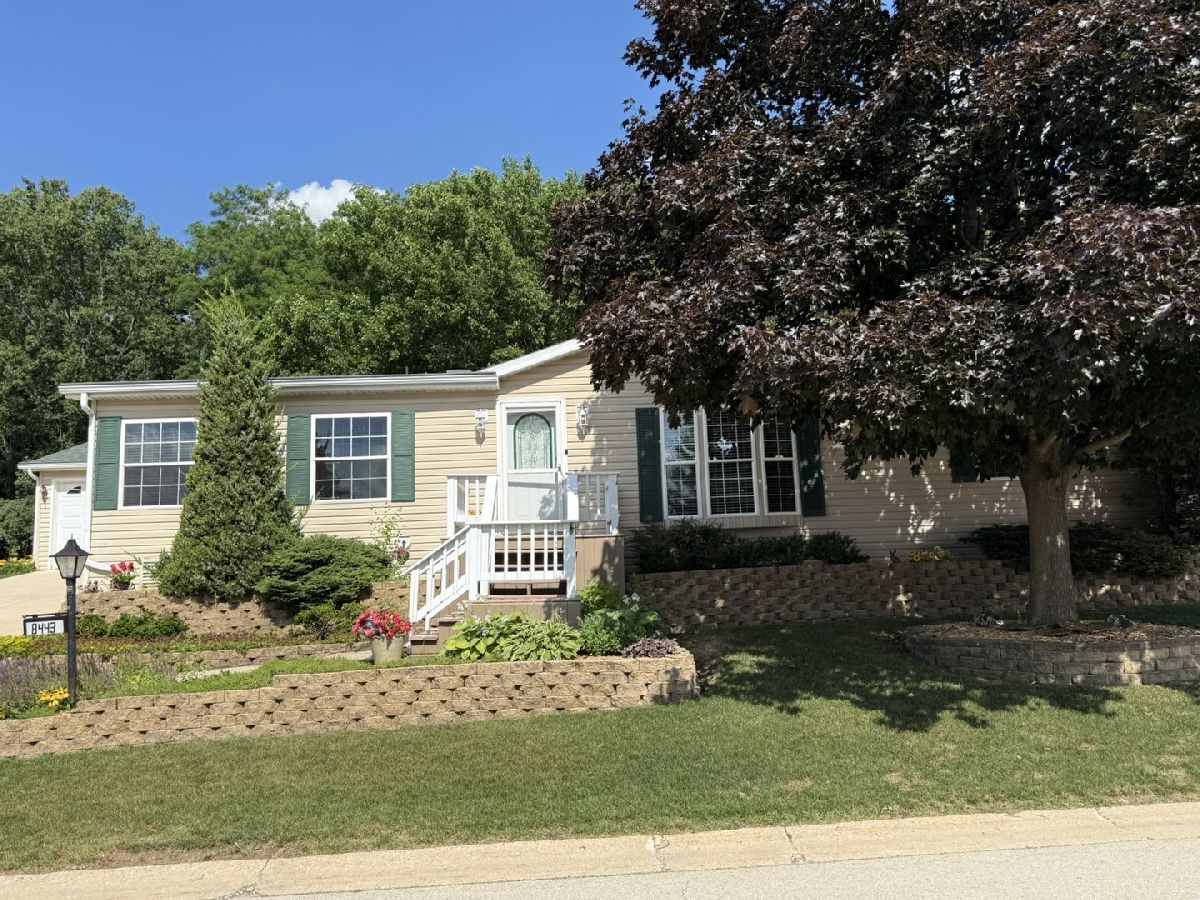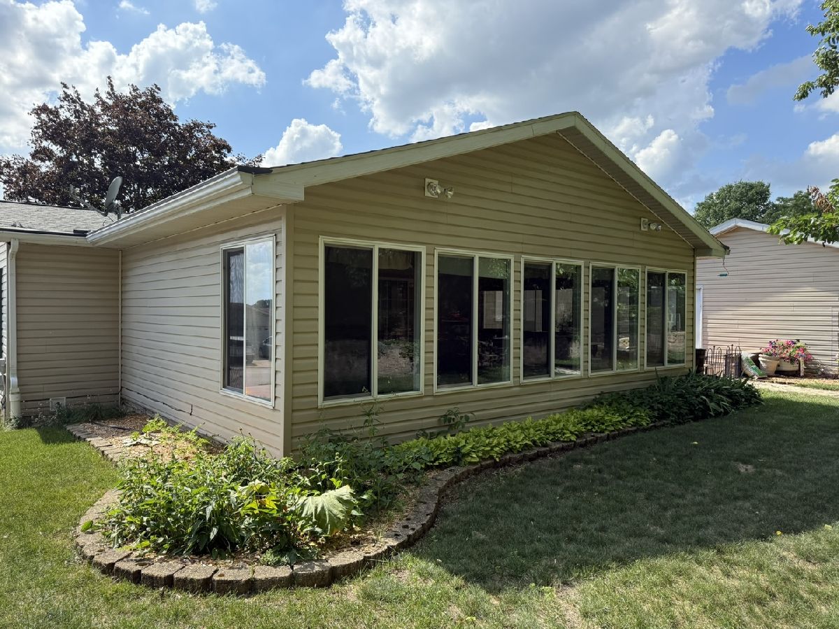 It is all right here!! Split Bedroom floor plan with 3 bedrooms and 2 full baths. Plenty of light with cathedral ceilings and Large 3 season room that walks out onto a shaded Patio and Beautiful Flower Garden. 3 season room also has fireplace so room can be used in winter. All this backs up to Kieselburg Forest Preserve. Completely Private!!. Kitchen boasts of custom built storage inside kitchen cabinets. All new appliances. Large kitchen snack bar. 6 panel doors. Large Master Bedroom Suite with double bowl sinks, whirlpool and large shower in Bath. Skylights in bathrooms and kitchen. Added features are 2nd fireplace in living room, gutter guards and a heated 2 car attached garage. The Lot rent is $755, plus water, sewer, gar