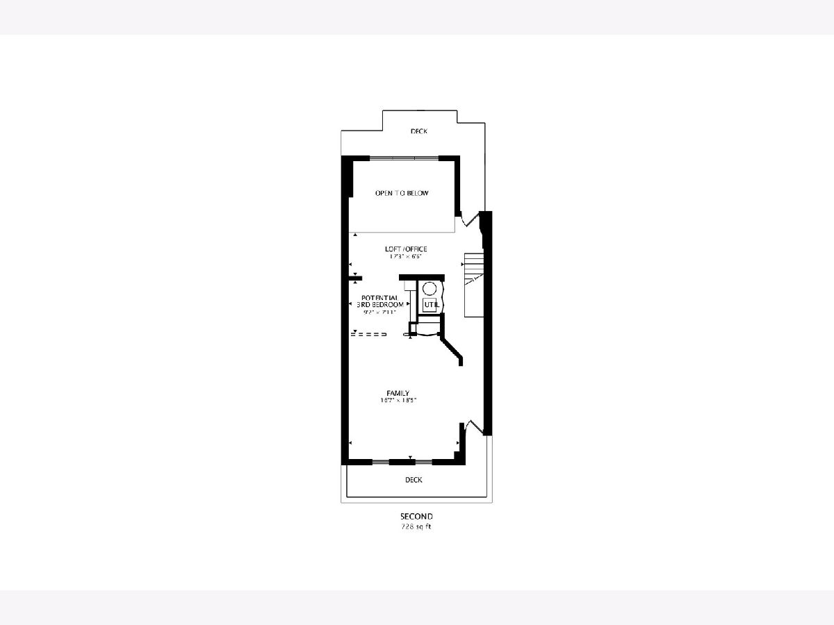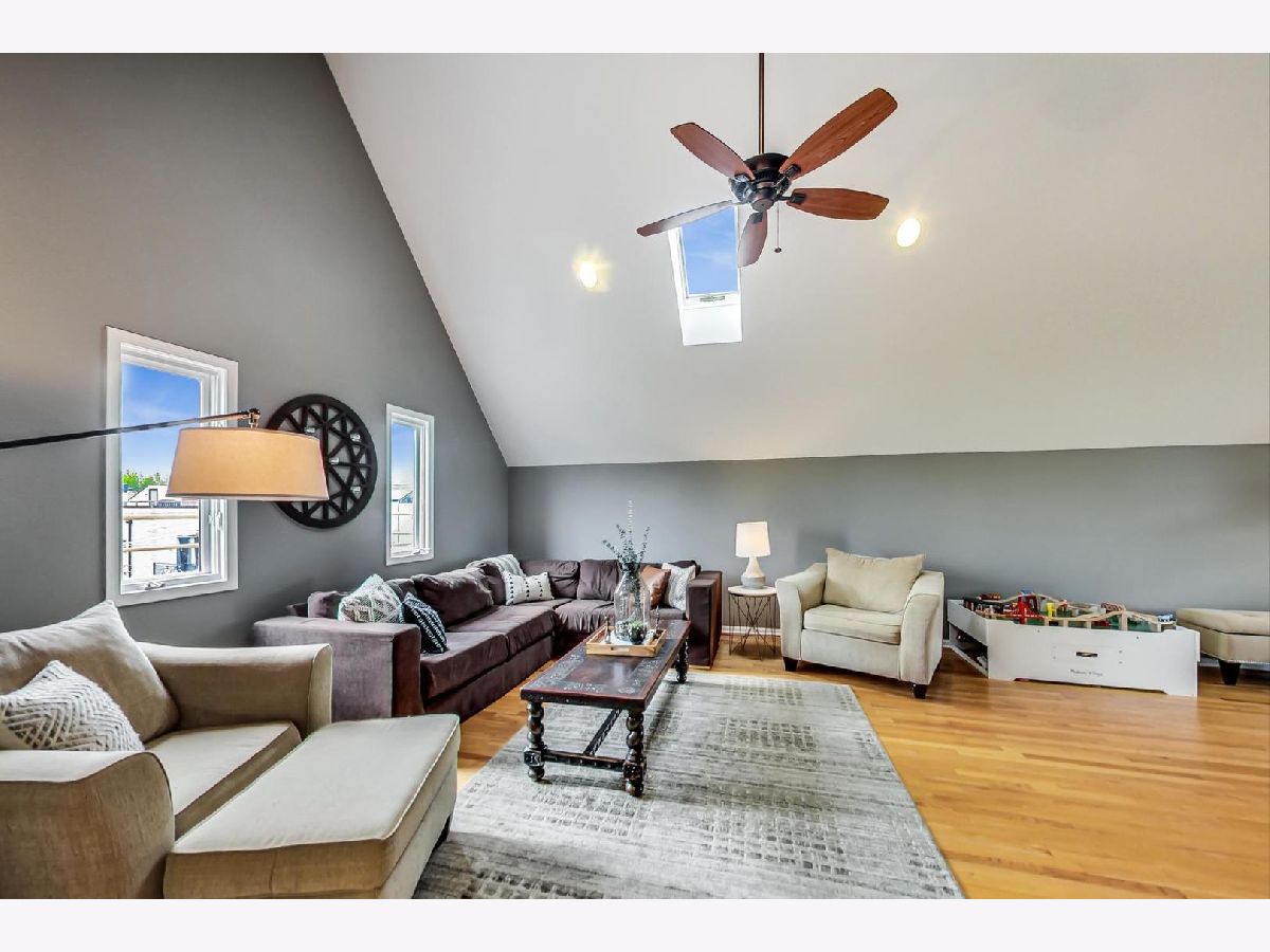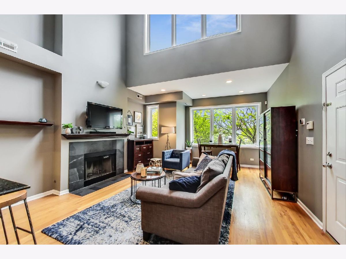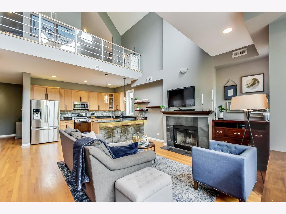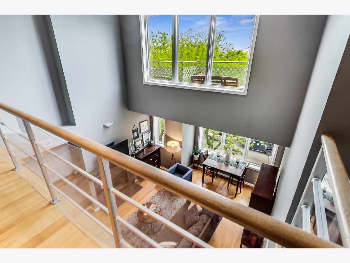 Sunny Extra Wide Duplex up in East Village walking distance to Blue Line and Hotspots. Soaring Ceilings & breathtaking city views compliment versatile living space. 3 decks. Garage parking. Updated Kitchen and baths. Living Room/Dining Room on main level with wood burning fireplace. 2 bedrooms on main level with large family room on 2nd floor that could be divided to add a 3rd bedroom. Loft/office space and storage. In unit washer dryer. Lovingly maintained. Everything updated in last few years in this home. Furnace (2017), A/C (2018), Water Heater (2019), W/D (2014), Refrigerator (2019), Dishwasher (2016) Wonderful corner building lush with trees, flowers and green space. 100% owner occupied.