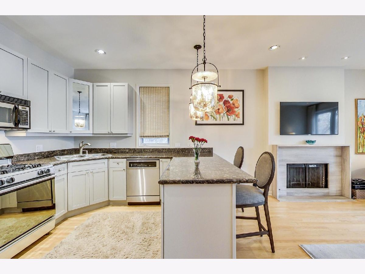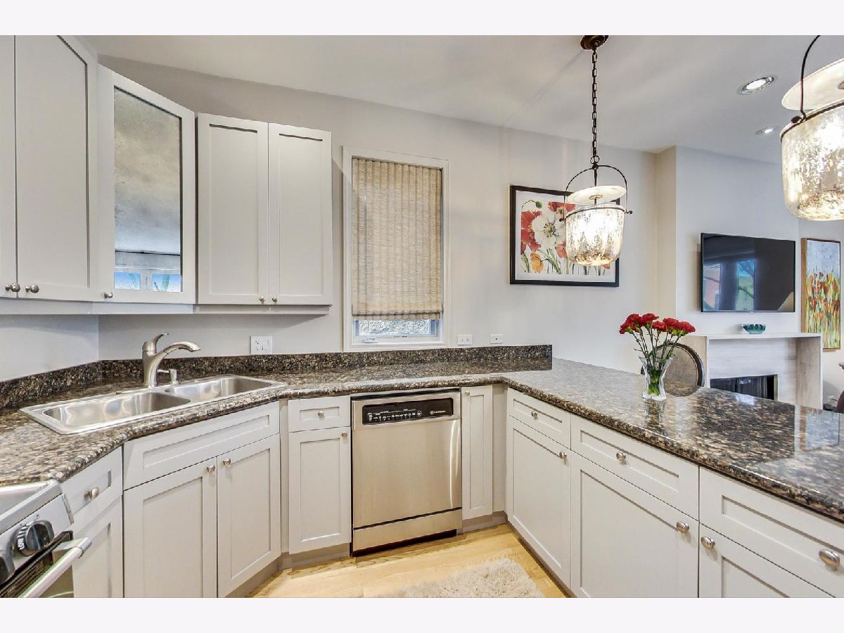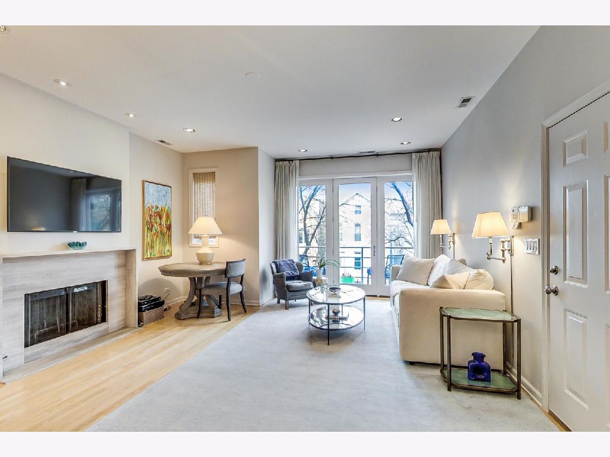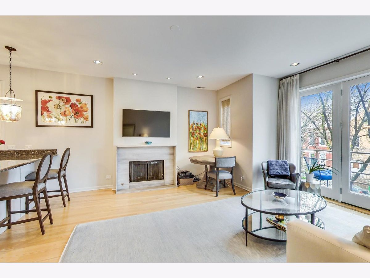 Sunny extra wide 2 bedroom in East Village walking distance to Blue Line and Hotspots. Lush front balcony tucked into the trees, deck in the rear, plus common backyard. Large Updated Kitchen with ample cabinets and peninsula. Living Room/Dining Room with wood burning fireplace with new stone surround. Large main bedroom with walk in closet. Main bath with separate tub and shower and dual vanity sink. Many updates in last few years. New East facing windows (2018). Painted throughout. High efficiency HVAC (2012). Humidifier (2020). Water Heater (2020). Refrigerator (2017). Microwave (2004). New solid core doors in common area. Ceiling insulation thru-out. Ash floors thru out. 2 coat closets. In unit washer dryer. Garage parking. Wonderful corner building lush with trees, flowers and green space. Well maintained building.