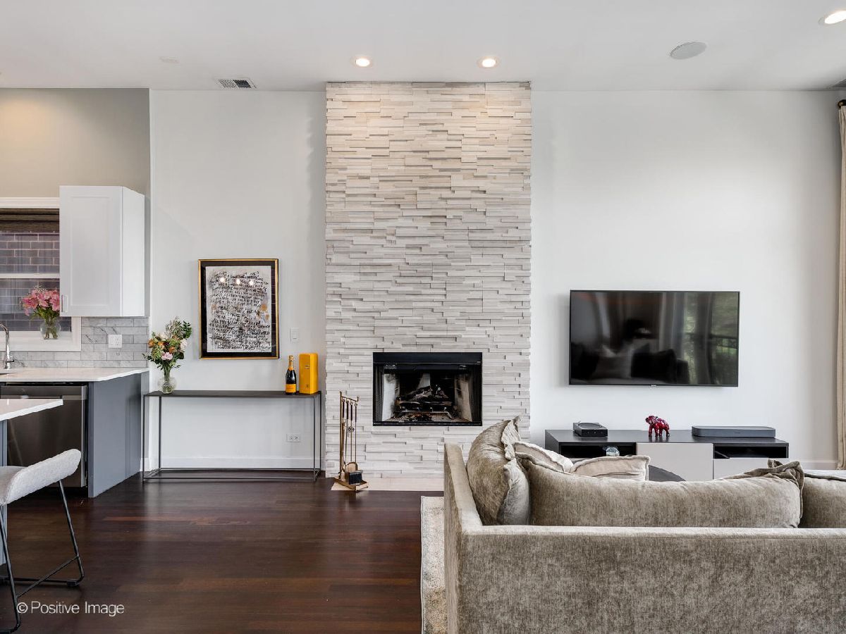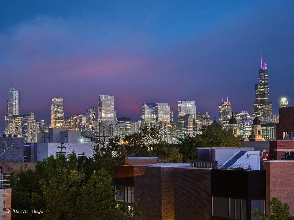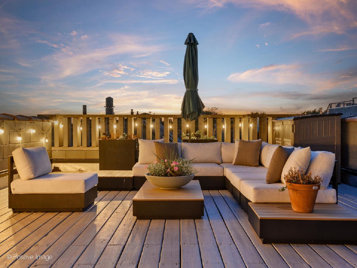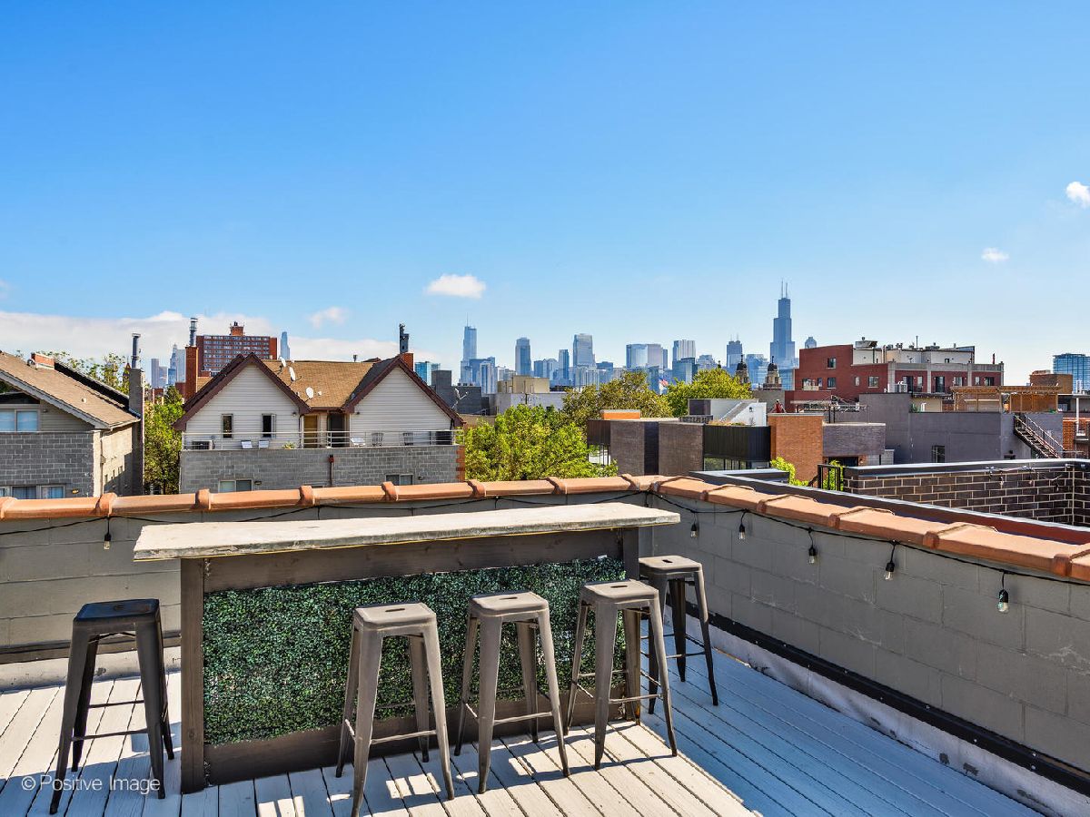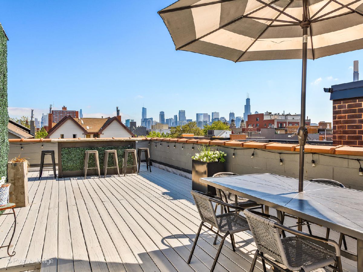 Ultra-luxe penthouse with a private rooftop oasis in the heart of East Village. Thoughtfully redesigned with Restoration Hardware inspired finishes, this stunning 2-bedroom, 2-bathroom residence delivers elevated style and turnkey comfort on a quiet, tree-lined street. The expansive open floor plan showcases soaring 11-foot ceilings, completely refinished hardwood floors, and a freshly painted interior throughout. The designer kitchen has been elevated to a new level, featuring beautifully appointed cabinetry, quartz countertops, stainless steel appliances, a generous island and separate formal dining area. Perfect for both everyday living and entertaining. The sun-filled living room is anchored by a striking stone-tiled gas fireplace and opens to a Juliet balcony, creating a seamless blend of warmth and light. The primary suite is a true retreat, offering direct access to a private rear deck and a spa-inspired en suite bath with soaking tub, separate shower, and double vanity, all finished with refined, modern materials. A second bedroom and beautifully updated guest bath complete the main level. A dramatic floating staircase leads to the expansive private rooftop deck, newly refreshed and offering breathtaking skyline views, an exceptional setting for entertaining or unwinding under the city lights. Recent upgrades include a new furnace, fully refinished flooring and stairs throughout, updated light fixtures, roof inspected and repairs, freshly painted deck, and a recently tuck-pointed & sealed building. Additional highlights include all brick building, custom window treatments, garage parking, and extra storage. Ideally located near the dining, shopping, grocery (NEW WHOLE FOODS!) and nightlife of West Town and Wicker Park, with easy access to grocery stores, the Blue Line, and more, this is refined city living at its finest.