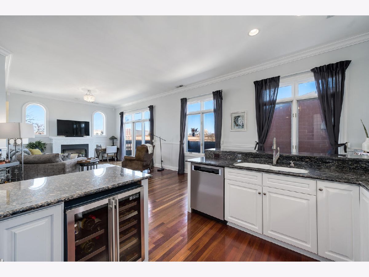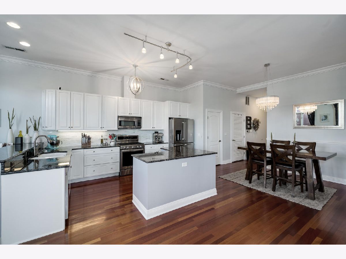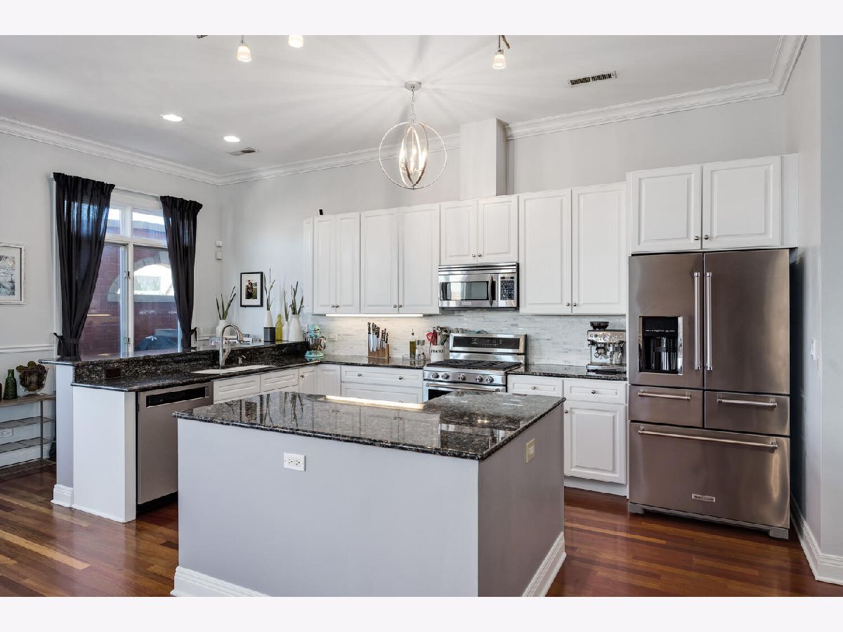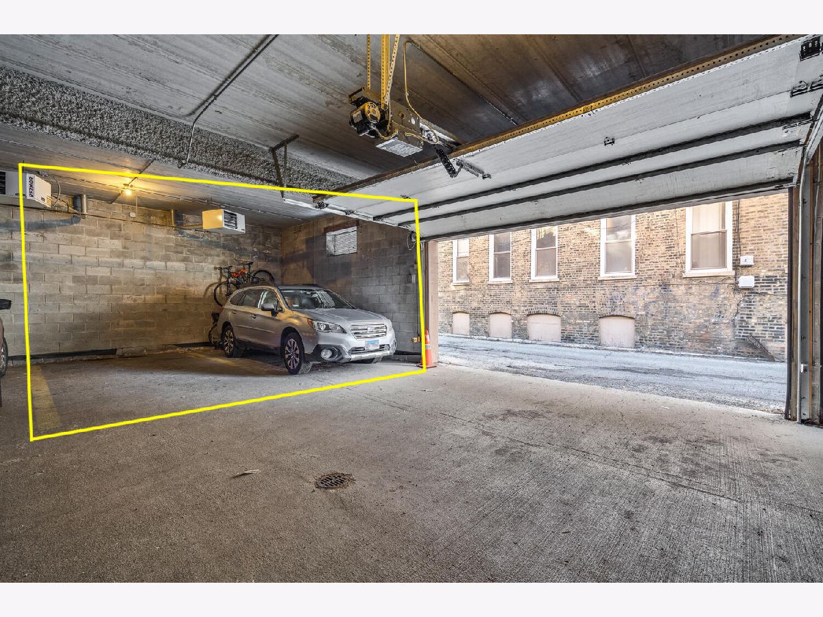 One of a kind corner 3 bed/2 bath penthouse in West Town ELEVATOR building. This condo features two outdoor spaces - east facing balcony with views of the skyline and a west facing patio. There are TWO indoor heated garage parking spots. Large, open living space with 10 ft ceilings, crown molding, open concept living space, and a cozy fireplace. The kitchen offers plenty of room for a full size dining table, white cabinets, newer appliances, large island, wine fridge, breakfast bar, walk-in pantry, tile backsplash, and updated light fixtures. Primary suite is a haven for relaxation with a private deck, large walk-in closet, and ensuite spa bath featuring heated floors, skylight for incredible natural light, steam shower with body jets, and jacuzzi tub. All bedrooms face the backside/side of the building. Great location right across the street from Black Dog Gelato, blocks away from multiple parks, highly-rated restaurants, and just one block to Mariano's.