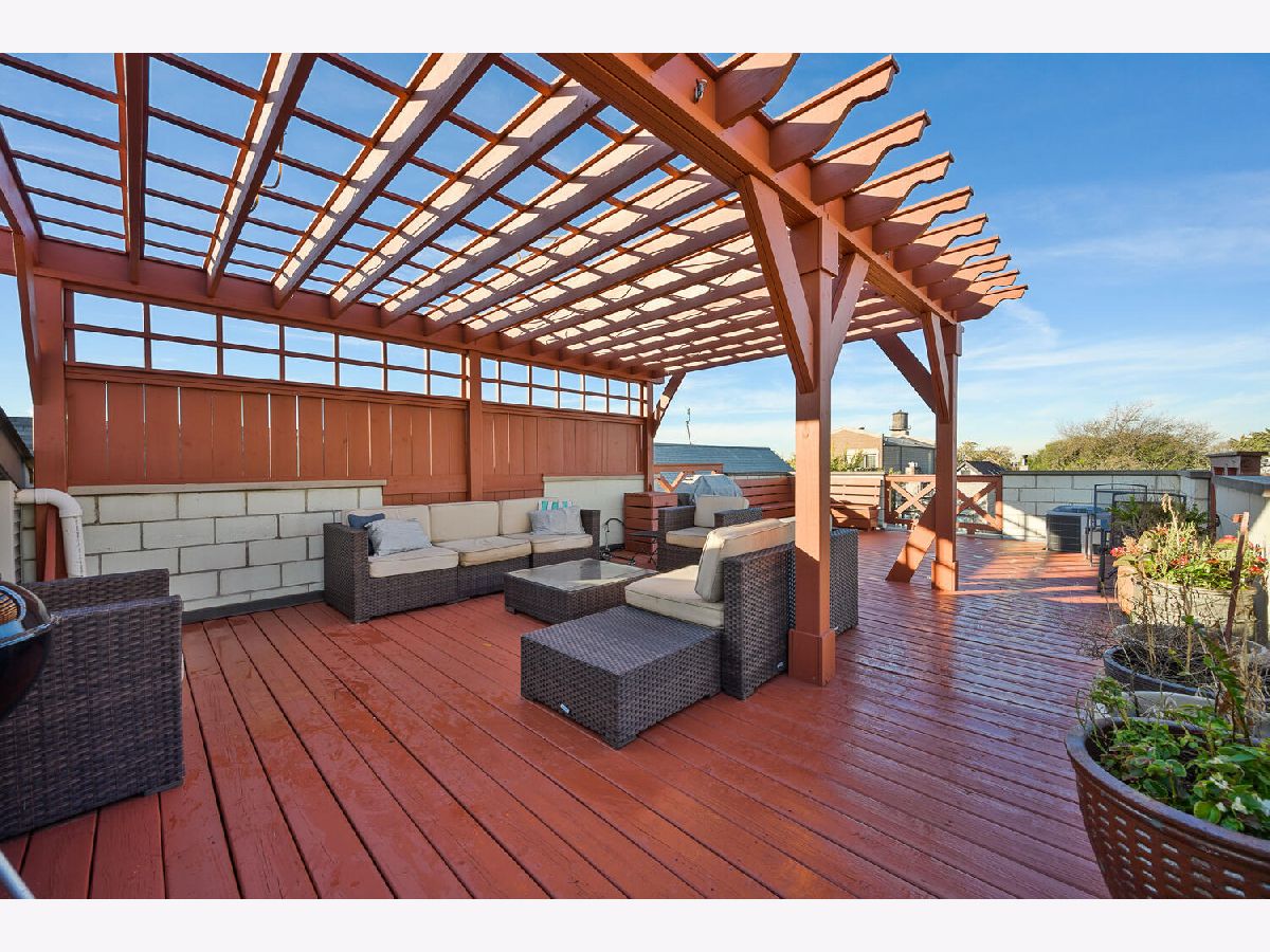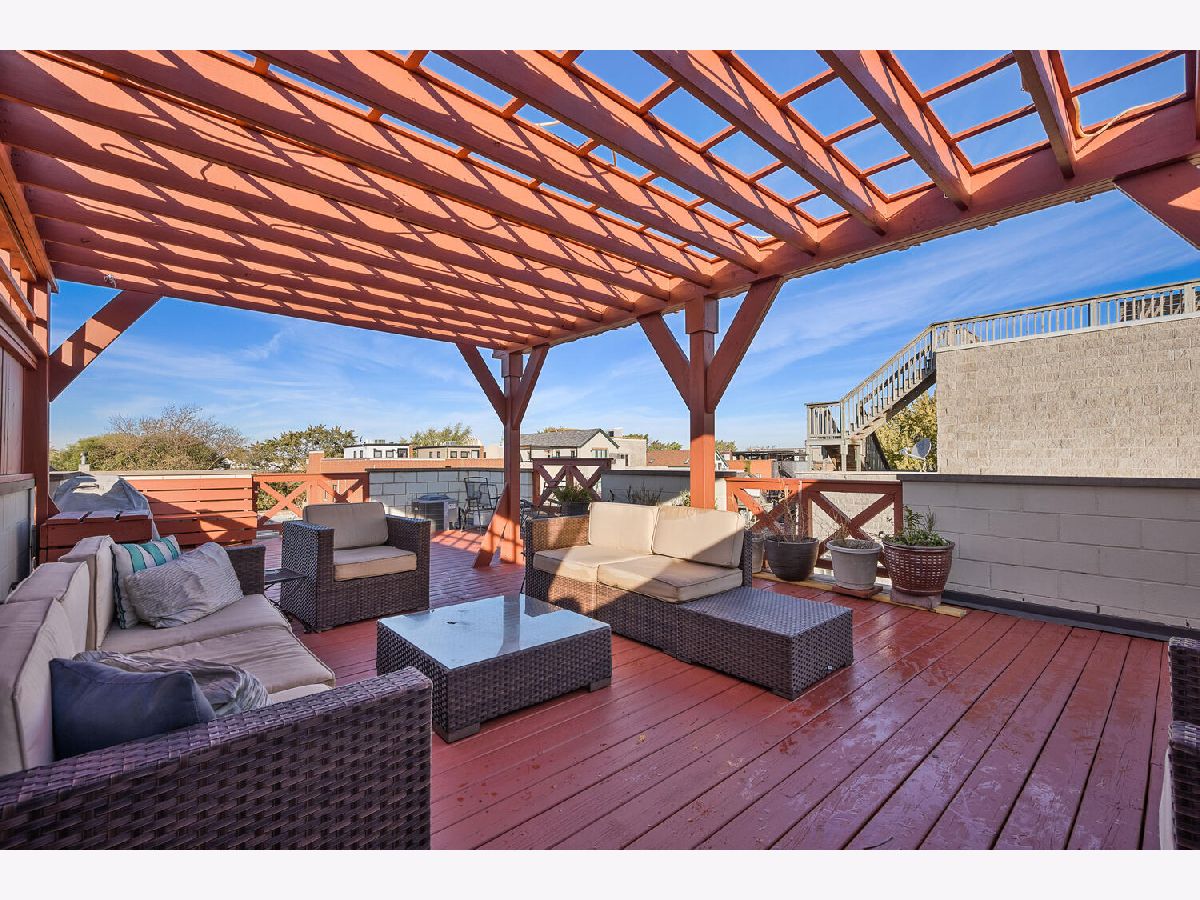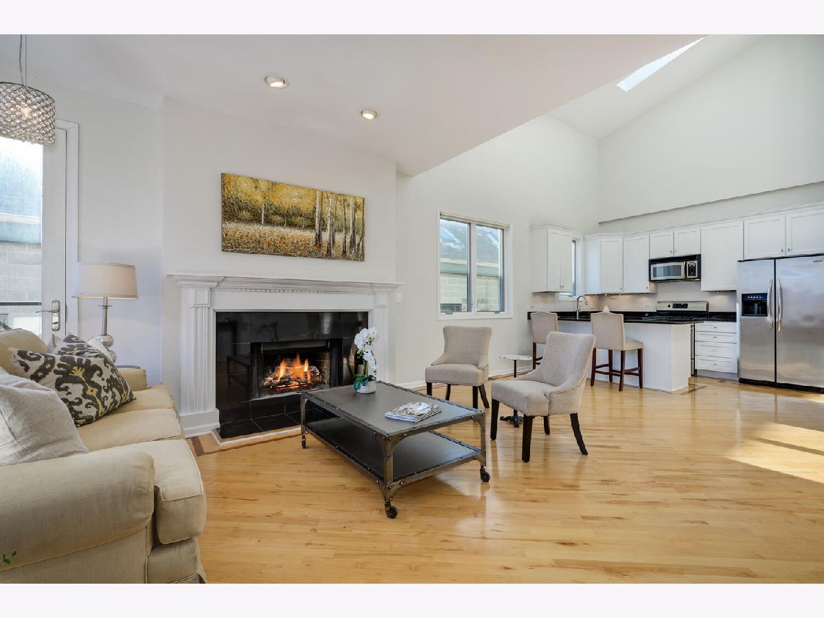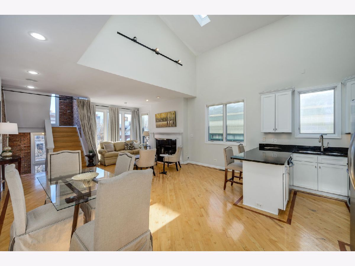 Very cool, lofty East Village 2 Bedroom, 2 bath Penthouse has it all with garage parking space and huge private and fabulous roof top deck! This Open and airy unit has private entry staircase with Exposed brick to a jaw dropping living space with soaring ceilings, skylights and great living space! This unit is flooded with sunlight and features maple wood floors, fireplace, Open kitchen with white cabinets, granite counters and stainless appliances, generous bedrooms sizes included king sized primary bedroom suite with updated bath with walk in shower and subway tile. Other highlights include custom drapery, updated lighting, laundry in unit, freshly painted so ready to move right in! Interior staircase leads to storage area and an awesome private roof top deck with pergola and skyline views! Additional storage outside of unit in basement and 1 on site Garage parking space Included! Fantastic Hot location very convenient to CTA blue line, Division Street & Chicago Avenue corridor for top shopping, dining, bars and grocery store!