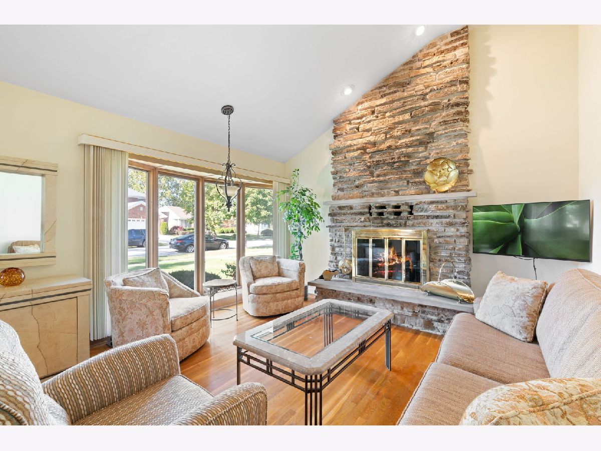 Lovely home in "The Terrace" offers a terrific floor plan, great schools and a convenient location near shopping, restaurants, waterpark and the Niles Fitness Center. From the foyer enter into the dramatic open living/dining room featuring a stunning stone fireplace accentuated by recessed lighting and a vaulted ceiling. Pretty bay window lets in plenty of natural light. Large living room can easily accommodate a variety of seating arrangements or a sectional. The wood burning fireplace has a gas starter. Dining area features a long nook - perfect for a buffet, with a large window above. Beautiful hardwood floors (the "real" thing - not vinyl plank!) throughout the living/dining area, upstairs hall and all bedrooms. Well designed kitchen has two windows and a charming built-in banquette. Three bedrooms up with organized closets, neutral window treatments, two ceiling fans and two extra hall closets! Upstairs bath with tub/shower combo is in pristine condition. Lower level has a sizeable family room with a large built in bar and display shelving - perfect for entertaining! Plenty of room for a large sectional, big screen TV and a game table. High end commercial grade vinyl tile and Hunter Douglas blinds, too. Large neutral updated bath with tiled shower. Access to additional storage. Utility/laundry room also has a laundry tub. New concrete on part of the front walkway and the side drive. Oversized two car garage also has a retractable sun shade and plenty of additional storage. Beautiful backyard has been professionally landscaped and has a large yard in addition to a generous patio area for your summer BBQ's. Newer windows throughout the home. Don't be fooled by the outside - this home is much larger than it appears! Maine East H.S. district. Notre Dame College Prep and St. John Brebeuf School are also nearby. Some furniture may be available for sale. Niles Transfer Tax is paid by Buyer. House being sold in "As-is, as found condition". Pre-approval or proof of funds must accompany all offers.