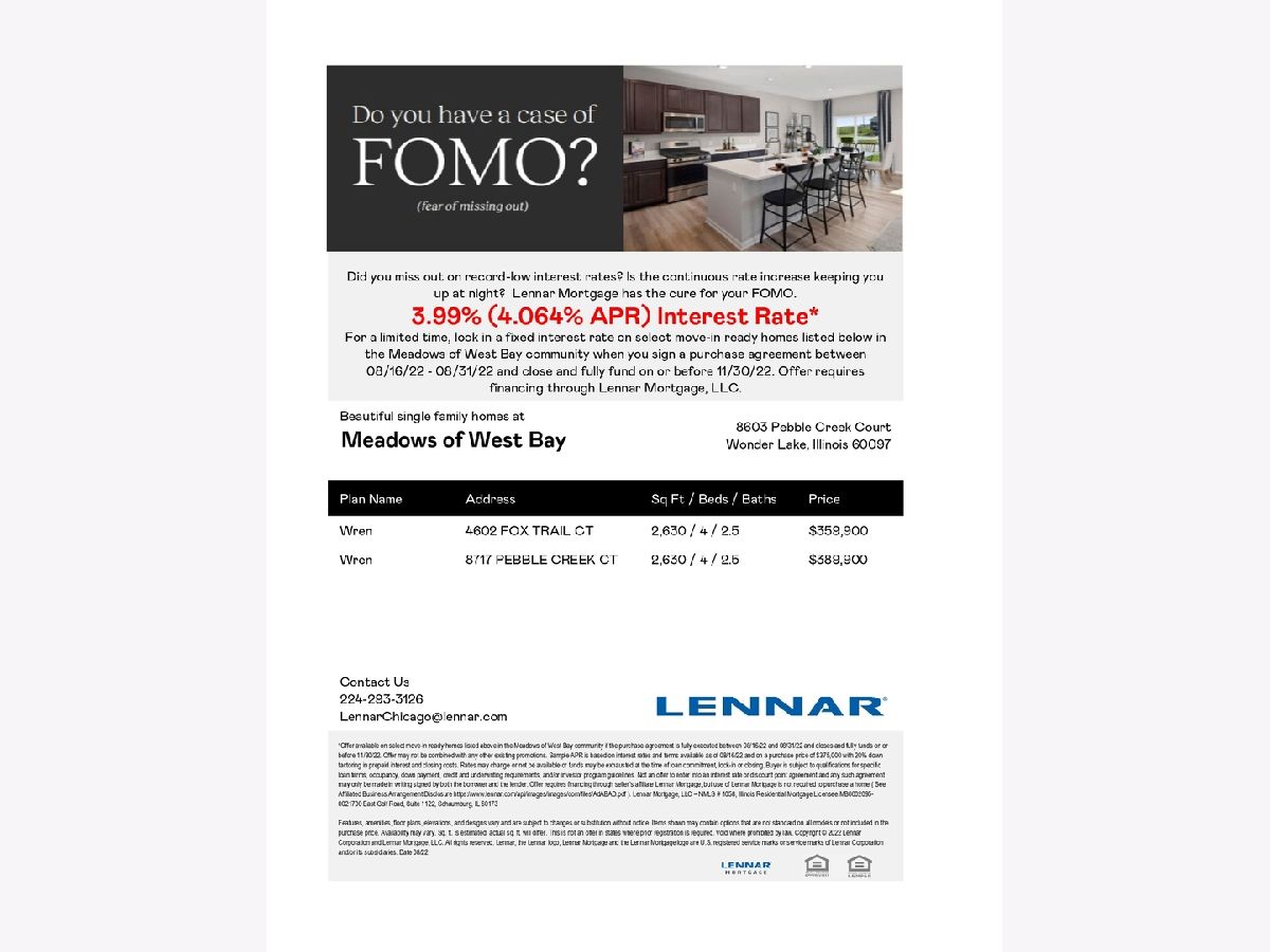 UNDER CONSTRUCTION, THE PROPOSED MOVE-IN DATE IS November 2022!! The Wren is an exquisite two-story home with an attached 3-car garage, 4 spacious bedrooms, 2.5 bathrooms, and a full basement. Enjoy the open concept family room, dining room, and kitchen when entertaining guests or relaxing with loved ones. The family room has a beautiful gas fireplace, kitchen, and dining room can be found on the first level of this two-story home, arranged in a convenient and contemporary open floorplan, while a study and living room provide additional shared space that the whole family can enjoy. The four spacious bedrooms, laundry room, and the Owner's Suite are on the 2nd level. The Owner's suite features a walk-in closet and a private ungraded master bathroom. Superior quality, Home is protected by a 10-year structural warranty. Everything's Included program in our newly constructed homes includes top-of-the-line features. Our fully appointed kitchens include Aristokraft cabinets and GE appliances. Our homes also feature 9' first-floor ceilings, Decorative Rail, LED surface mounted lighting in the hallways and bedrooms, modern two-panel interior doors and colonist trim, vinyl flooring in the kitchen, foyer, powder room, bathrooms, and laundry room, a garage door opener, 30-year architectural shingles and so much more, all of which are included with your new home at no extra cost. Plus, the Connected Home by Lennar now provides even more convenience and peace of mind for our Customers with the Ring Video Doorbell Pro and Alarm Security Kit. All of our homes are WIFI guaranteed withno dead spots and include the most desired home features such as Flo by MoenTM Smart Water Shutoff, MyQ Smart Garage Control, Honeywell HomeT6 Pro Z-Wave smart thermostat, Level Touch invisible smart lock, Ring Video Doorbell Pro, and Ring Alarm Security Kit. West Bay is located just West of Wonder Lake, an 816-acre, 3.5-mile-long private lake that features a private gated entry boat launch, a bird island, Lookout Point Park, and walking paths along and throughout the community. * Photos are from a similar model* * Taxes are not fully assessed. Special financing incentives when using a preferred lender.* Where new memories begin, and old ones are cherished*
