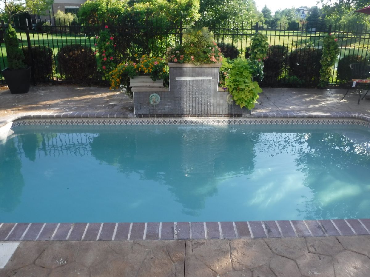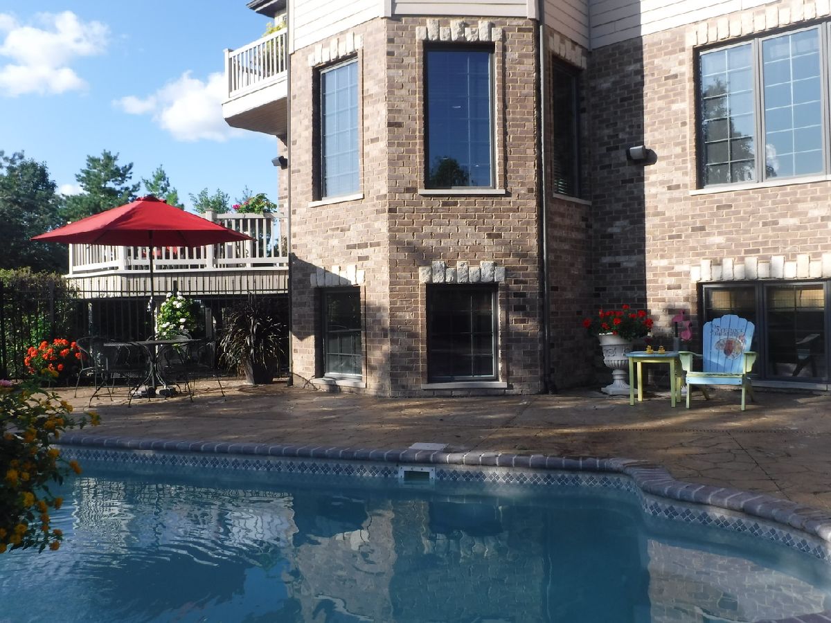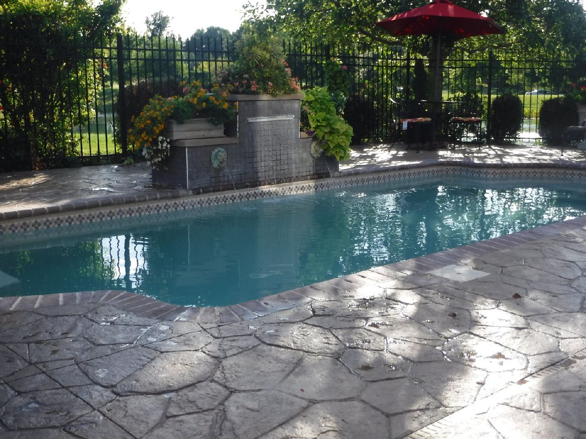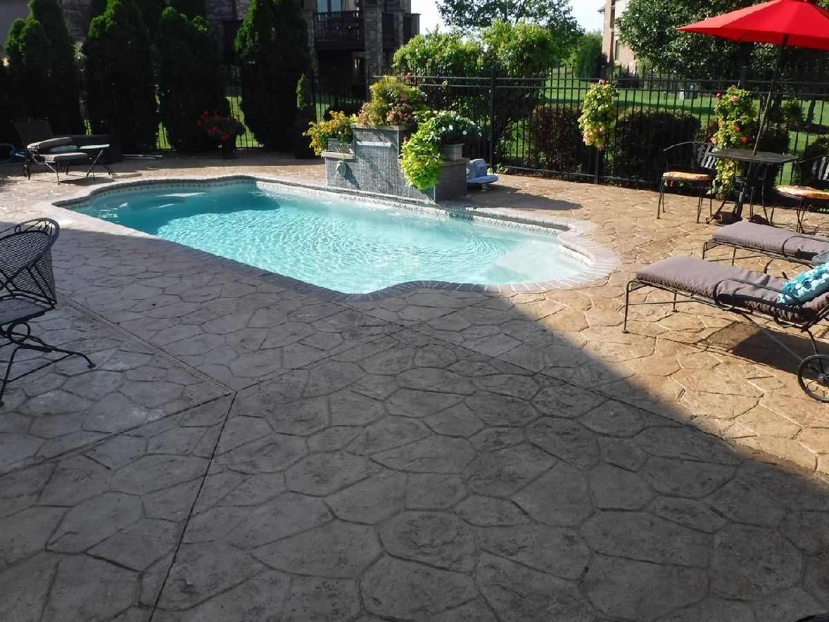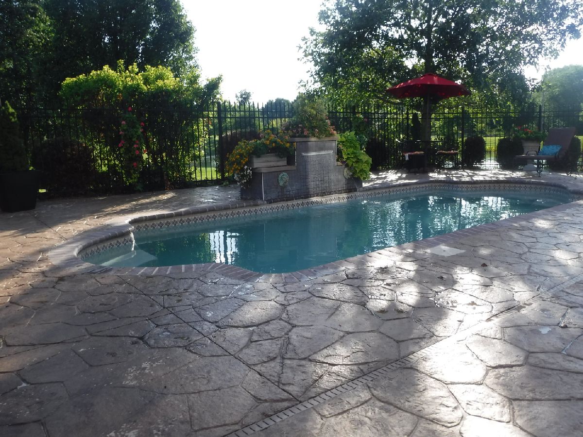 | Deck, Patio, Stamped Concrete Patio, In Ground Pool | |