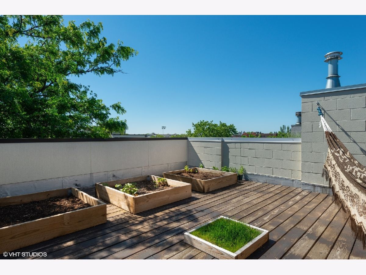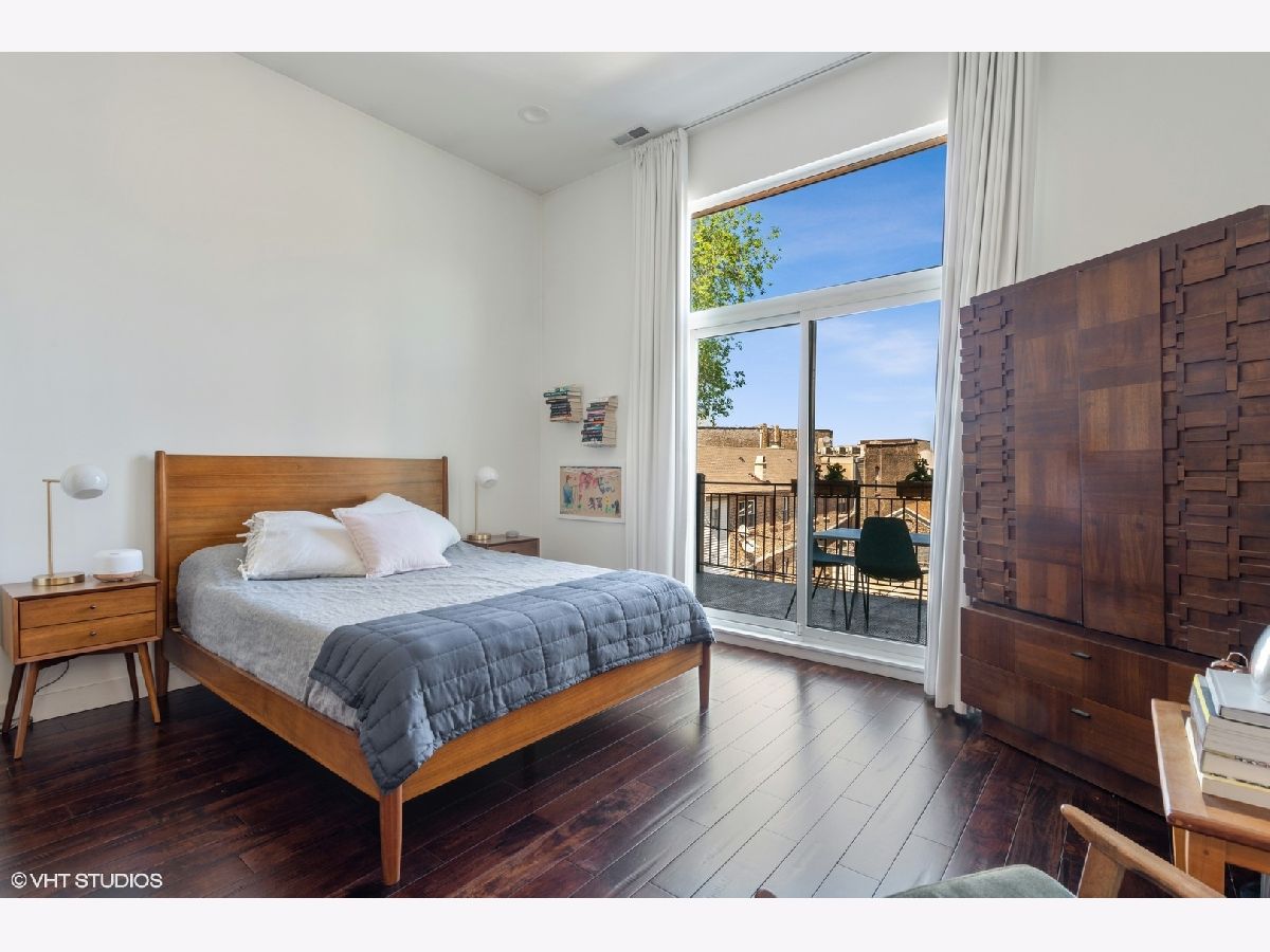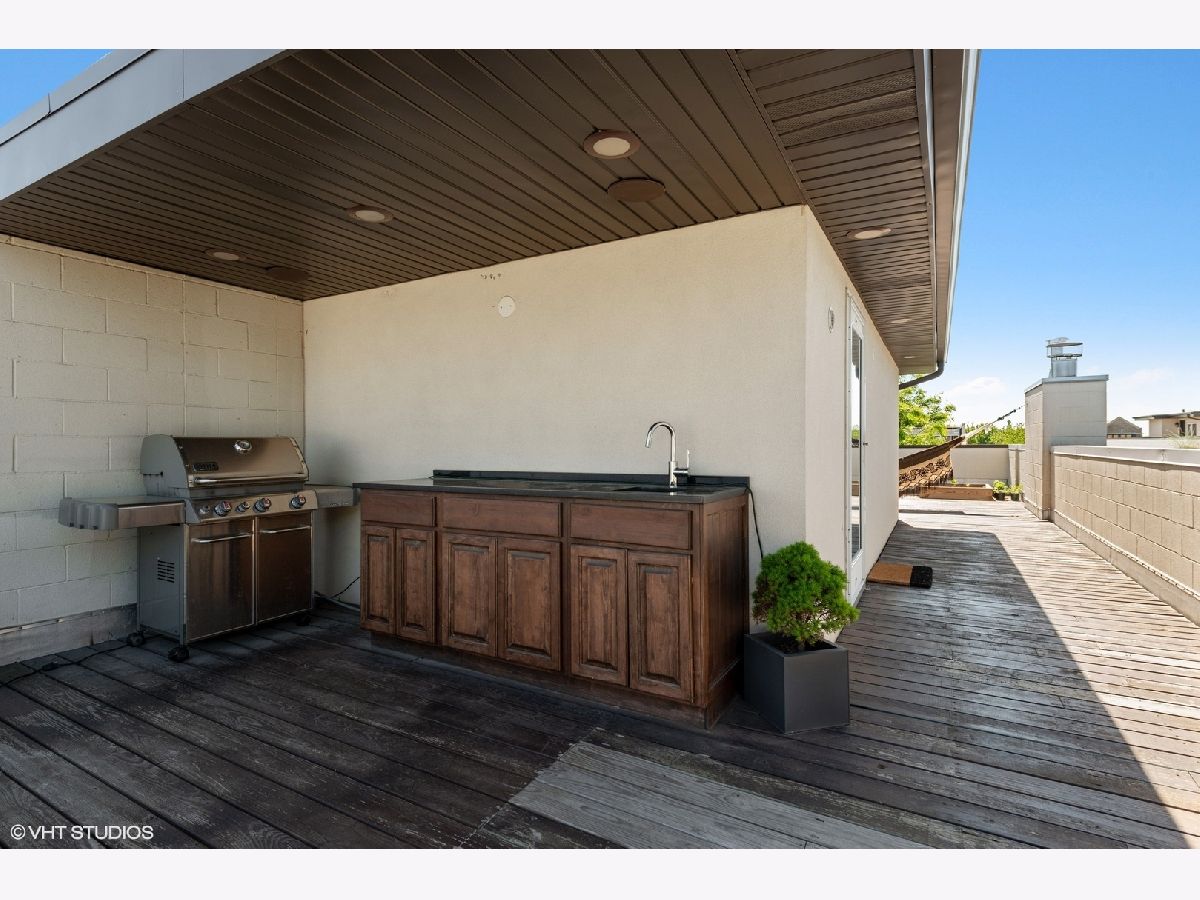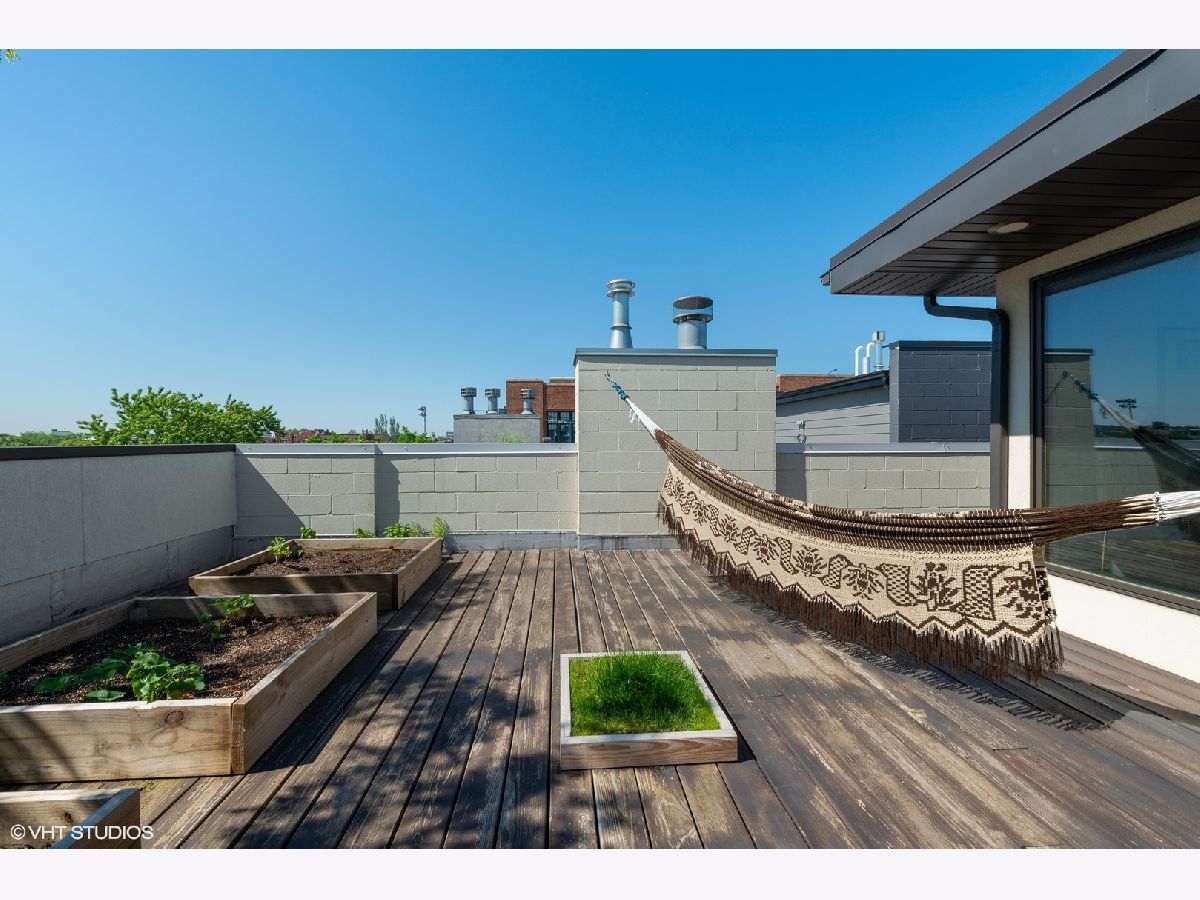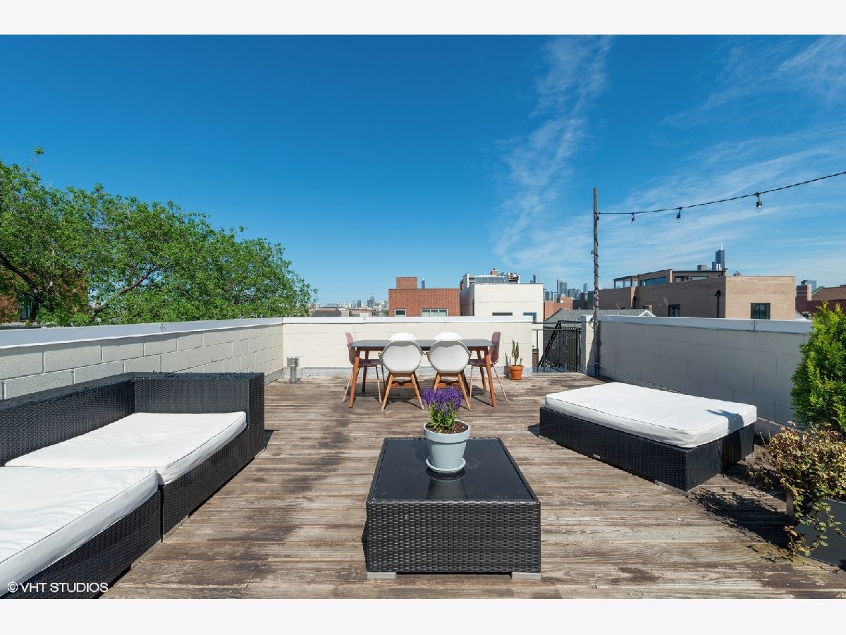 Don't miss out on this East Village stunner. Penthouse unit features 3 beds, 2 baths and three private outdoor spaces. The well appointed living space is not only open but well lit by beautiful floor to ceiling front windows. Custom shelves span the entire living room wall, open the sliding doors to the front balcony and have an outdoor extension of living space. Sleek and modern kitchen with thick quartz countertop and matching full slab backsplash overlooks the living/dining room making it a perfect space for entertaining. Down the hall will find the 2nd bedroom and guest bath ending with master suite. Spacious master is complete with a walk in closet and private balcony. Spa caliber master bath has dual vanities, XL steam shower and separate soak tub. Upstairs find third bed/flex space that can easily double as an office with direct access to a full rooftop deck. This rooftop oasis features skyline views, a built in wet bar, flower beds for gardening, and a separate stairway leading to the lower master bedroom balcony. A+ Location on tree lined street is steps to the dining/nightlife on both Chicago and Division plus easy blue line access.
