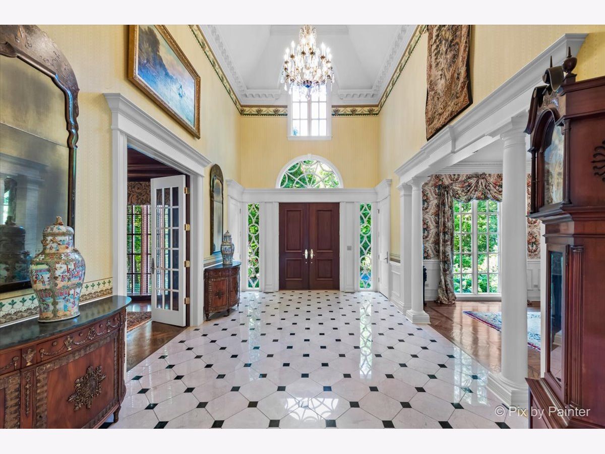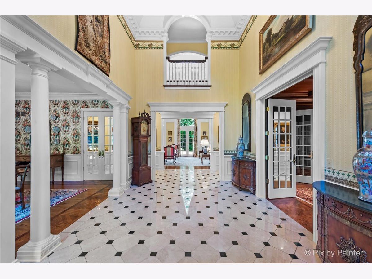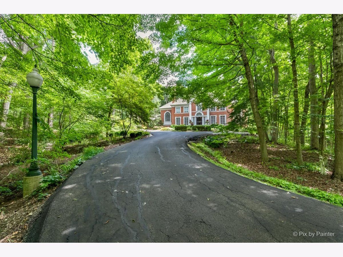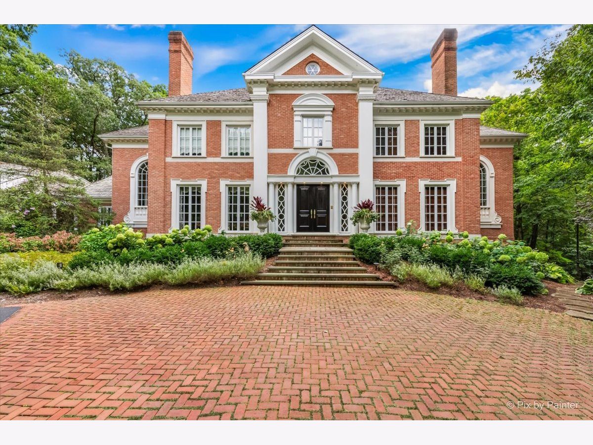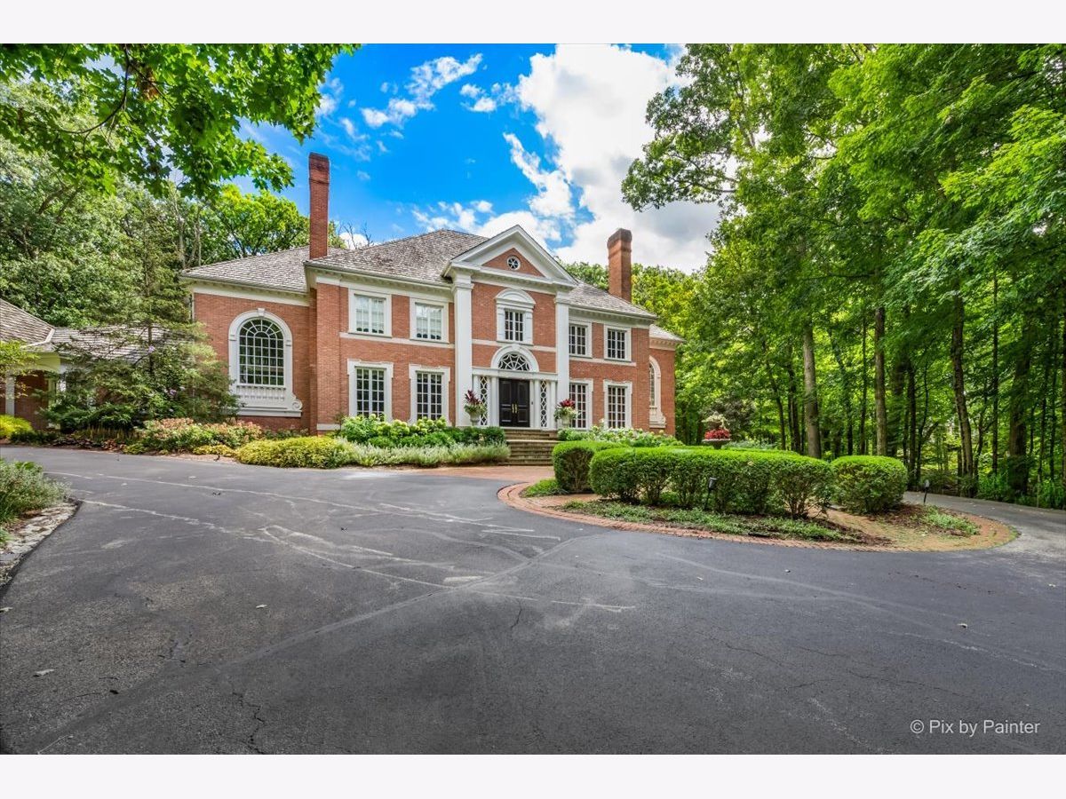 This exquisite Georgian estate, crafted by Harrison Construction in collaboration with architects Spitzmiller and Norris, is nestled on a remarkable 4.47-acre lot in the prestigious Woods of Fox Glen. Handpicked by Harrison, the visionary behind the community, this residence offers unparalleled privacy, enhanced by a picturesque 1/4-mile driveway that welcomes you into a serene landscape surrounded by mature trees. As you approach the home, the classic Georgian architecture captivates with its elegant brick facade, intricate cornices, stately columns, and finely detailed plinth bases. Step inside to a grand two-story foyer adorned with marble flooring, setting the tone for the stunning interior that showcases the hallmark features of high Georgian design, emphasizing symmetry and proportion. The home boasts nearly 10,000 square feet of luxurious living space, with ornate wood mouldings and trim throughout, soaring 10-foot ceilings on the main level, and two elegantly crafted staircases. The private library is a standout, featuring a coffered ceiling, rich cherry wood accents, and a mantel imported from England, complemented by custom built-in bookshelves. The formal dining room is designed for hosting, with floor-to-ceiling windows and a cozy fireplace, seamlessly connecting to the gourmet kitchen through tasteful dividing doors for effortless entertaining. The grand two-story living room exudes sophistication, showcasing herringbone wood floors, dramatic chandeliers, and a stunning array of windows that bathe the space in natural light. Three sets of French doors lead to a charming brick paver patio, perfect for outdoor gatherings. Culinary enthusiasts will delight in the gourmet kitchen, complete with expansive granite countertops, a custom pantry, 42-inch cherry cabinets, and a peninsula with a prep sink. A cozy family room adjacent to the kitchen features a custom skylight inspired by Victor Hugo's Parisian home, along with bay windows and a fireplace framed by built-in shelves. The tranquil main-level master suite offers a serene retreat, complete with a sitting area, abundant natural light, his and hers walk-in closets, and a luxurious ensuite bath featuring dual vanities, a whirlpool tub, and a separate shower. Upstairs, four generously sized bedrooms each boast private ensuite baths, while the walk-out basement offers additional living space, including a family room with a double-sided fireplace, a full kitchen, a game room, two bedrooms, and ample storage. Outdoors, nature lovers will find a paradise with expansive patios, lush greenspaces adjacent to scenic walking paths, and enchanting English gardens, perfect for peaceful strolls and relaxation. This estate combines luxury living with the beauty of nature, creating an unparalleled sanctuary. *Please do not enter the property without a confirmed appointment*