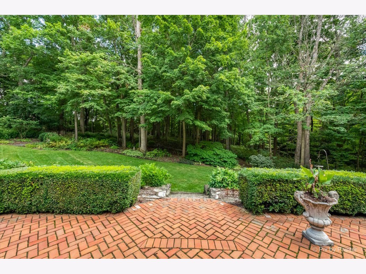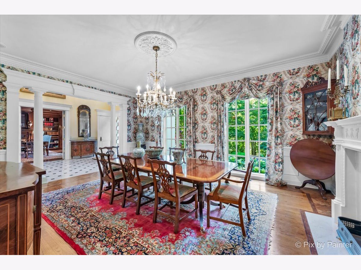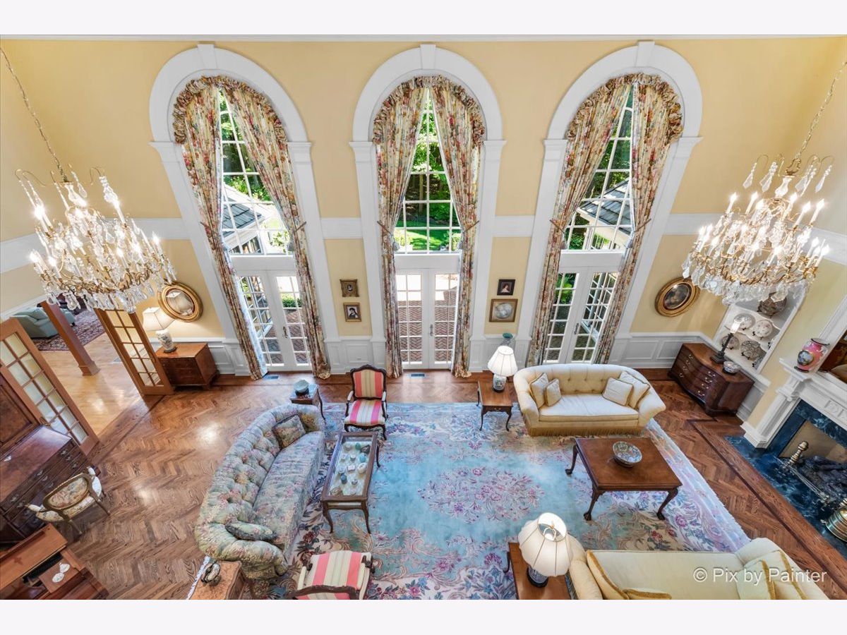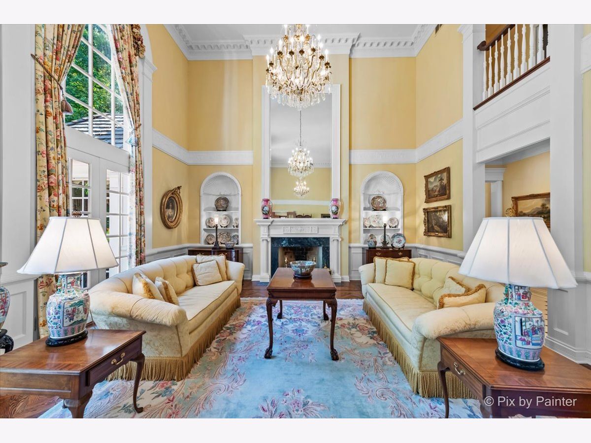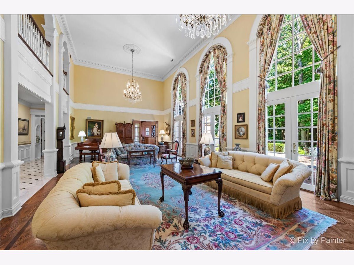 This exquisite Georgian estate, crafted by Harrison Construction in collaboration with architects Spitzmiller and Norris, is nestled on a remarkable 4.47-acre lot in the prestigious Woods of Fox Glen. Handpicked by Harrison, the visionary behind the community, this residence offers unparalleled privacy, enhanced by a picturesque 1/4-mile driveway that welcomes you into a serene landscape surrounded by mature trees. As you approach the home, the classic Georgian architecture captivates with its elegant brick facade, intricate cornices, stately columns, and finely detailed plinth bases. Step inside to a grand two-story foyer adorned with marble flooring, setting the tone for the stunning interior that showcases the hallmark features of high Georgian design, emphasizing symmetry and proportion. The home boasts nearly 10,000 square feet of luxurious living space, with ornate wood mouldings and trim throughout, soaring 10-foot ceilings on the main level, and two elegantly crafted staircases. The private library is a standout, featuring a coffered ceiling, rich cherry wood accents, and a mantel imported from England, complemented by custom built-in bookshelves. The formal dining room is designed for hosting, with floor-to-ceiling windows and a cozy fireplace, seamlessly connecting to the gourmet kitchen through tasteful dividing doors for effortless entertaining. The grand two-story living room exudes sophistication, showcasing herringbone wood floors, dramatic chandeliers, and a stunning array of windows that bathe the space in natural light. Three sets of French doors lead to a charming brick paver patio, perfect for outdoor gatherings. Culinary enthusiasts will delight in the gourmet kitchen, complete with expansive granite countertops, a custom pantry, 42-inch cherry cabinets, and a peninsula with a prep sink. A cozy family room adjacent to the kitchen features a custom skylight inspired by Victor Hugo's Parisian home, along with bay windows and a fireplace framed by built-in shelves. The tranquil main-level master suite offers a serene retreat, complete with a sitting area, abundant natural light, his and hers walk-in closets, and a luxurious ensuite bath featuring dual vanities, a whirlpool tub, and a separate shower. Upstairs, four generously sized bedrooms each boast private ensuite baths, while the walk-out basement offers additional living space, including a family room with a double-sided fireplace, a full kitchen, a game room, two bedrooms, and ample storage. Outdoors, nature lovers will find a paradise with expansive patios, lush greenspaces adjacent to scenic walking paths, and enchanting English gardens, perfect for peaceful strolls and relaxation. This estate combines luxury living with the beauty of nature, creating an unparalleled sanctuary. *Please do not enter the property without a confirmed appointment*
