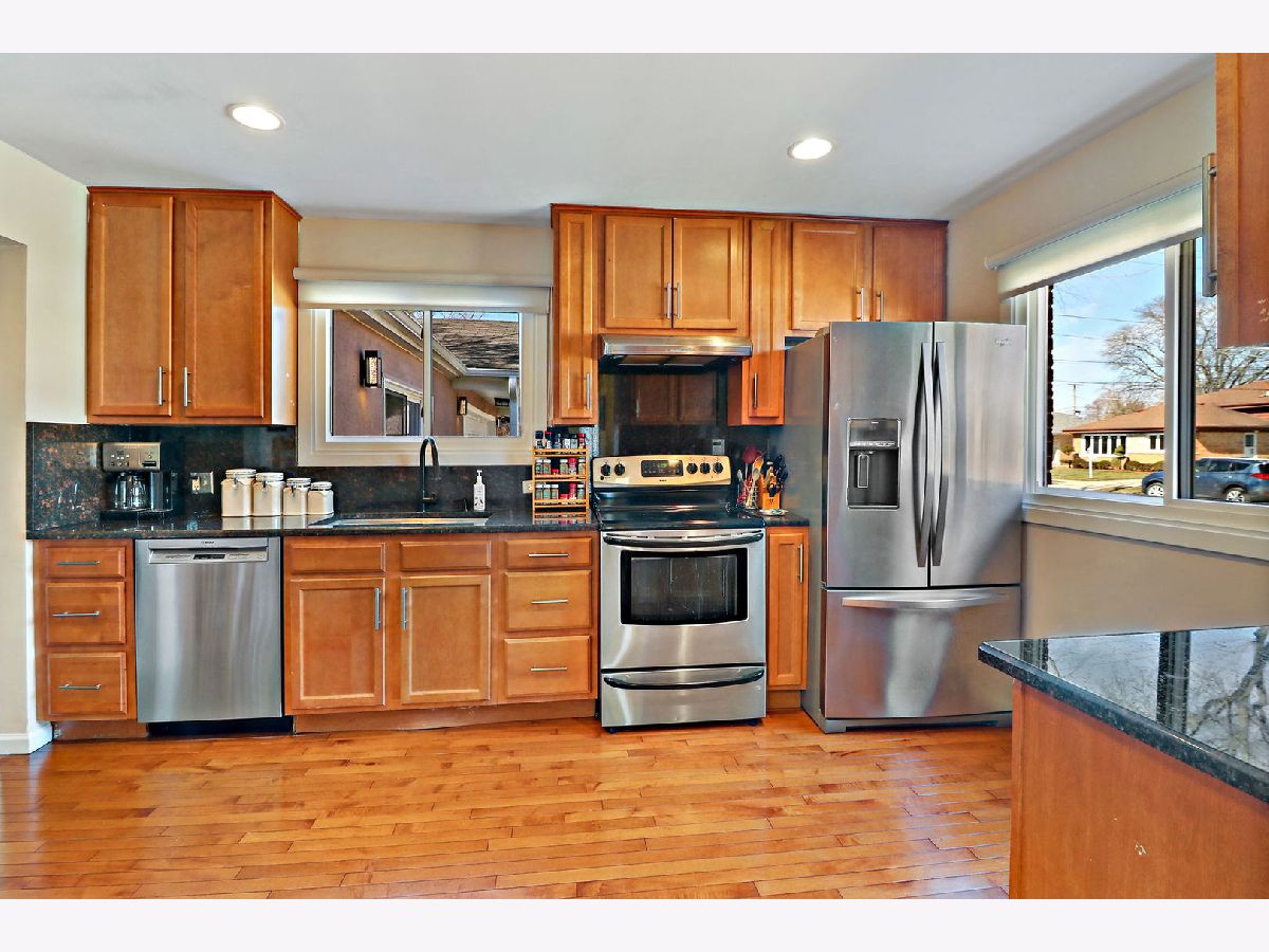 Still renting-can't find a house? Your search is over! This beautiful brick 3 bedroom, 2 bath split level has much to offer! Huge corner lot with attached 2 car garage. Updated eat-in kitchen with granite counters, all stainless-steel appliances & newer dishwasher, 2021. Home boasts updated bathrooms, with walk-in showers and all gleaming hardwood floors. Updated sump-pump & back up and new roof over addition 2020, thermostat 2021, light fixture dining room 2022. 1st floor has large family room with access to garage, also opens to front patio & yard with gazebo. The lower-level recreation room is now being used as a primary suite w/private bathroom. Great location one block to Oketo Park. Also, close to shopping, restaurants and Oriole Park and Pool! All this and a one year home warranty to buyer at close!