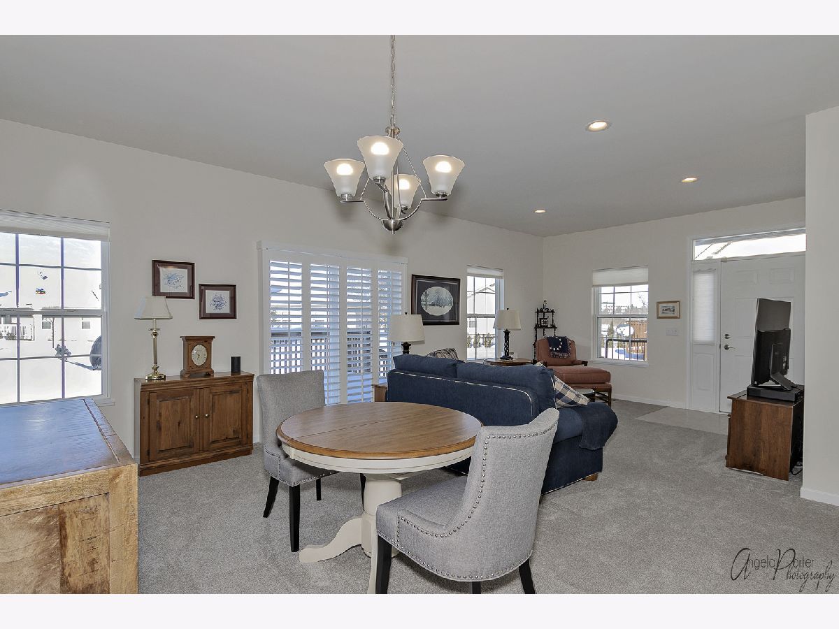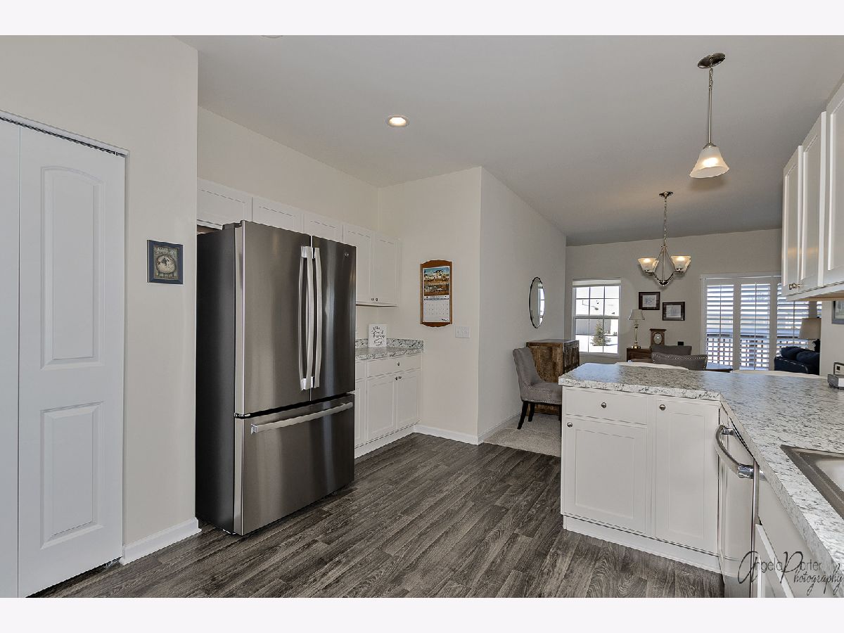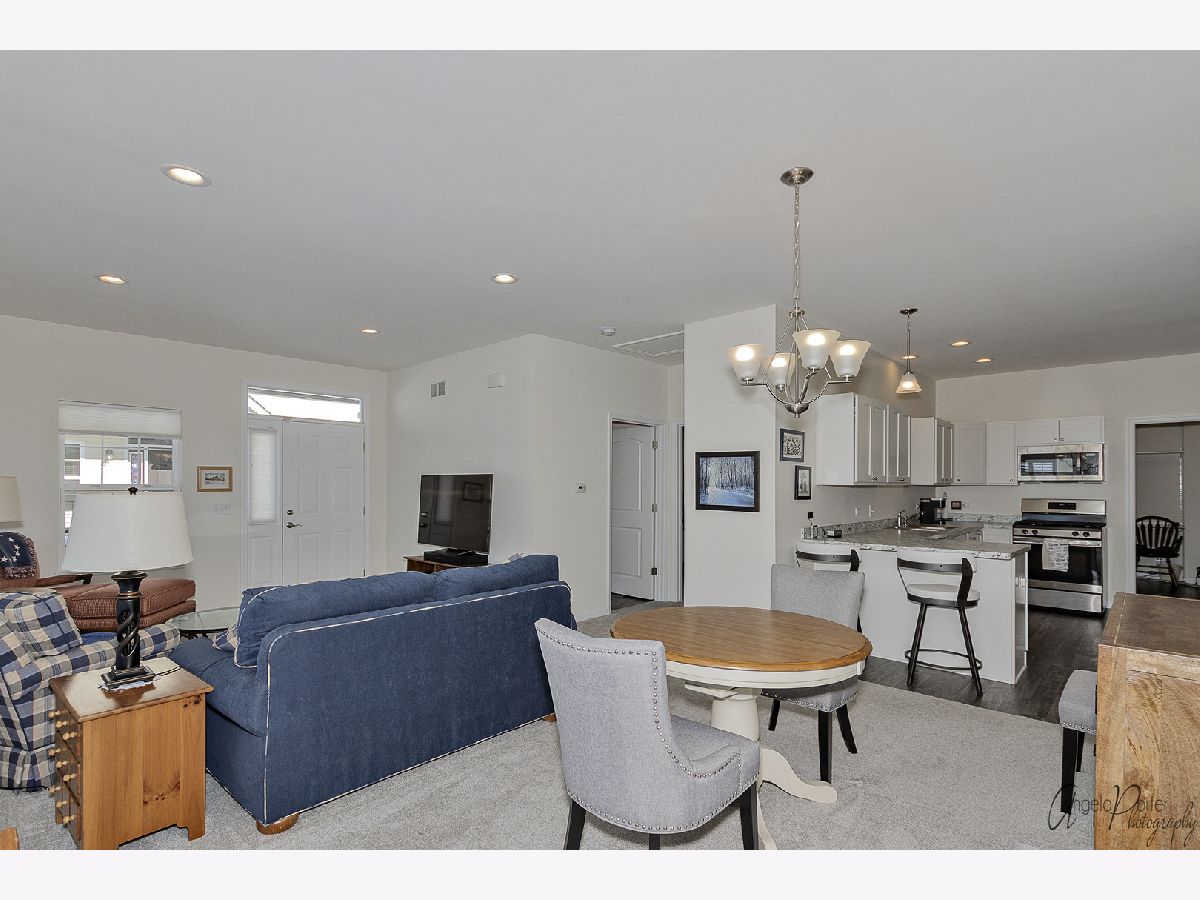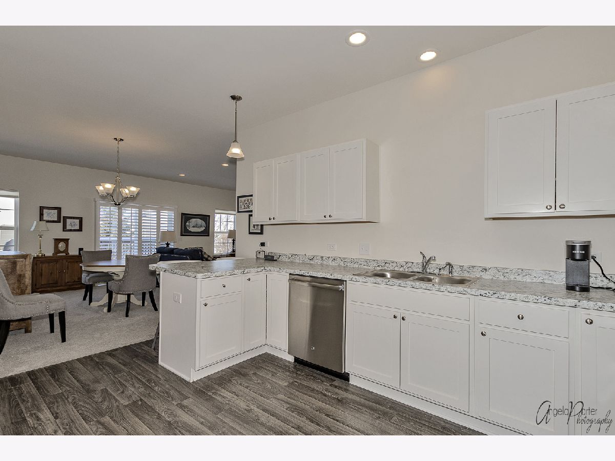 Absolutely beautiful and freshly remodeled ranch duplex features white Shaker style cabinetry, SS appliances, luxury vinyl plank flooring in kitchen and laundry, newer carpeting, full unfinished basement, 2+ car garage, 9' ceilings, white trim and doors, plantation shutters, new bath, freshly painted, light-filled open floor plan, sliders to the deck overlooking the pond and lovely views of nature, maintenance free living in a great over-55 resort like community. Use of the nearby Irish Prairie Health Club is included in the monthly assessment. This place looks like a model home, which is what it was!