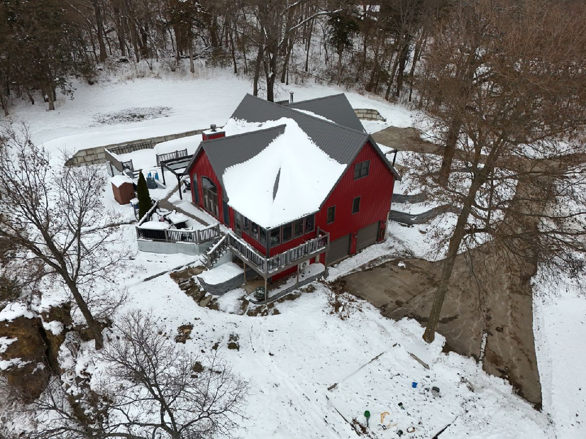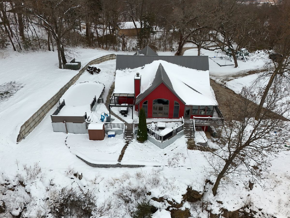 Perched high on a bluff overlooking the stunning Mississippi River valley, this exceptional 5-acre property offers unmatched views and peaceful wooded surroundings. The home features 3-5 bedrooms, 3 full bathrooms, and an additional half bath, thoughtfully designed for comfort and flexibility. The living room features vaulted ceilings, wood burning fireplace and expansive windows that frame the incredible bluff-top views. Newer engineered hardwood floors flow through the living room and four-season sunroom, while heated tile floors warm the entry, dining area, and kitchen. The beautifully renovated kitchen offers abundant counter space, modern finishes, and a large walk-in pantry-perfect for cooking and entertaining. Enjoy breathtaking scenery year-round from the four-season sunroom equipped with a mini split for efficient heating and cooling. The primary suite includes a freshly updated bathroom with dual sinks and a stunning tiled walk-in shower. Additional highlights include board-and-batten siding, a durable steel roof, and a 3-car attached garage for everyday convenience and a large 18x33 above ground pool and beautiful deck. A large 40x40 pole building with two 14' electric garage doors provides excellent space for equipment, storage, or hobbies. With bluff-top scenery, quality updates, and total privacy surrounded by nature, this property is a rare find. A true must-see.