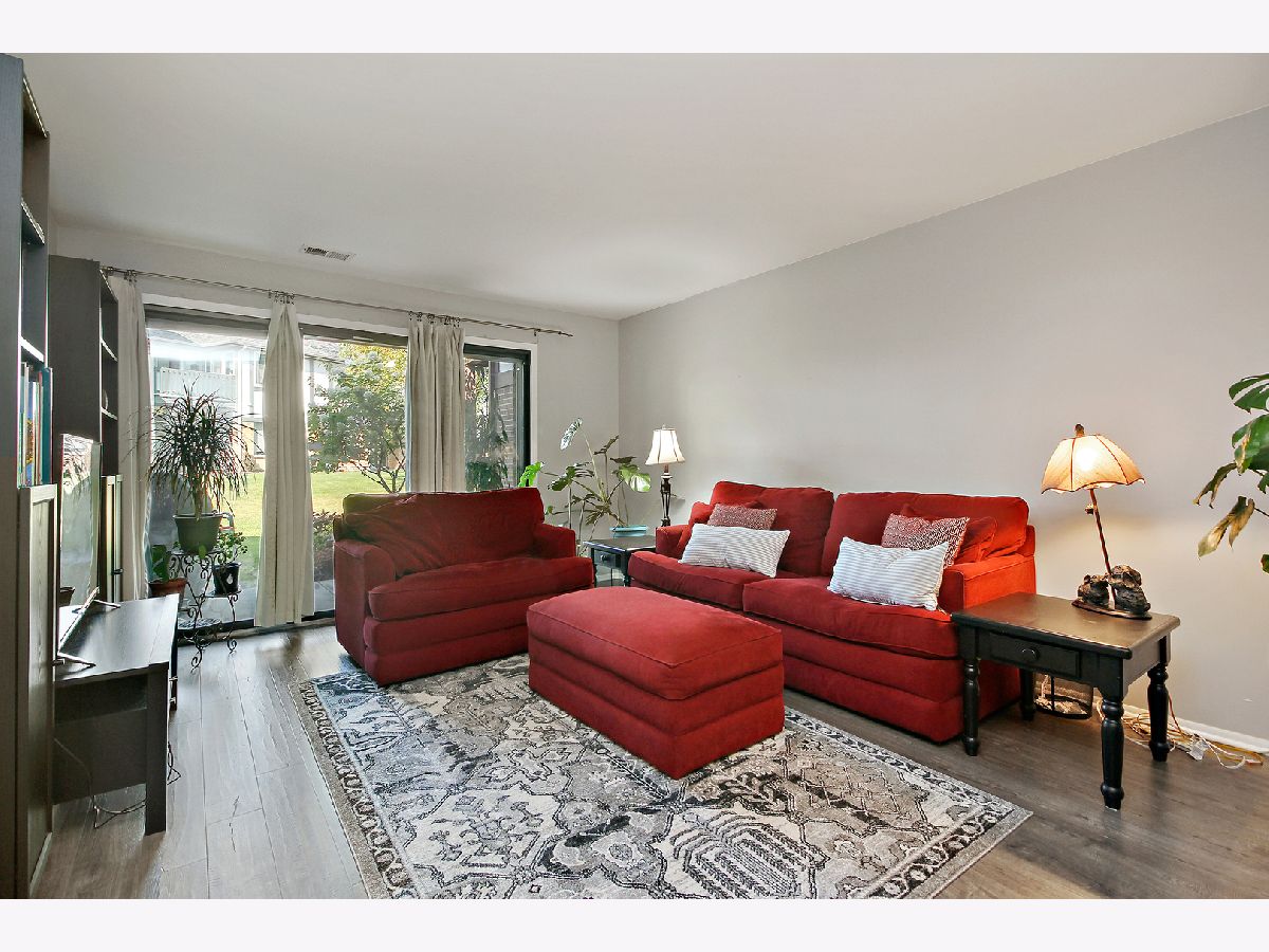 MOVE IN READY, THIS 1ST FLOOR HOME IS FRESHLY PAINTED HOME W/ SPACIOUS ROOMS, KITCHEN W/ STAINLESS APPLIANCES, NEWER CABINETS, LOT OF COUNTER SPACE AND BEAUTIFUL NEW WOOD LAMINATE FLOORING THRU OUT. LARGE MASTER BEDROOM WITH FULL BATH HAS ADDITIONAL VANITY W/ DRESSING AREA. ALL ROOMS HAVE NEW LAMINATE THRU OUT WITH THE EXCEPTION OF LAUNDRY ROOM. COVERED PATIO OVERLOOKS BEAUTIFUL GREEN SPACE FOR ENTERTAINING. IN UNIT LAUNDRY AND OVERSIZED ATTACHED GARAGE WITH STORAGE. COMMUNITY POOL, TENNIS COURTS AND PARKS! ONLY FOUR UNITS TO BUILDING. GREAT LOCATION, CLOSE TO SHOPPING,RESTAURANTS, TRAIN NO WATER BILL INCLUDED IN MONTHLY ASSOCIATION WITH BEAUTIFUL POOL FOR SUMMER FUN! 24 hr.notice required.