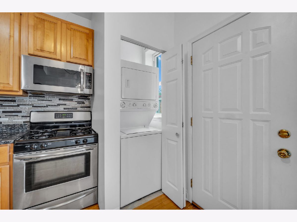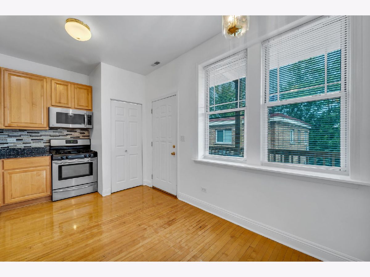 WOW! Welcome to this updated and bright TOP FLOOR unit in a beautiful red-brick building in Evanston. SANDED AND POLISHED HARDWOOD FLOORS THROUGHOUT! Light-filled living room with a cozy gas fireplace and views onto the tree-lined street. Updated, eat-in kitchen offers new stainless steel appliances, tiled back splash, granite countertops, plenty of storage and IN-UNIT WASHER/DRYER! Spacious bedroom and a well-maintained bathroom with mosaic title complete this charming unit. Freshly painted throughout! BRAND NEW DECK (2021) recently added! Central heat and air. Private storage unit included. Easy permit street parking along Brummel. WONDERFUL LOCATION - close to the Red Line, parks, shops, and many restaurants along Howard. Come make this your new home!