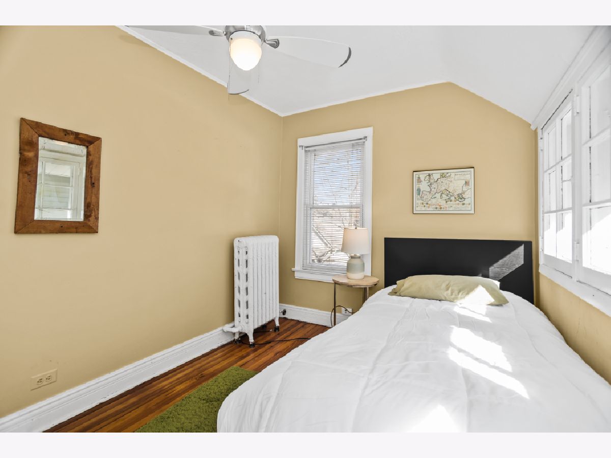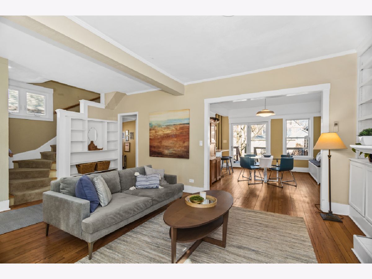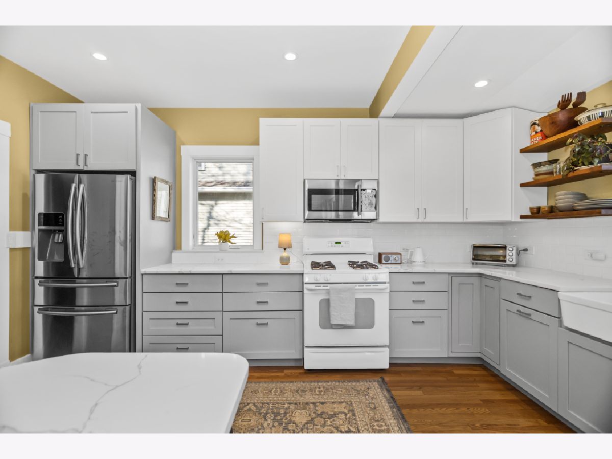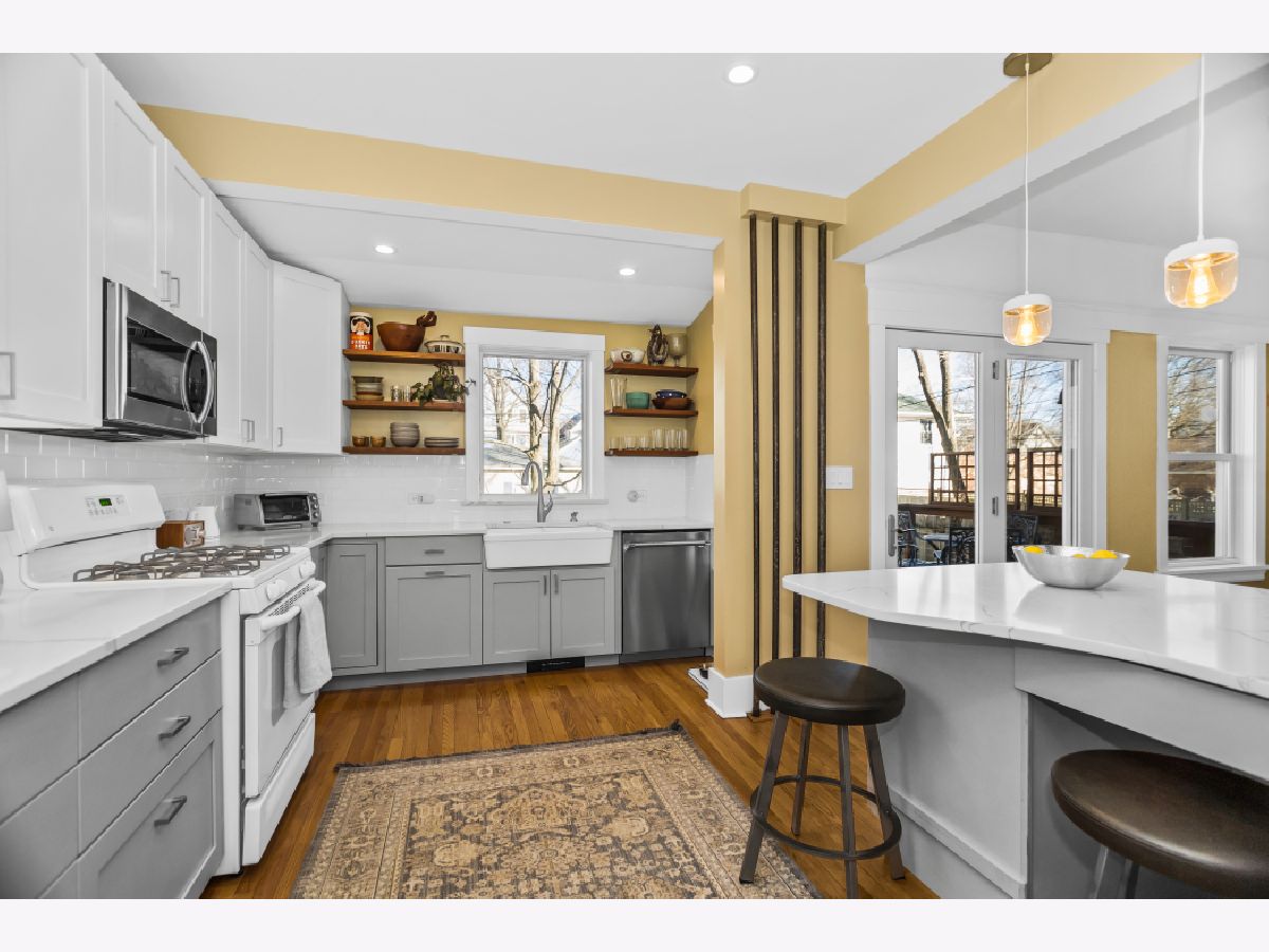 Welcome to this classic farmhouse in the heart of Evanston, within the sought-after Washington Elementary School district. A charming enclosed screened porch invites you inside, where the foyer showcases the original staircase and a spacious coat closet. The sun-filled living room features a beautiful bay window, a gas fireplace, and original built-in shelving, creating a warm and inviting gathering space. It flows seamlessly into the dining room, where French doors lead to a fantastic deck and expansive backyard-perfect for entertaining. The beautifully updated kitchen blends style and function with high-end cabinetry, quartz countertops, exposed brick, a breakfast bar, and stainless steel appliances. A convenient powder room completes the main level. Upstairs, the primary bedroom is bathed in natural light from skylights, enhancing its welcoming atmosphere. Three additional bedrooms and a full hall bath complete this level. The lower level expands the living space with a large family room, an office, and a laundry room with ample storage. Additional updates include a tear-off roof and siding (2020), a mini-split A/C system, upgraded electrical, and a 2.5-car garage (2013). Situated on an in-demand area, this home is conveniently located near Main Street Metra, the CTA Purple Line, Trader Joe's, Robert Crown Community Center and Library, and some of Evanston's most popular restaurants, shops, cafes, and Lee Street Beach. Offering the perfect blend of character, convenience and modern living.