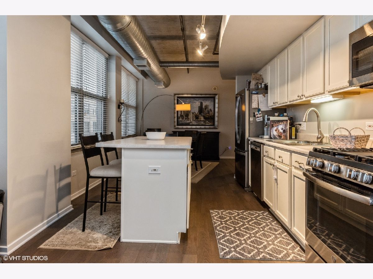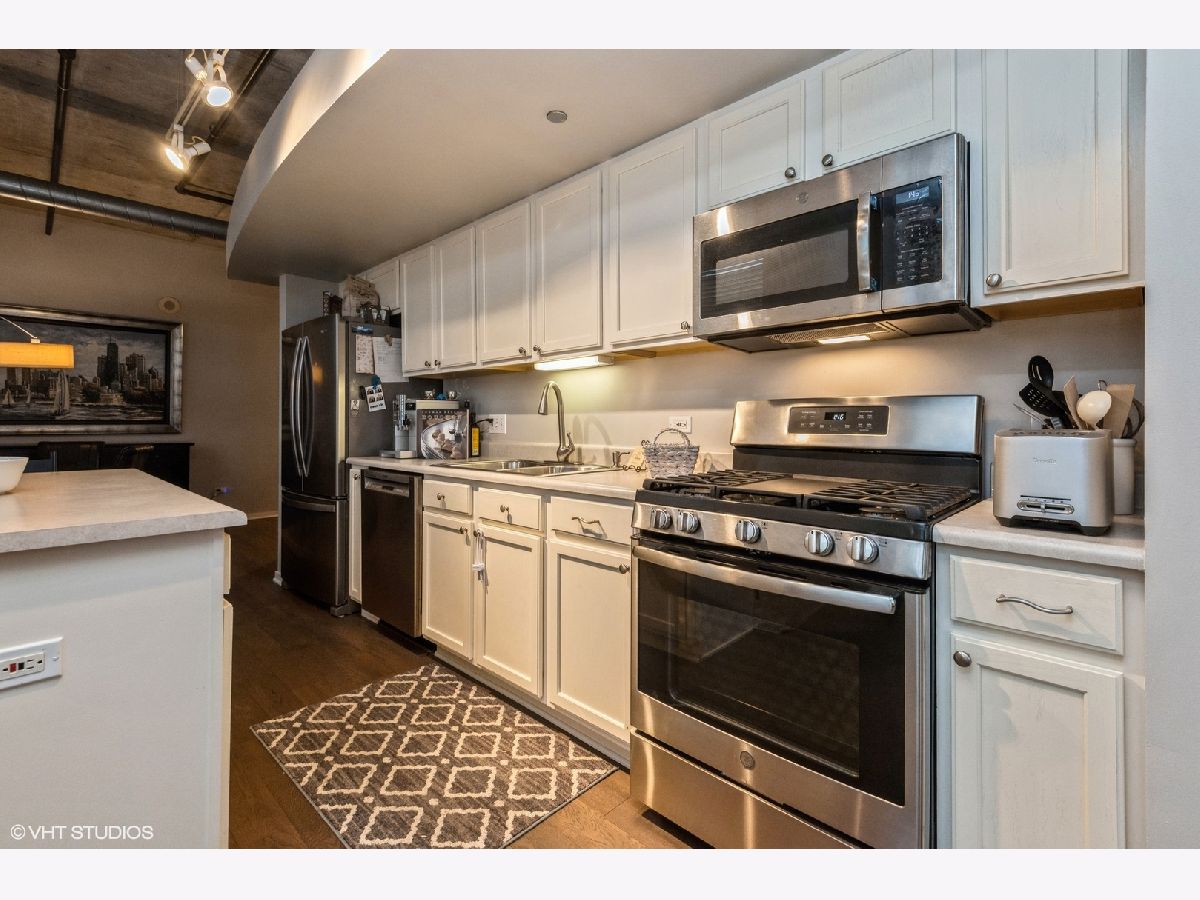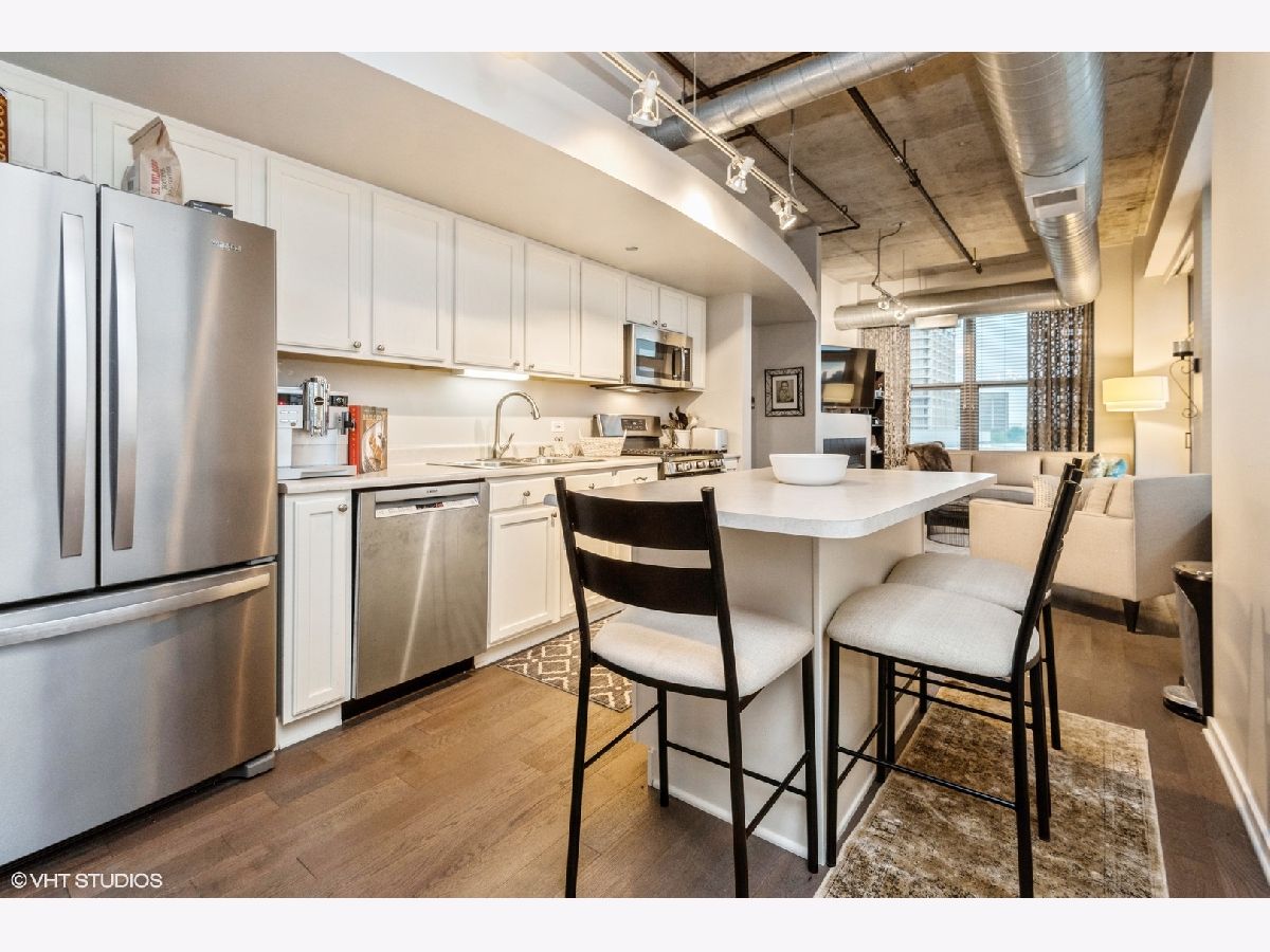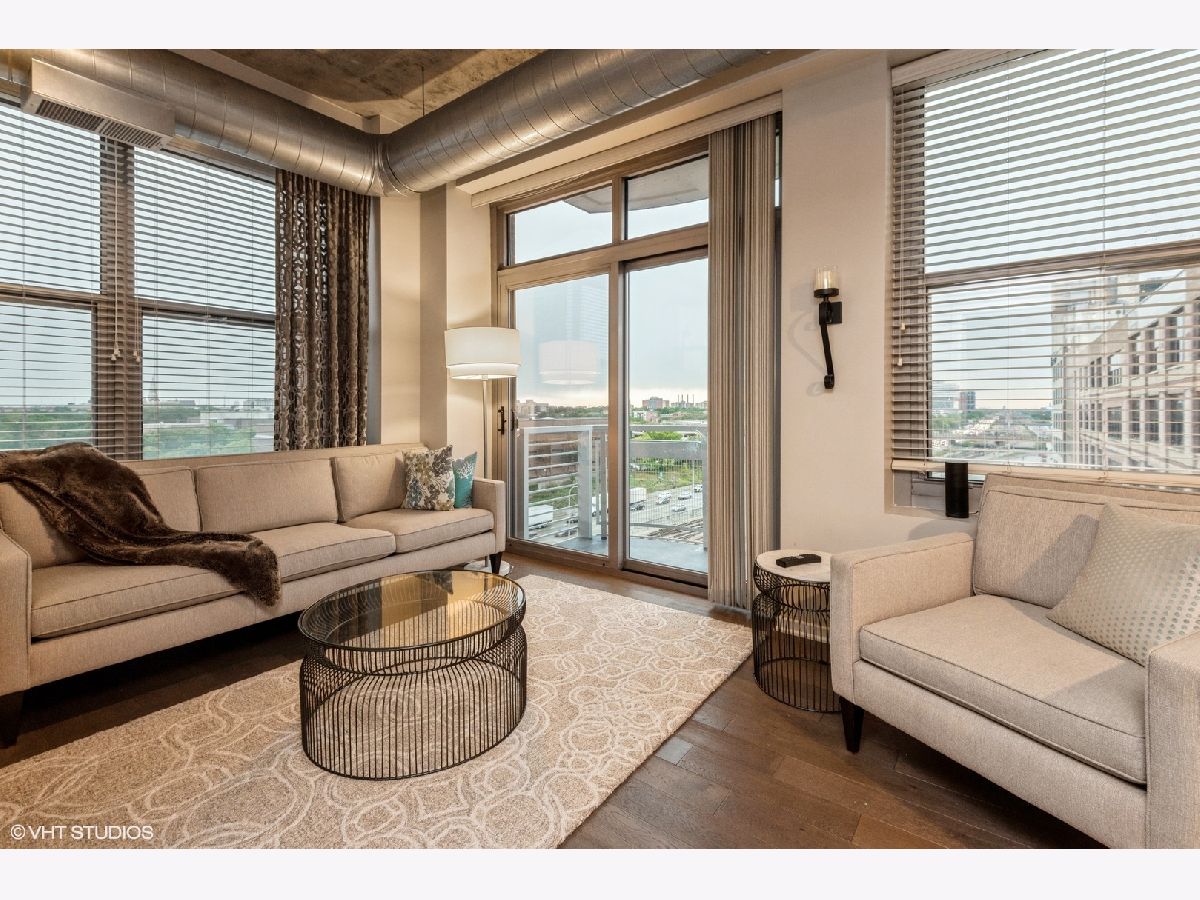 Impeccably maintained sunny corner home! This home offers newer wide plank hardwood floors, 2 fully enclosed spacious bedrooms, and a grand living room/dining room space for entertaining! Gas fireplace. Private balcony off living room. Newer (2018) stainless steel appliances including French door refrigerator and Bosch dishwasher. Huge kitchen island with breakfast bar. Primary suite includes walk in closet, accessory closet, and large bath with 4' shower. Newer washer/dryer. Huge entry closet. Prime end unit parking space P330 included. Fantastic 24-hr doorman building with gym, business center, book exchange, storage locker, press box cleaners. Beautiful rooftop deck with grills and furniture/landscaping. Close to Mary Bartelme Park, restaurants, shopping, transportation and highways!