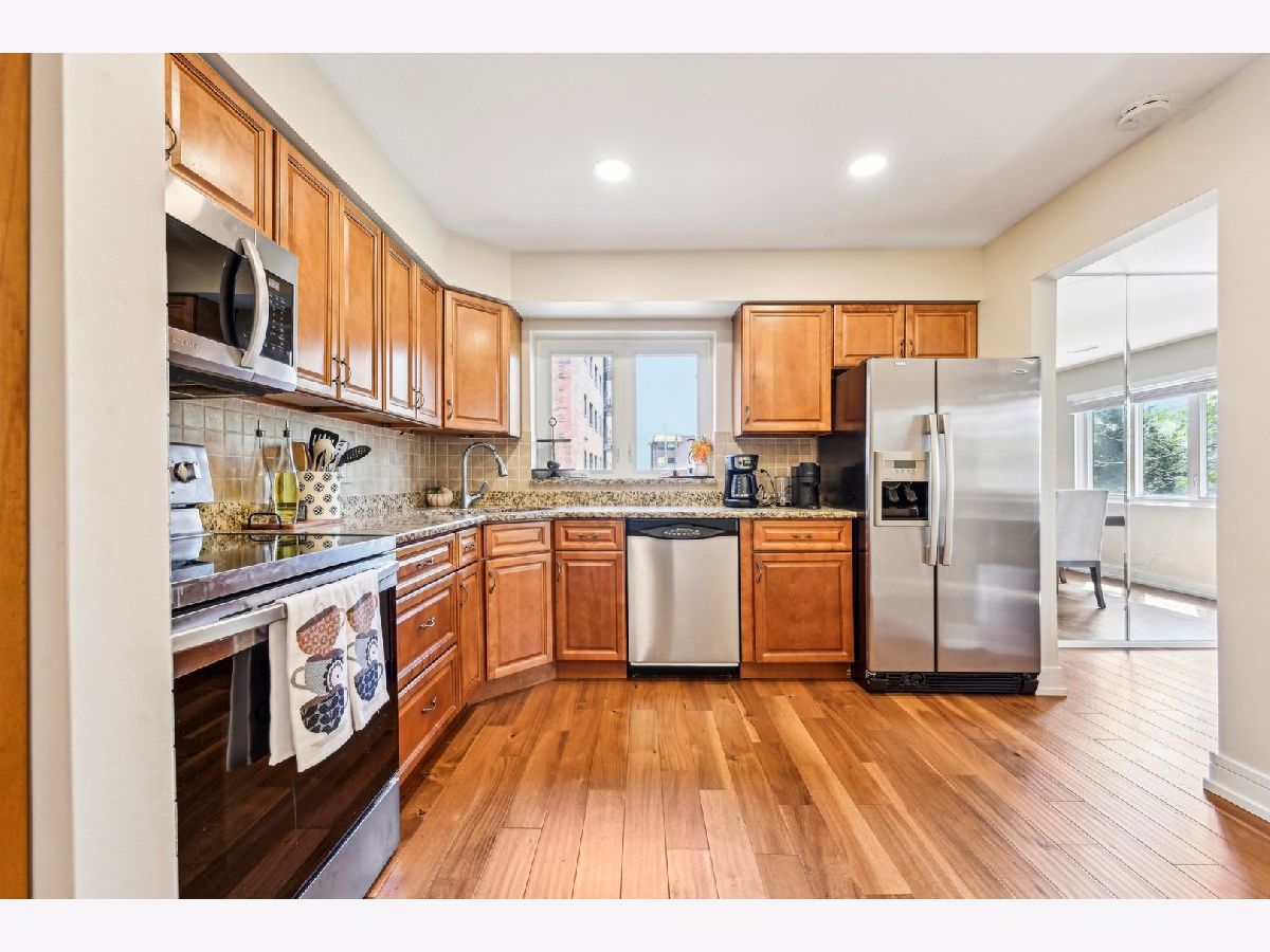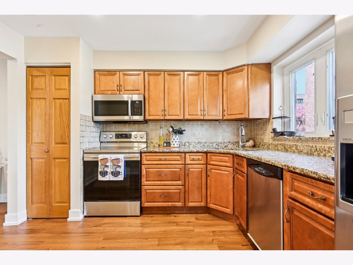 Welcome Home! A rare blend of thoughtful design, turnkey comfort, and resort-style amenities - all tucked inside a coveted gated community in Des Plaines. This freshly remodeled corner unit offers 2 bedrooms, 2 full baths, and over 1,400 square feet of beautifully updated living space. From the moment you enter, natural light pours into the expansive living room, where crisp engineered hardwood floors and modern recessed lighting create a warm, elevated atmosphere. The updated eat-in kitchen is both stylish and functional, featuring granite countertops, stainless steel appliances, and room for your favorite breakfast table. Just off the living area, a private balcony offers a peaceful spot to sip your morning coffee or unwind after work. The primary suite is a true retreat, featuring dual closets and a refreshed en-suite bath with clean, timeless finishes. A spacious second bedroom offers flexibility for guests, work-from-home, or anything your lifestyle demands. Every detail has been upgraded, including new baseboards, solid-core doors with sleek hardware, and designer light fixtures throughout. Enjoy the convenience of an elevator building, on-site laundry, and your own covered parking space. Beyond your door, The Landings community delivers unbeatable amenities: swimming pool, tennis courts, playground, clubhouse with fitness center, game room, kids' playroom, meeting room, ballroom, and a library. Located minutes from Advocate Lutheran General, Main East High School, I-294, Metra, Lurvey's Garden Center, and local shops and restaurants. MUST SEE!