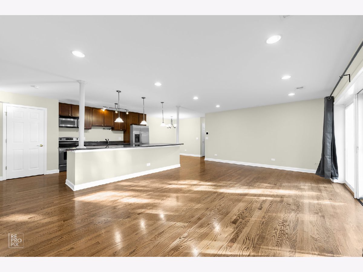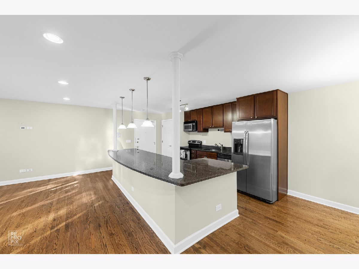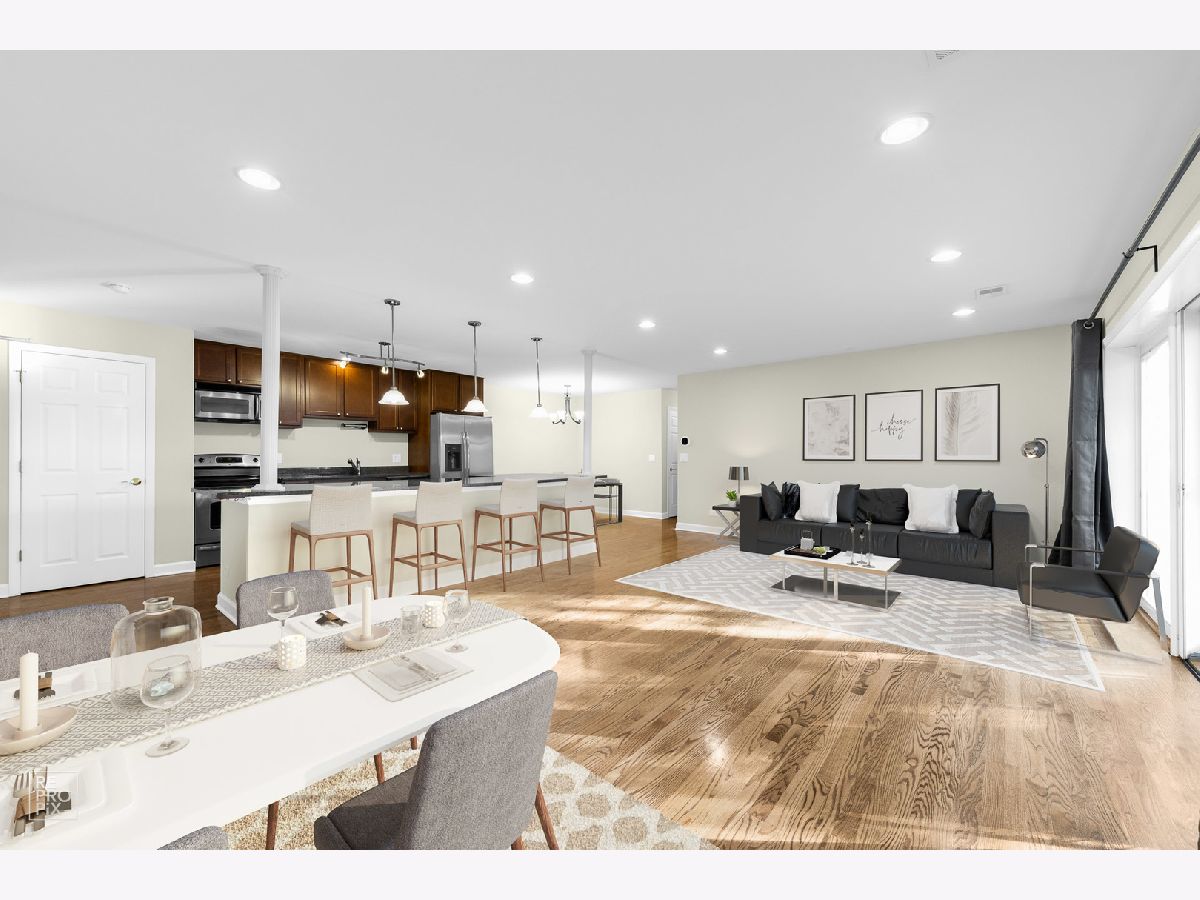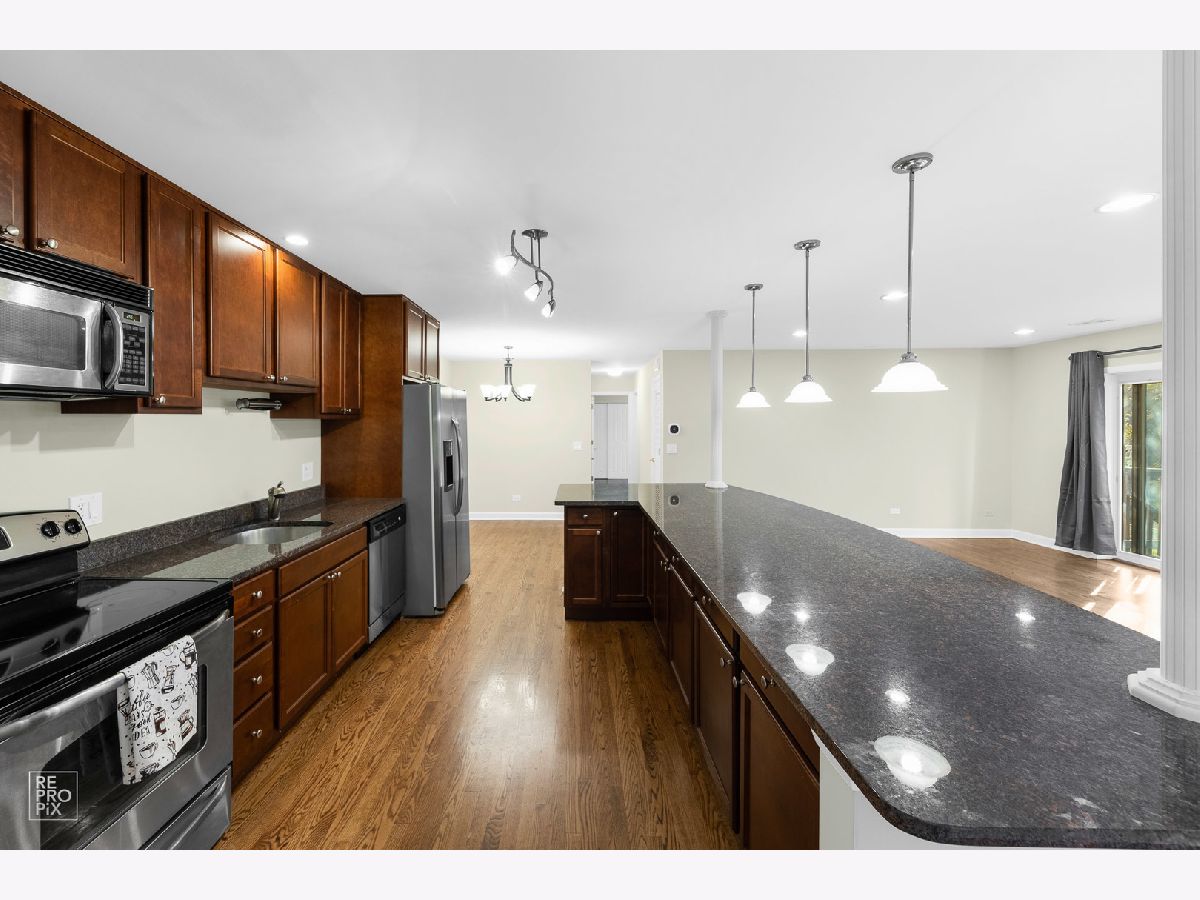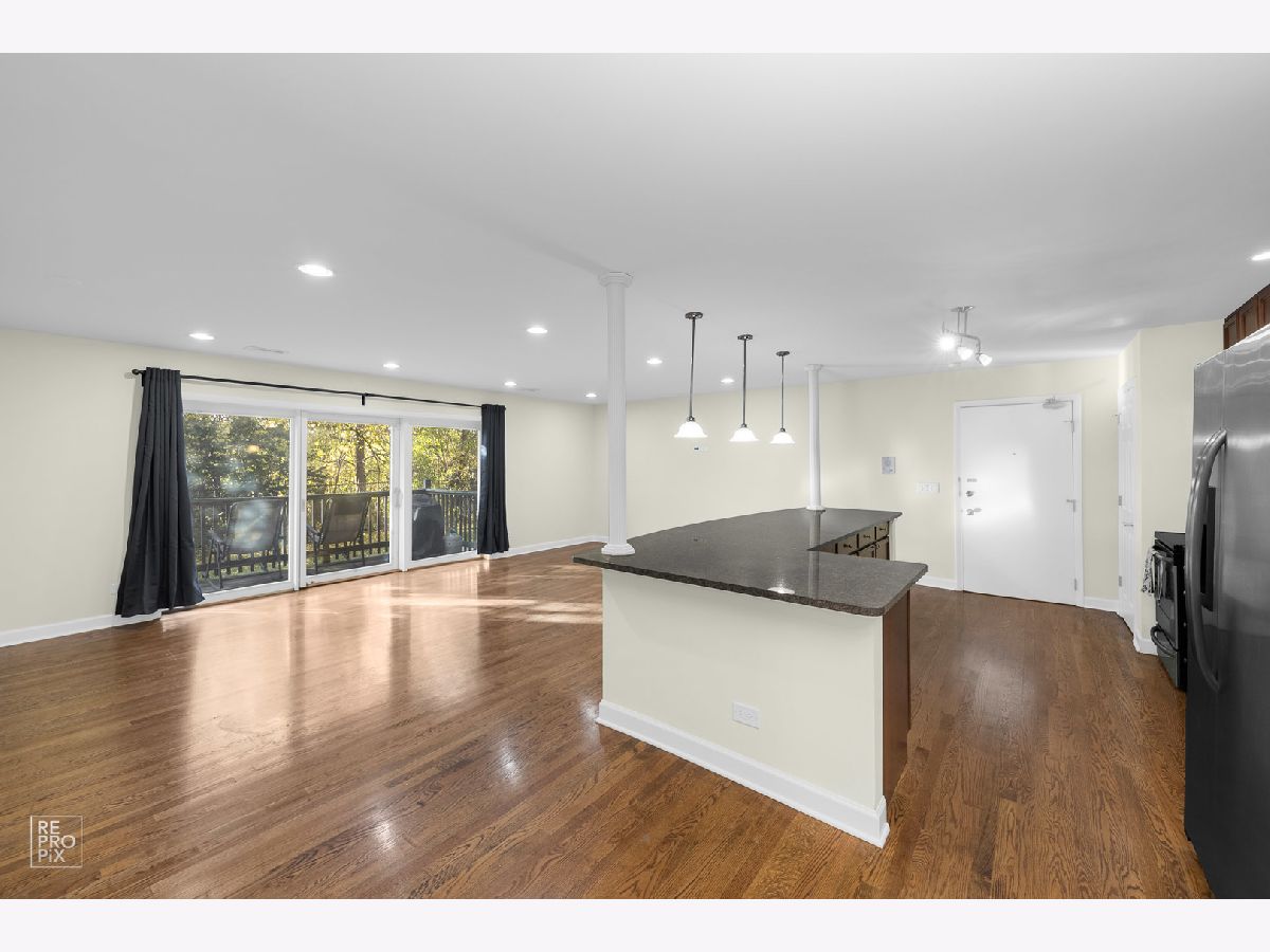 Spacious, sun-filled condo with an open floor plan. Expansive living room, hardwood floors throughout, recessed lighting, open kitchen with a huge island, granite countertops, and stainless steel appliances. Generous size bedrooms with ample closet space/organizers. Jacuzzi tub in guest bathroom. In-unit laundry in the main bathroom. Private deck leads to an outdoor space that feels like your own backyard! Freshly painted throughout. Smart thermostat and smart vents allow for individual temperature control in each room. The unit comes with a garage space and an external parking space. Extra storage in the basement. Convenient location away from the street and within 5 minutes' drive from the vibrant downtown Des Plaines with its shops, restaurants, public library, renovated Des Plaines Theater, and Metra station. Investor-friendly building. Don't miss out on this condo!