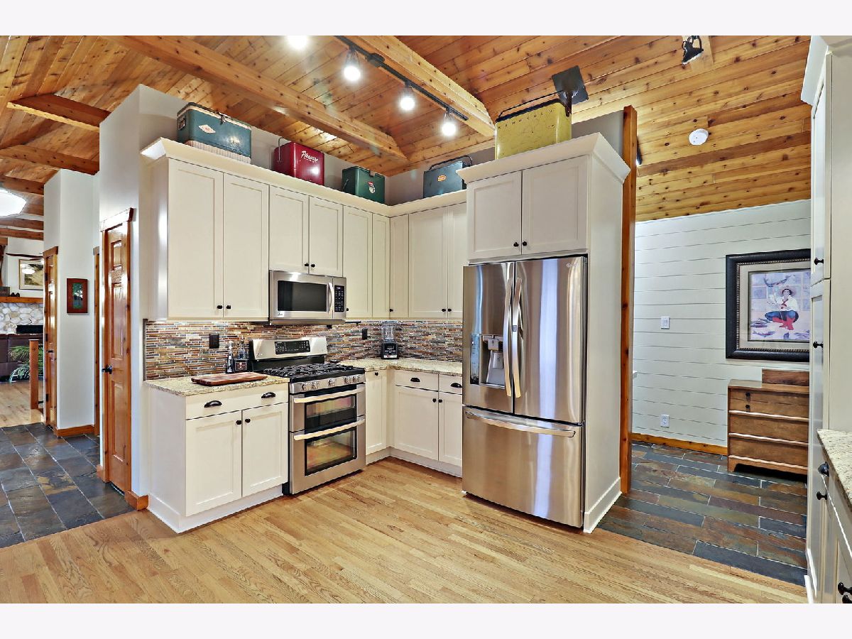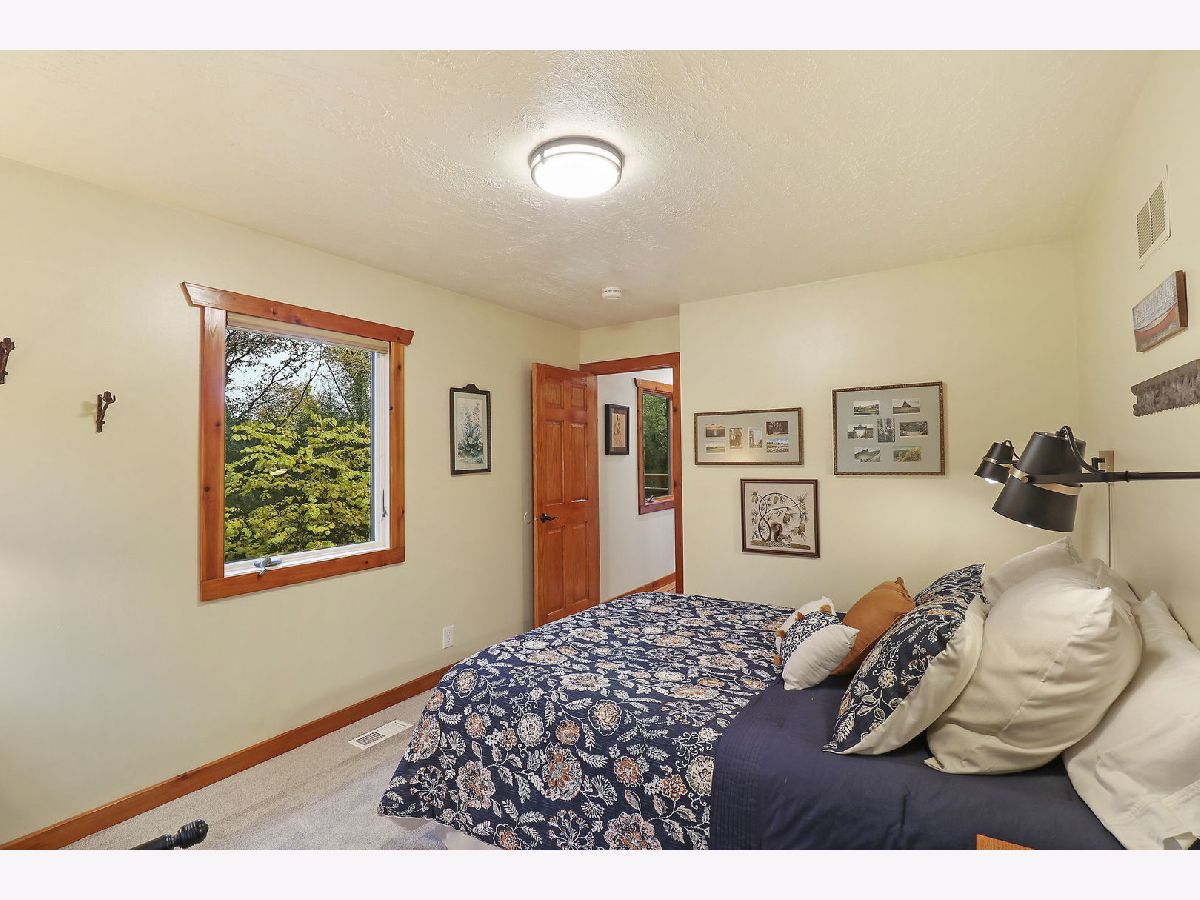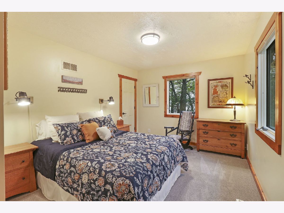 This Dunns Lake waterfront home is a hidden gem nestled in a serene, wooded setting. The centerpiece of the home is its magnificent great room, where a grand marble fireplace with a custom mantel and rustic beams invites cozy gatherings and warmth on chilly evenings. Floor-to-ceiling windows frame breathtaking views of both the serene lake and the surrounding woods. The great room provides access to both front and back decks and patio, offering seamless indoor-outdoor living and entertaining spaces. The kitchen is tastefully appointed with a welcoming breakfast bar, granite, and an abundance of cabinets and counter space for culinary creativity. Custom pull-out drawers in the pantry ensure organization and accessibility. A separate dining room with lake views is sure to impress your guests. The main floor primary bedroom reigns supreme with its stunning lake views and vaulted ceiling that add a sense of airiness and luxury to the room. You will also appreciate the custom walk-in closet and door that opens onto the deck. The bathroom is a true sanctuary, boasting features that exude opulence and attention to detail. Two custom vanities are equipped with drawer dividers and under-cabinet lighting. The walk-in shower features two shower heads for a spa-like experience, while a soaking tub allows you to unwind with the most breathtaking views. The heated bathroom floors will keep you comfortable. The main level also houses the laundry room, 2nd full bath, 2nd bedroom and office with cherry butcher block counter and custom shelving. The English basement offers a family room with a quaint bar, creating the perfect space for relaxation and entertaining. You will also find 3 additional bedrooms, each with spacious closets and organizers for efficient storage, and a full bath with two custom sinks and a walk-in shower. For the DIY enthusiast, there's an amazingly well-thought-out and organized workshop with 240 power source. Storage is never a problem, as there is a dedicated storage room to keep everything tidy and accessible. This home sits on 97 ft. of Dunns Lake shoreline, allowing you to enjoy the water at your doorstep. A lakeside fire pit provides a cozy spot for gatherings and s'mores.