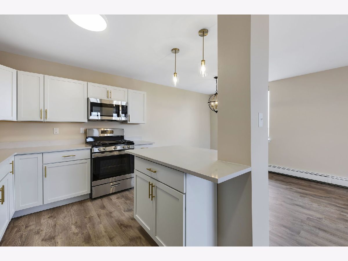 Newly renovated and updated throughout. Penthouse level 2 bedroom, 1.5 bathroom elevator building corner condo unit features both north and east views. Updated kitchen with plenty of quartz counter and cabinet space, island open to dining and large spacious and abundant natural light living room. Two sizable bedrooms - primary with walk in closet through sliding barn door and private 1/2 bath. Both bathrooms fully updated - vanities, toilets, white epoxy tub & tile. New LVT hard surface flooring throughout; fresh neutral paint and white trim & doors throughout; new lighting, door hardware, kitchen and bath hardware throughout. Stylish coffee/wine/entertainment built floating cabinets feature undermount accent lighting. All windows feature weighted fabric vertical blinds. Storage locker and trash chute on unit level; large common laundry in basement