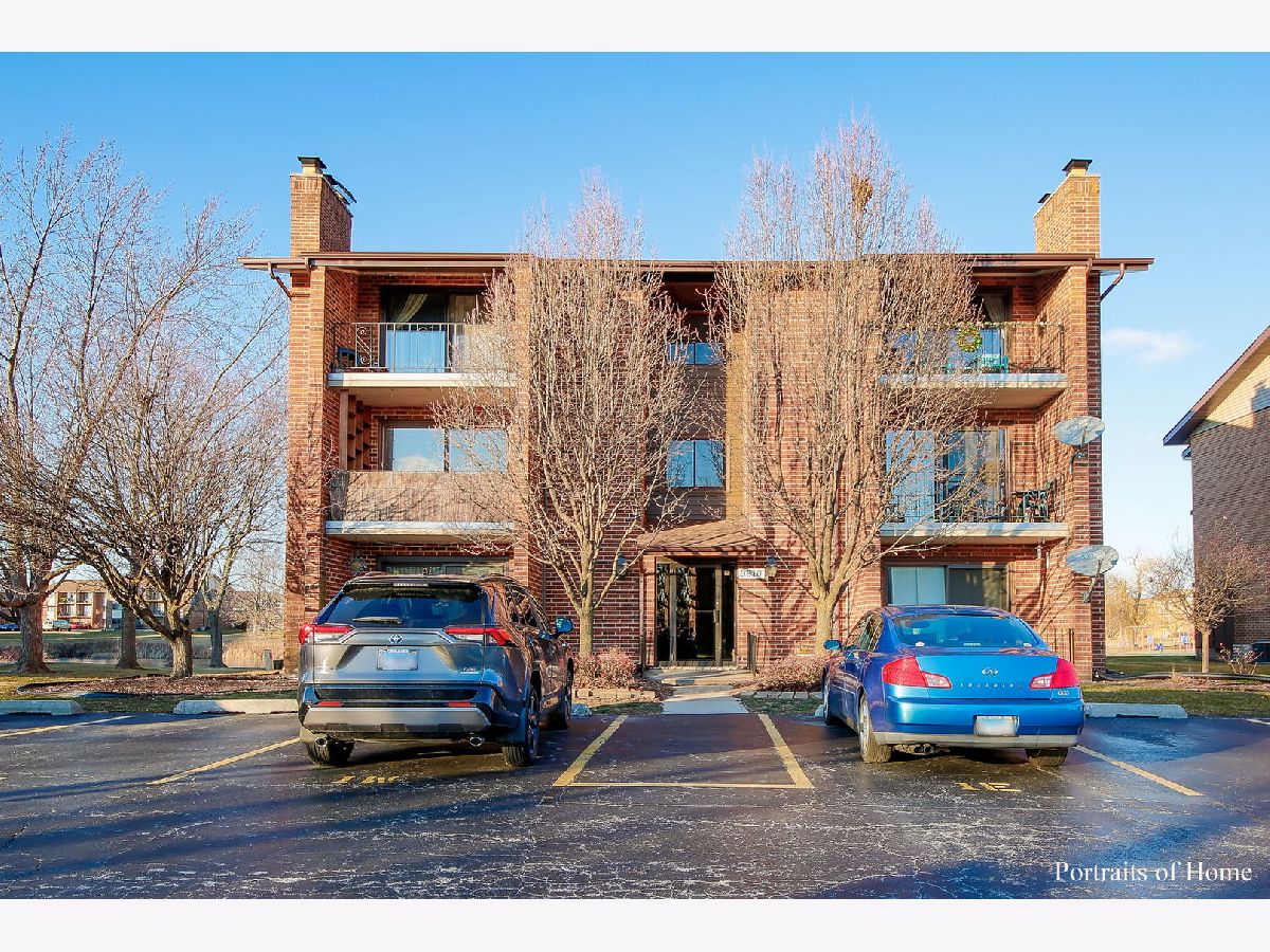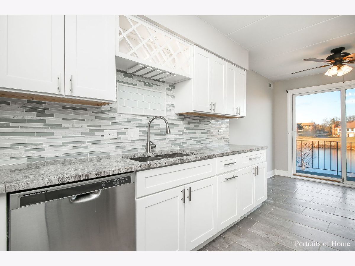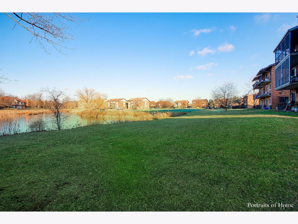 Beautifully updated 2 bedroom 2 bath condo that backs to the pond! White trim and 6 panel doors throughout. Wainscoting in the living room, dining room and 2nd bedroom make this unit so special! The eat-in kitchen is updated with gorgeous white cabinetry, wine rack, granite counters, SS appliances and a lovely water view! The very spacious living room offers a wood burning fireplace and a SGD that opens to the front balcony where you have a custom oak plant stand. Both bathrooms have been updated as well! Newer flooring throughout the condo. The stackable washer and dryer are only 2 years old! The back balcony is huge- 4 1/2' x 19". Great spot for outdoor eating and enjoying the peaceful view of the pond and playground. Perfect location within walking distance of Centennial Park, Orland Park Health and Fitness Center and MORE! This unit will NOT last long!!