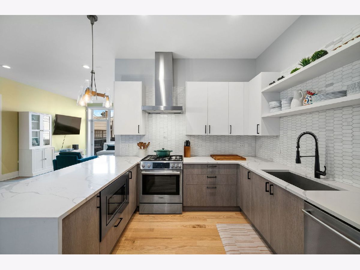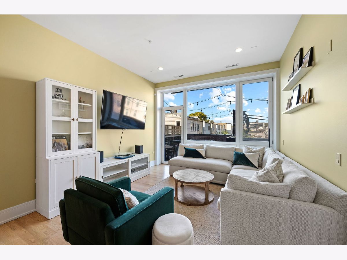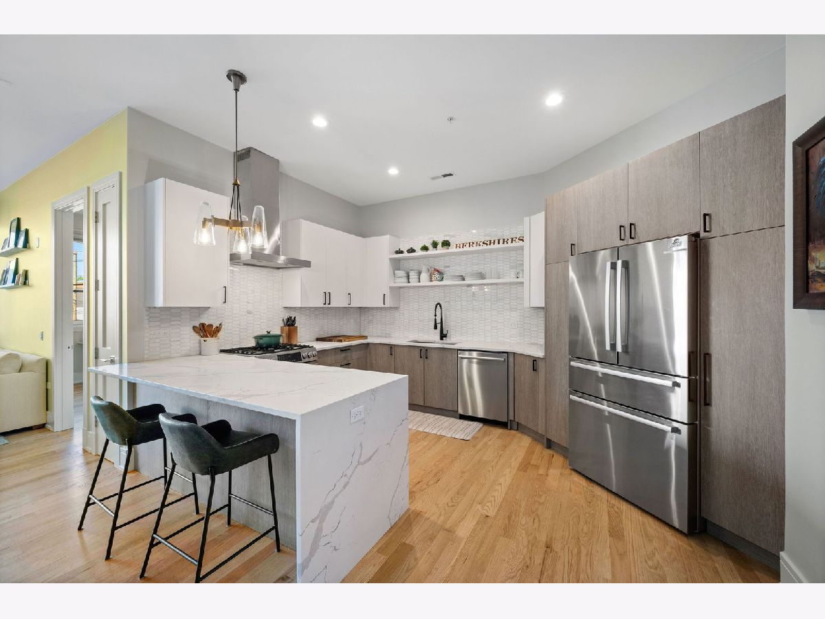 A perfect floorplan in The Milford on the backside of the building with an amazing outdoor space- right off your living room! This 3 bedroom, 2 bathroom home in a boutique elevator building is in the best location in Avondale. Open floor plan single floor condo living with large open white kitchen with quartz counters, stainless appliances and lovely open shelving. Sit at the bar or in your dining space! Generous living room with huge window opens to your huge private outdoor space. This doubles your living space in the warm months! Primary suite has a large walk in closet and a spa-like primary bath with double vanity, oversized walk-in shower, steam and multiple shower heads. The third bedroom space is large enough for office and additional living or bedroom! One attached garage space with EV charging. The Milford itself is topped with a 3,000SF common porcelain paver roof terrace with stunning downtown and skyline views. Walk to Avondale Bowl, Warlord, Central Park Bar, Mothers Ruin, Lake Effect Brewery and a quick skip to Logan Square.