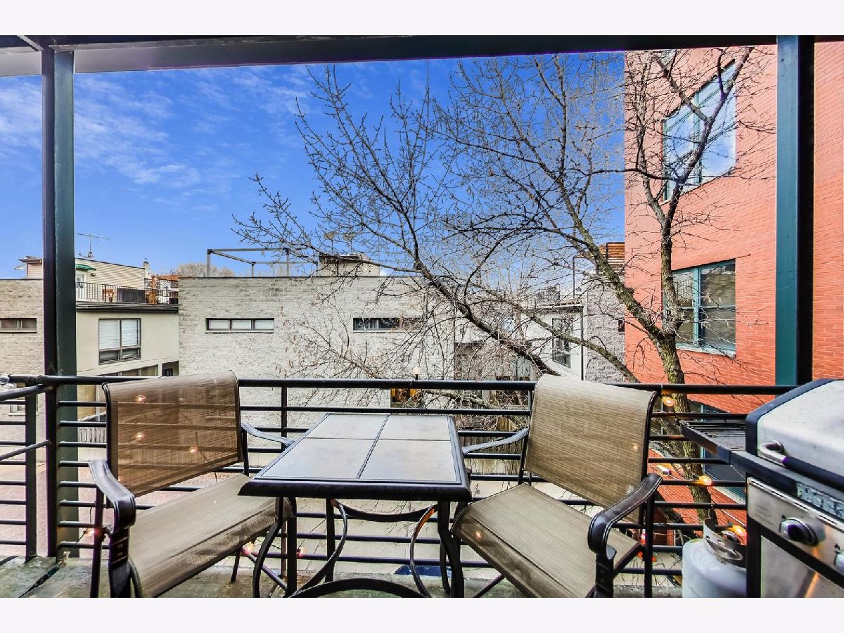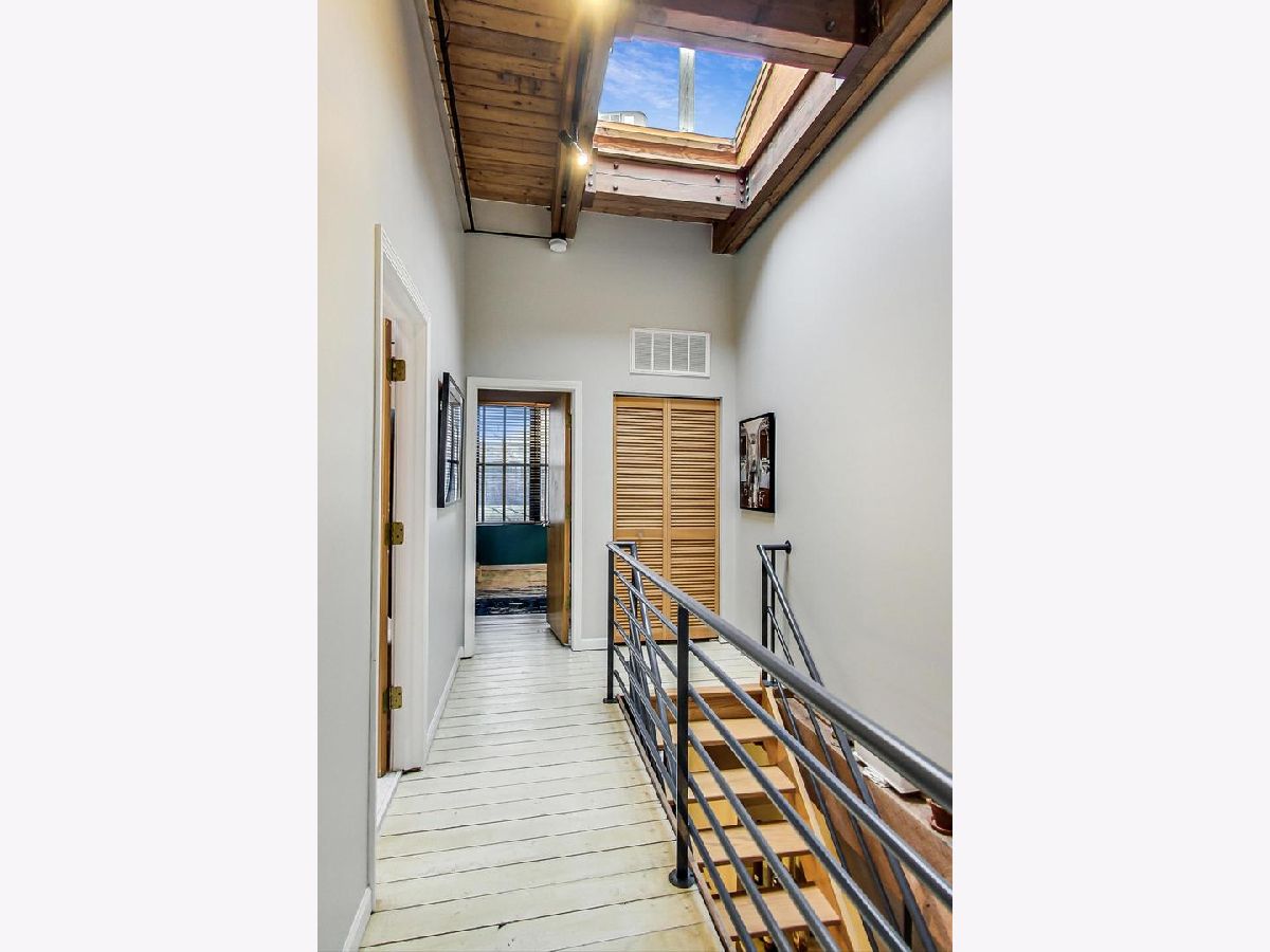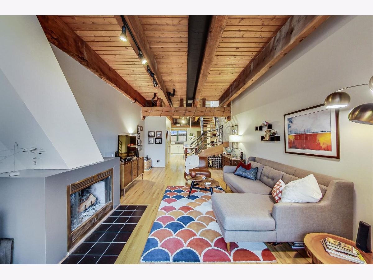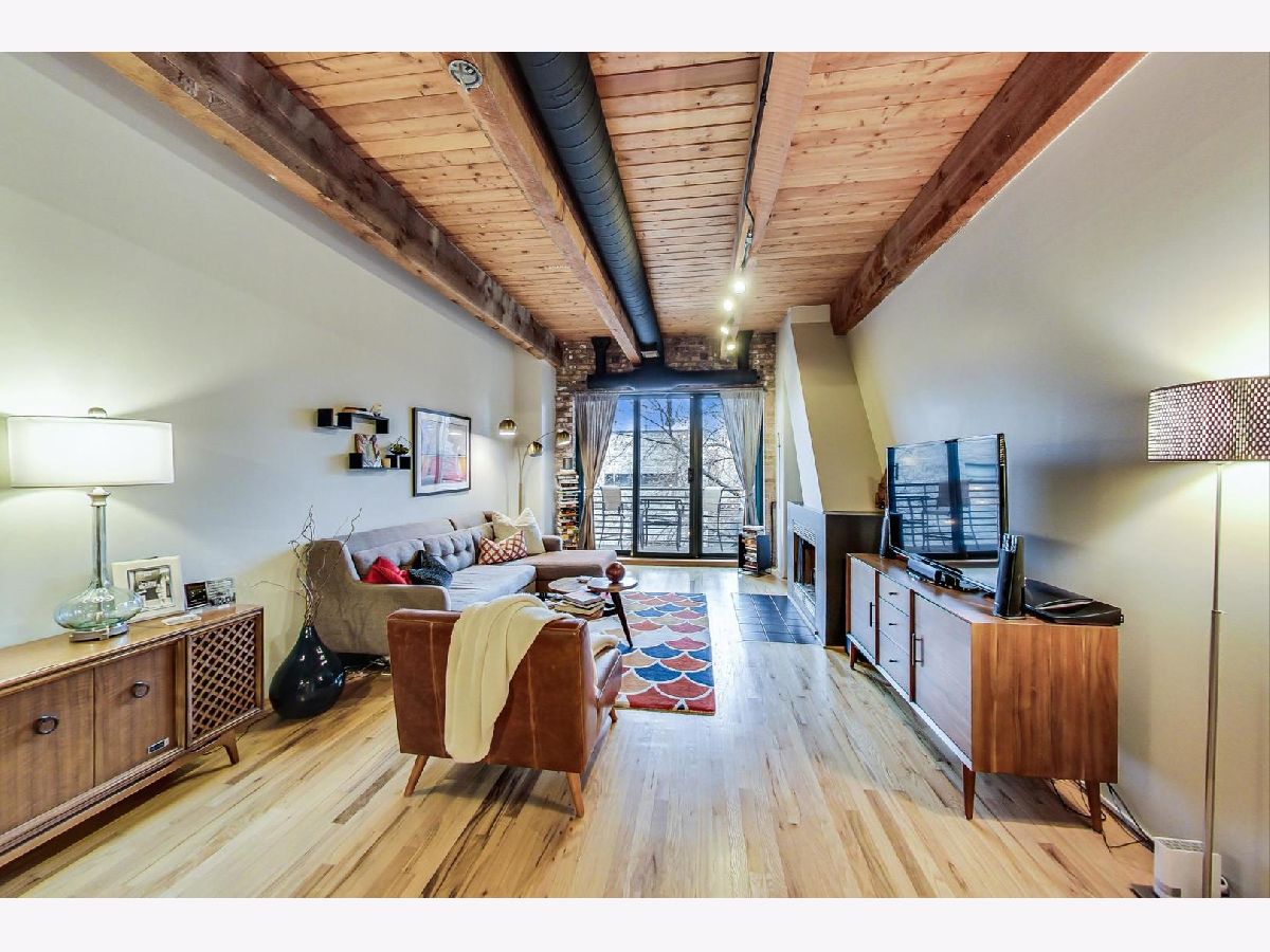 Smartly renovated top floor duplex up timber loft in prime Bucktown location. The unit features soaring ceilings, exposed brick, and hardwood floors throughout, in addition to 2 private balconies. Open concept living space with a floating staircase is perfect for entertaining or relaxing by the wood burning fireplace. Kitchen features white cabinets, newer stainless appliances and grey quartz countertops. Additional matching built-ins on the opposite wall are a perfect use of space and ideal for entry way or pantry storage. Vintage industrial pendant lights frame out an ideal space for a dining table or kitchen island. The second level features split floor plan bedrooms and an updated, spacious bathroom with double vanities, linen closet, skylight and dual entry. Primary bedroom boasts a custom built out walk-in closet with additional storage above. The second bedroom, large enough to fit a queen bed as well as a desk for an office space, is also outfitted with a custom closet build out. Also included are two parking spots - one attached garage spot with additional storage + one exterior parking pad just outside the garage. Run, walk or bike on the award-winning 606 Trail and enjoy the newly upgraded Walsh Park featuring green space, an athletic field, a playground, community garden, and dog park. Just a quick stroll to the Blue Line, Clybourn Metra, and all the restaurants, shops and nightlife that Bucktown has to offer.