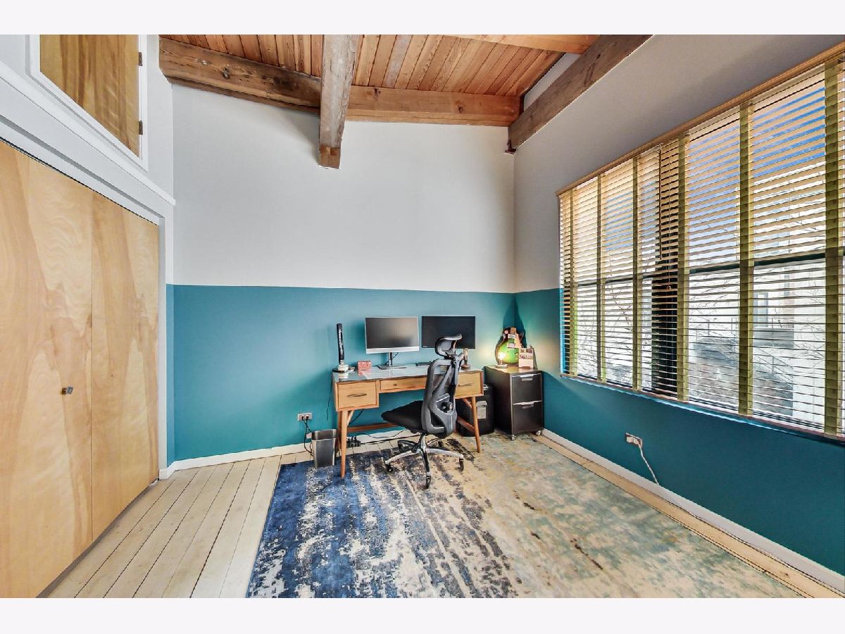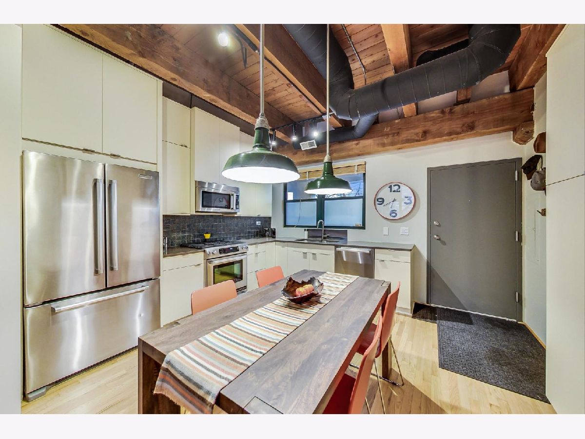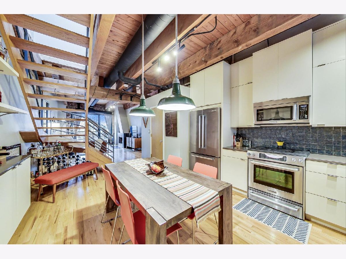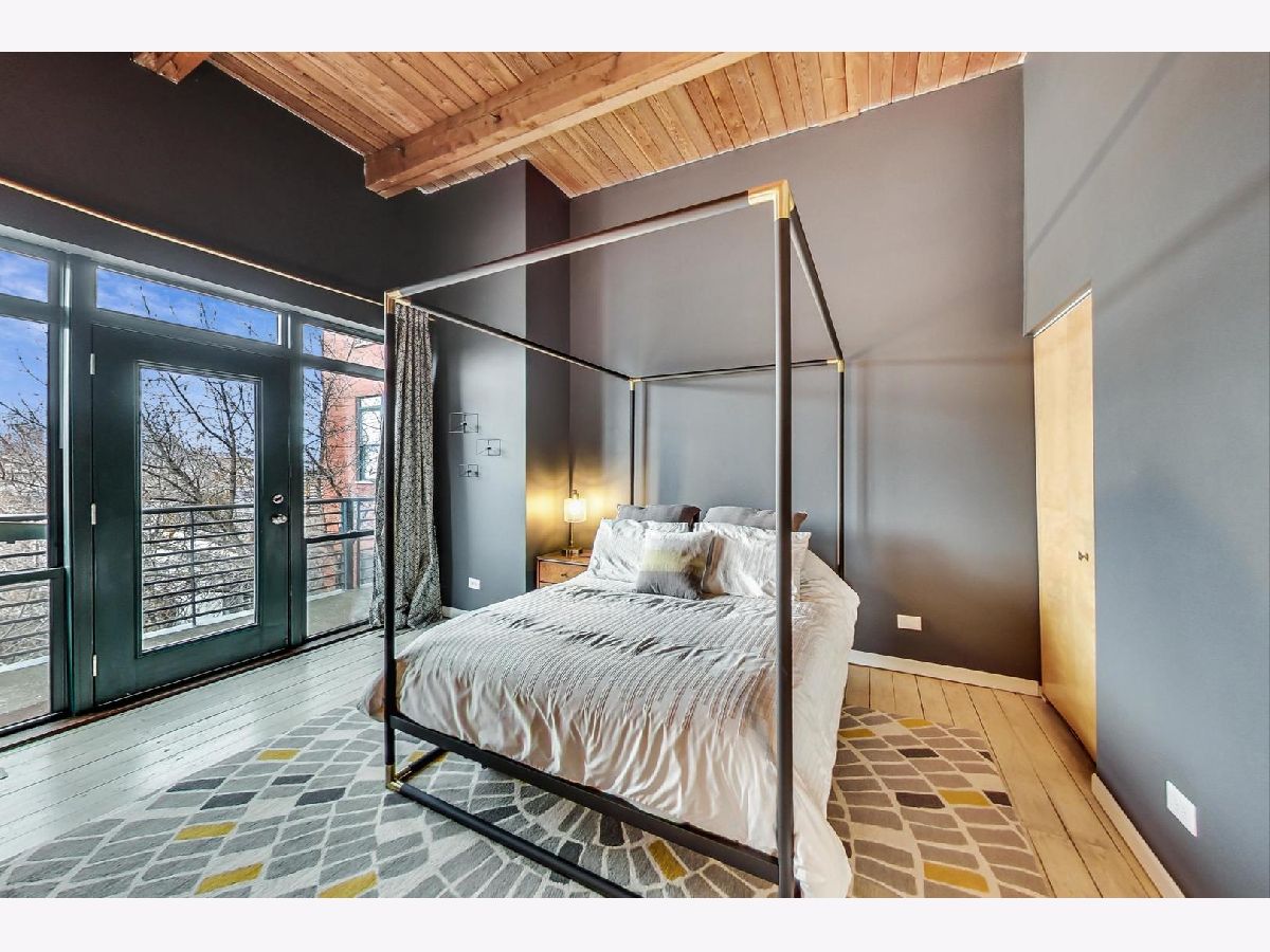 Smartly renovated top floor duplex up timber loft in prime Bucktown location. The unit features soaring ceilings, exposed brick, and hardwood floors throughout, in addition to 2 private balconies. Open concept living space with a floating staircase is perfect for entertaining or relaxing by the wood burning fireplace. Kitchen features white cabinets, newer stainless appliances and grey quartz countertops. Additional matching built-ins on the opposite wall are a perfect use of space and ideal for entry way or pantry storage. Vintage industrial pendant lights frame out an ideal space for a dining table or kitchen island. The second level features split floor plan bedrooms and an updated, spacious bathroom with double vanities, linen closet, skylight and dual entry. Primary bedroom boasts a custom built out walk-in closet with additional storage above. The second bedroom, large enough to fit a queen bed as well as a desk for an office space, is also outfitted with a custom closet build out. Also included are two parking spots - one attached garage spot with additional storage + one exterior parking pad just outside the garage. Run, walk or bike on the award-winning 606 Trail and enjoy the newly upgraded Walsh Park featuring green space, an athletic field, a playground, community garden, and dog park. Just a quick stroll to the Blue Line, Clybourn Metra, and all the restaurants, shops and nightlife that Bucktown has to offer.